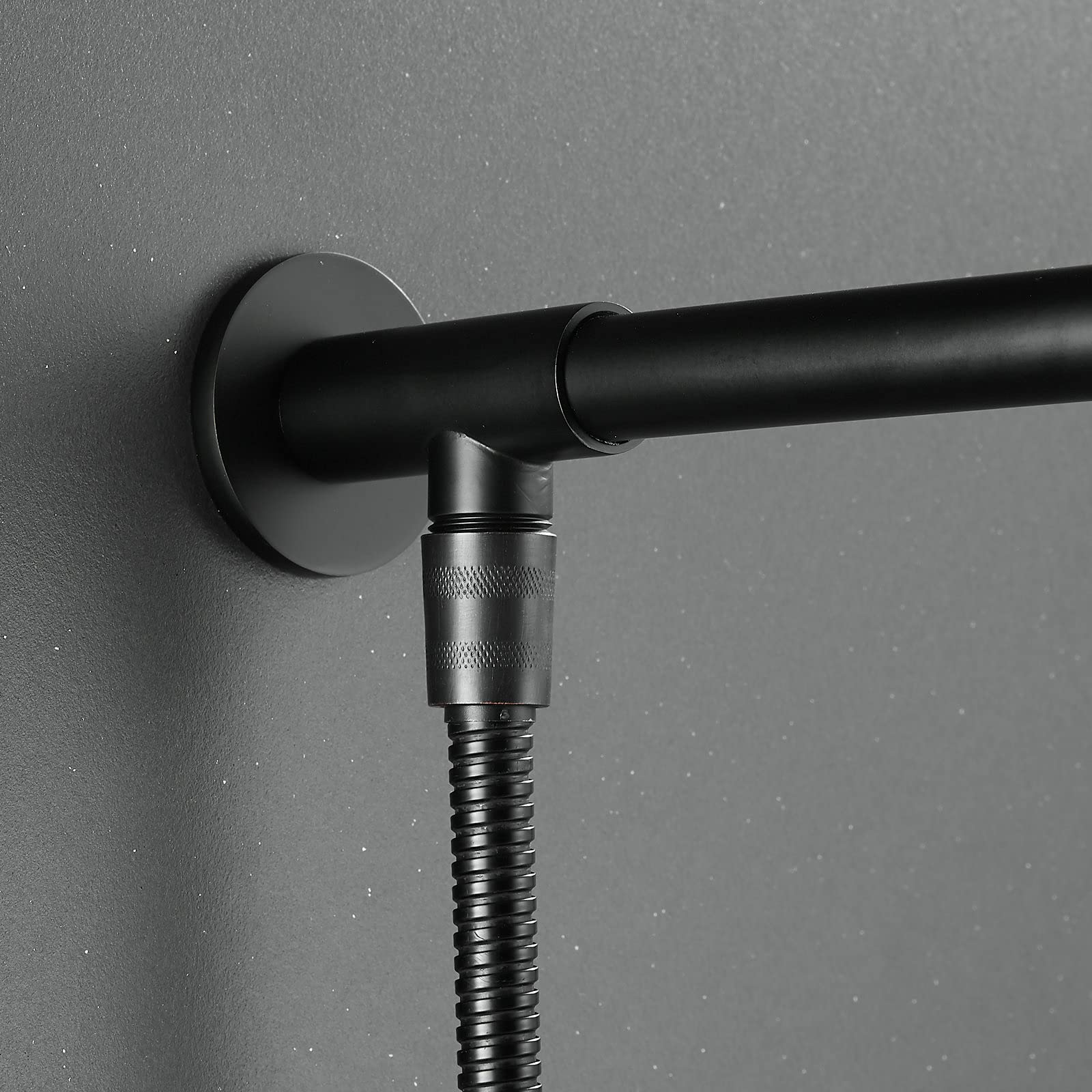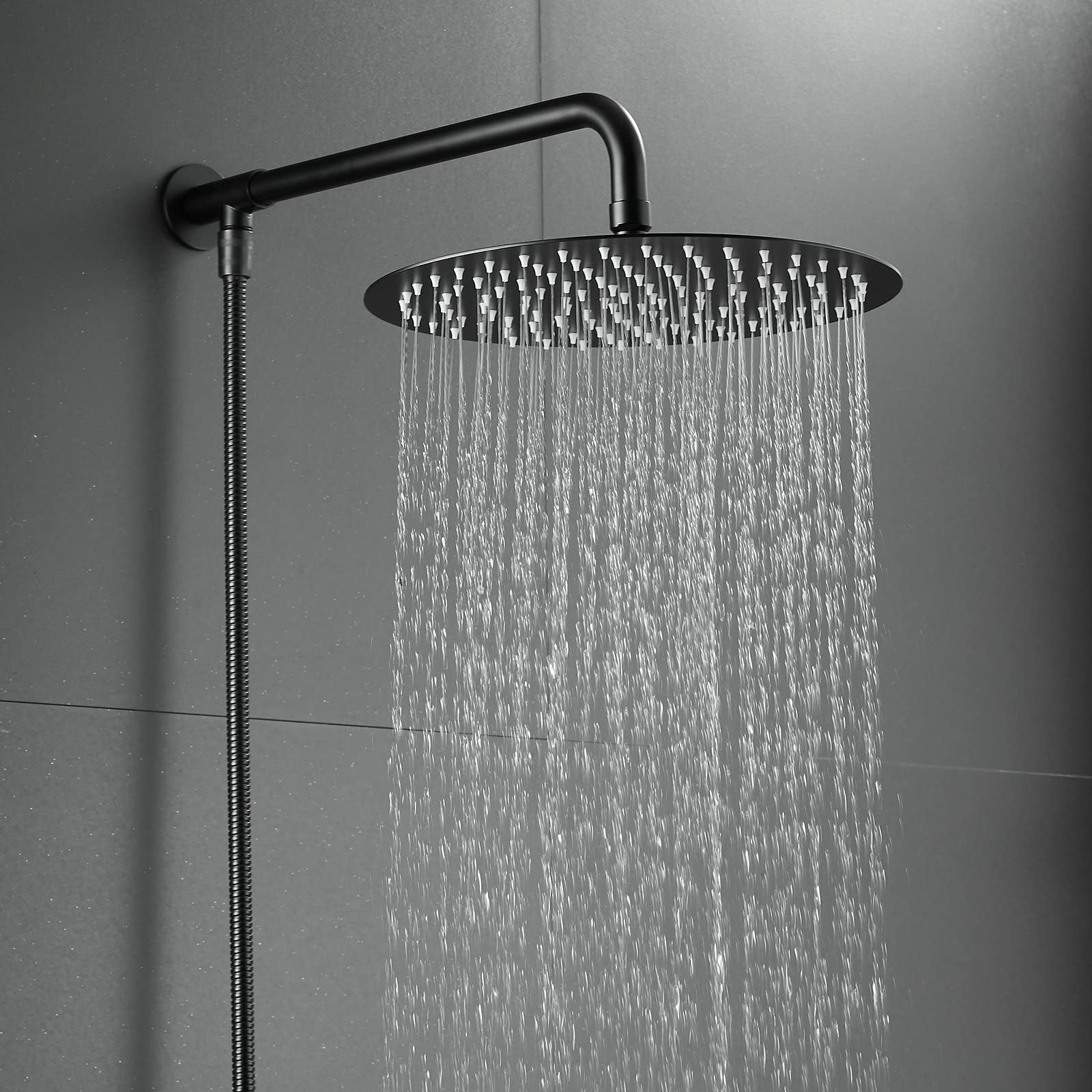 ["High-Pressure Rain Shower Head with High Flow: The rain shower head is optimized for both low and high water pressure, providing effortlessly superior, compact, and powerful performance for the ultimate shower experience.","Luxury Shower Head Design: 10-inch large and 0.08-inch thick, extra thin rain shower head with swivel ball joint, allowing you to adjust and secure at any angle.","Sleek Design: Made of solid brass with beautiful black finish, durability and scratch prevention.","Easy-to-Clean Nozzle: The soft silicone nozzles prevent the formation of lime deposits for maintenance-free enjoyment, are clog-resistant, easy to clean, and durable enough to withstand high temperatures.","Package Contents: 1 * fixed shower head; 1 * shower arm (16 inches); 1 * shower hose (59 inches)"]