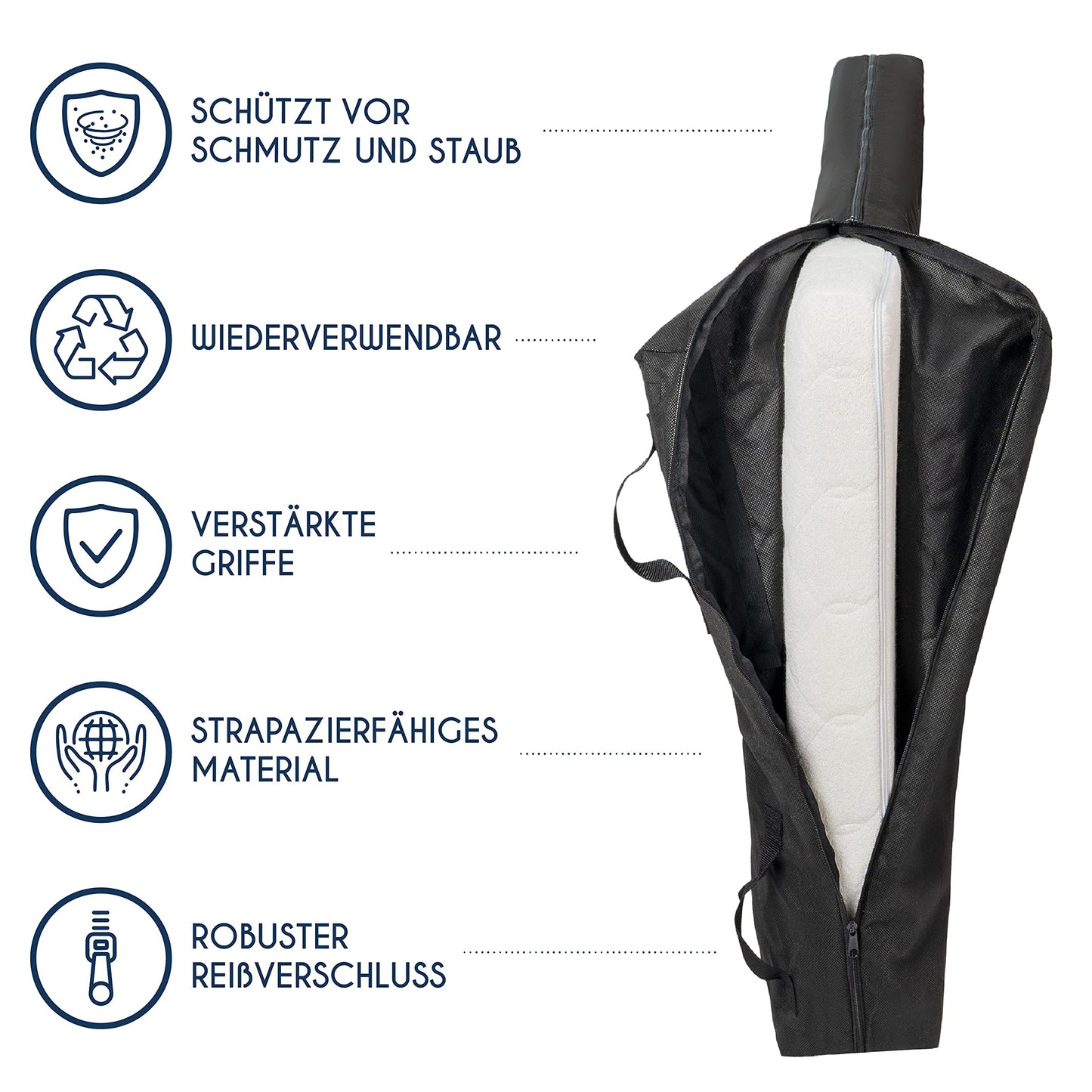 ["MOVE WITHOUT WORRY - Moving can be stressful and hectic, often leading to accidents like dropping a mattress in the stairwell and getting it dirty ... With our mattress protection covers, these problems are a thing of the past. 80 X 200 (Thickness 25 cm) refers to the size of the mattress, the cover dimensions may vary slightly to fit better on the pillow.","IDEAL FOR YOUR MATTRESS AND THE ENVIRONMENT - To ensure effective protection for your mattress, each mattress protector is made of 100% polypropylene. It is reusable and 100 times more biodegradable than alternatives made from other plastic materials.","PRACTICAL AND USER-FRIENDLY - The protective cover makes your life easier: With its 3-sided zippered opening, the mattress cover can be quickly put on, and thanks to the sturdy handles, you can easily transport the mattress.","IDEAL FOR MATTRESS STORAGE - The mattress storage bag is designed for long-term storage in the basement or attic: The material is durable, insulating, and protects your mattress from water, insects, or other unpleasantness.","WITHOUT CHEMICALS - While you don't sleep directly on it, since our mattress protector tightly encases your mattress, we place great emphasis on a chemical-free manufacturing process, certified by the independent testing institute OEKO TEX."]