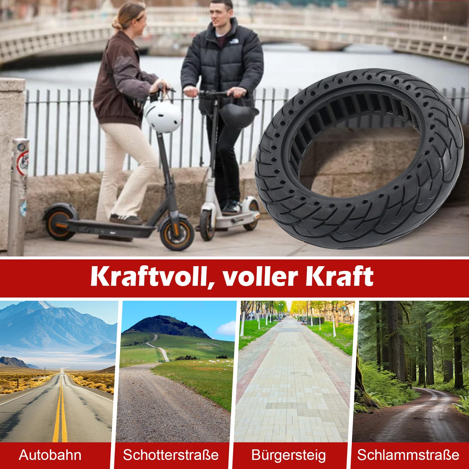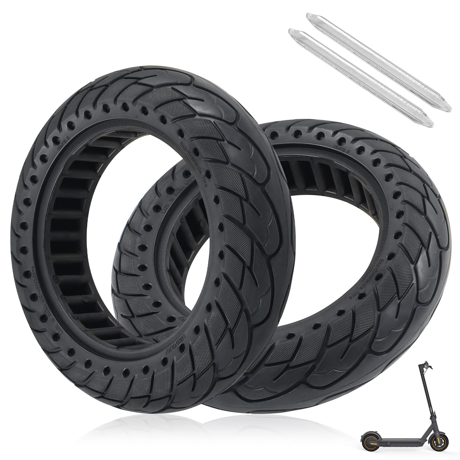 ["Compatibility"] Outer diameter 9.4 inches, inner diameter 5.9 inches, width 2.5 inches, groove width 1.8 inches. This 10 x 2.5 solid rubber tire can be used as a replacement tire for Ninebot Max G30/G30 D/G30 D2. This tire is only suitable for Ninebot G30 series scooters.["Quality Material"] The electric scooter's solid rubber tires are made of natural rubber, which is non-toxic and tasteless. Wider and thicker than regular tires, more wear-resistant. The inside of the wheel is designed with a honeycomb pattern to better dissipate heat and absorb shocks.["Premium Performance"] The grooved rubber surface provides excellent grip and can be used in rain or snow. Unlike conventional tires, solid rubber tires do not need to be inflated and do not cause punctures, effectively avoiding tire blowouts and ensuring maximum driving comfort.["Easy to Install"] Please soak the solid tire replacement wheel in hot water or microwave for about 10 minutes before installation to soften it. Comes with tire levers to make removal and installation easier. You can watch the installation video on YouTube.["Practicality"] It can easily travel on various road surfaces, such as highways, bumpy mountain roads, gravel roads, sandy roads, uphill roads, or grass. Whether it's a slippery road in the rainy season or a snowy road in winter, it provides the same comfortable driving experience and is the perfect choice for outdoor activities.