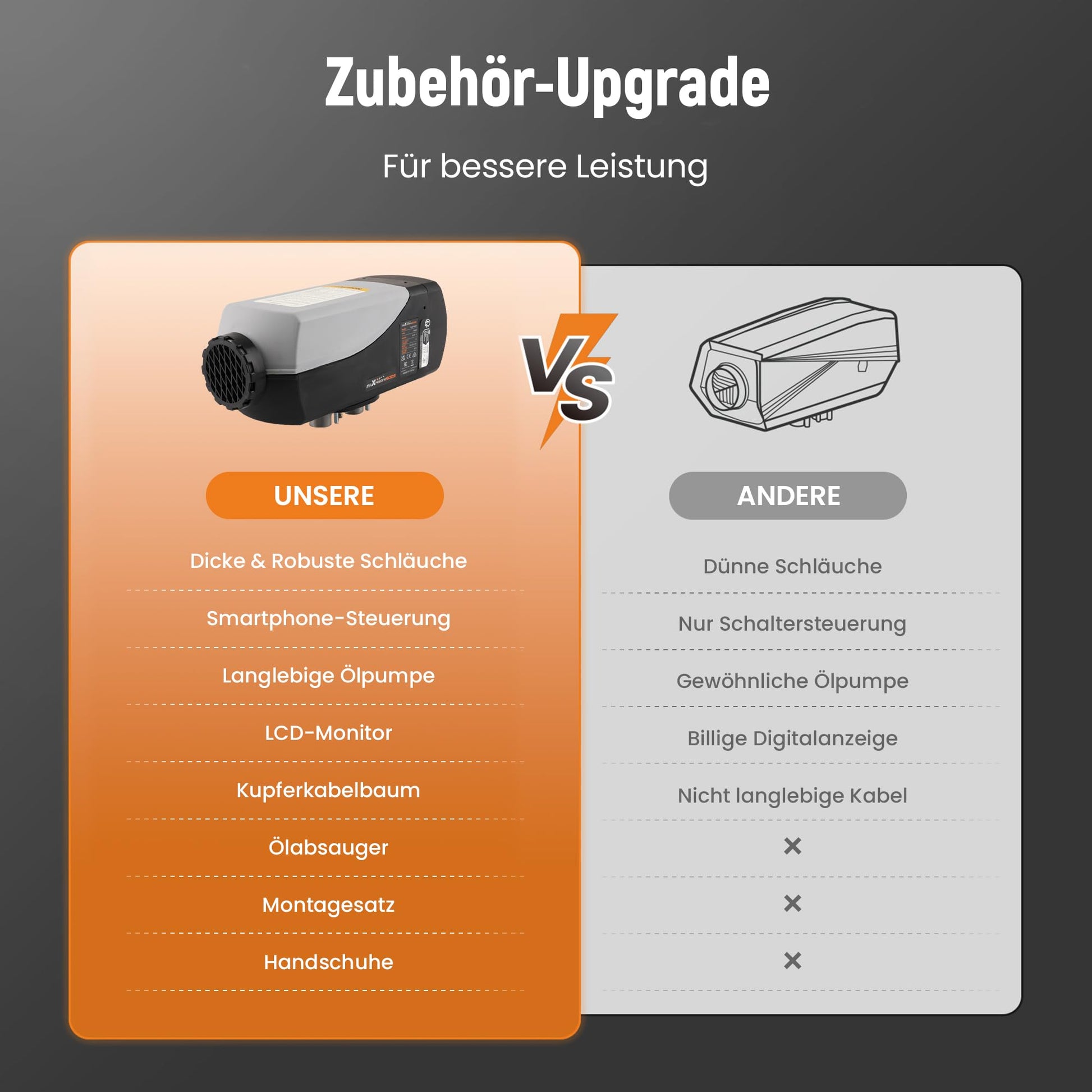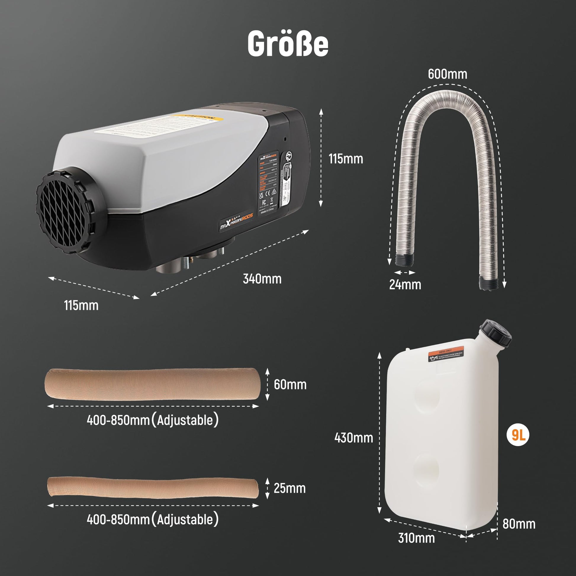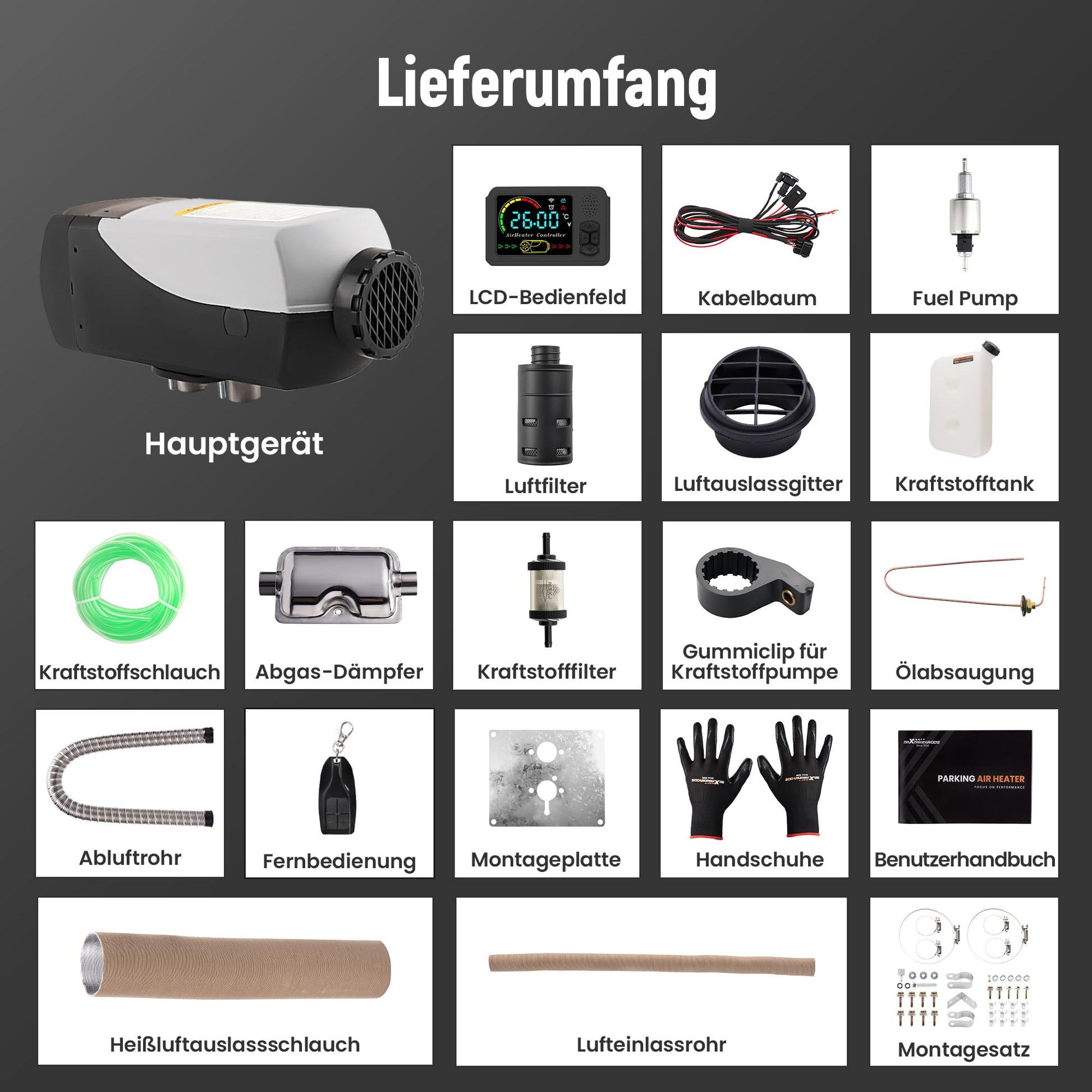 Complete Accessories: Complete accessories, including all necessary parts of the parking heater. The parking heater has an extra large 9-liter fuel tank that maximizes fuel efficiency, allowing it to heat continuously for up to 38 hours without constant refilling, saving time and effort.