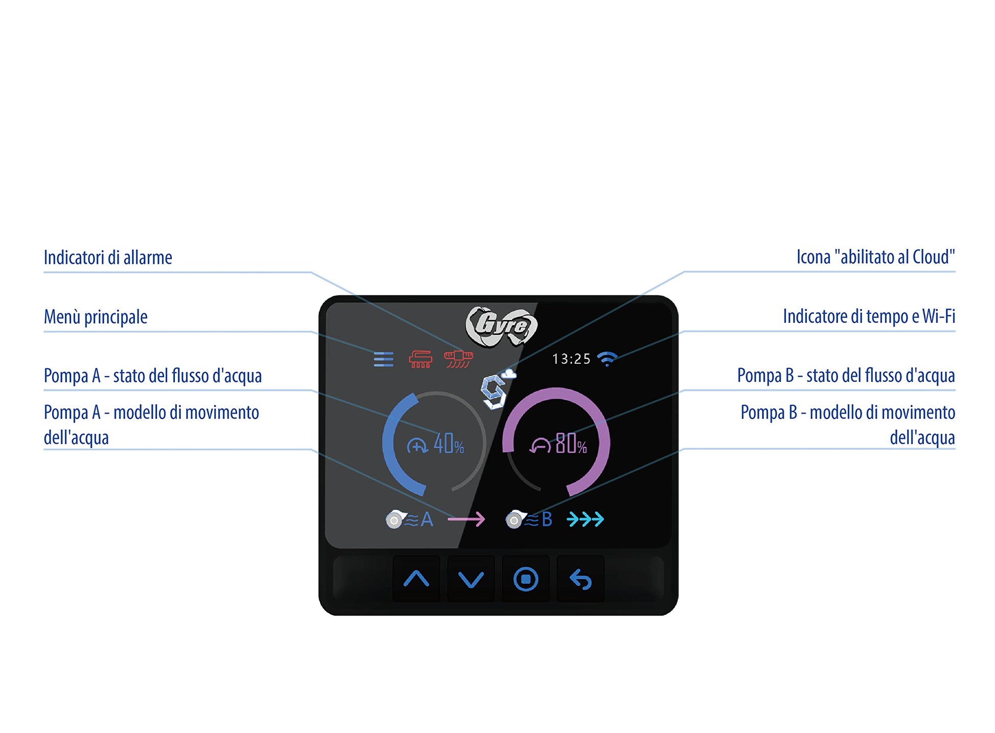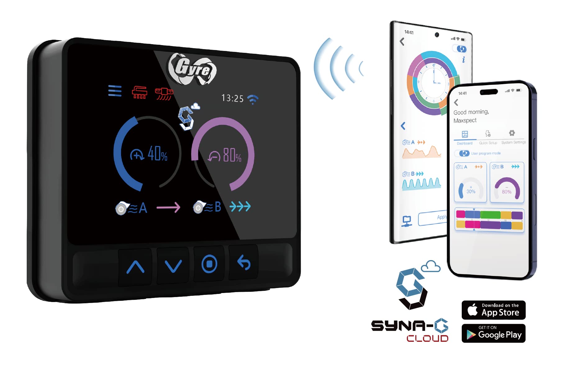 ["Suitable for aquarium volume 300-3000 L, power 52 W, voltage 220 V-50 Hz","Included in delivery: 2 pumps, 2 magnetic holders, controller and power supply","Dimensions: L325 x W75 x H38 mm x 2 / Power 5-52 W / Flow rate 20,000 l/h / Weight 645 g x 2 for underwater use Color black Cable length from controller to pump: 3 m; from power supply to controller: 1.5 m Suitable for aquarium volume 300-3000 L Vetromax thickness 20 mm","Cloud-enabled Control your Gyre pumps anywhere in the world via the cloud with our Syna-G Cloud app","The brand new Gyre Advanced CloudController With a large 3.2\" TFT-LCD color display, the full circulation of the Gyre in your aquarium is visible in an instant.","Now with over 20 preset water motion models. Simply choose the water motion model for your aquarium with a simple button press, no programming required","Experience the revolutionary Aquamultidirectional flow. The cages and flow directions are subject to a comprehensive review, now with horizontal and vertical water flow on 4 sides"]