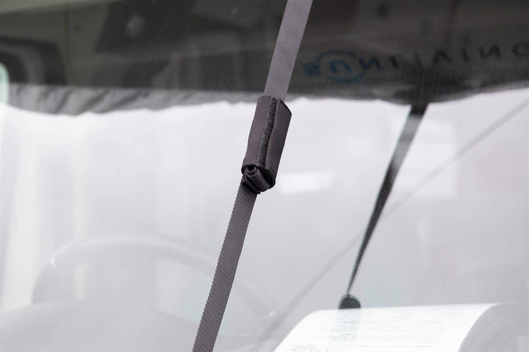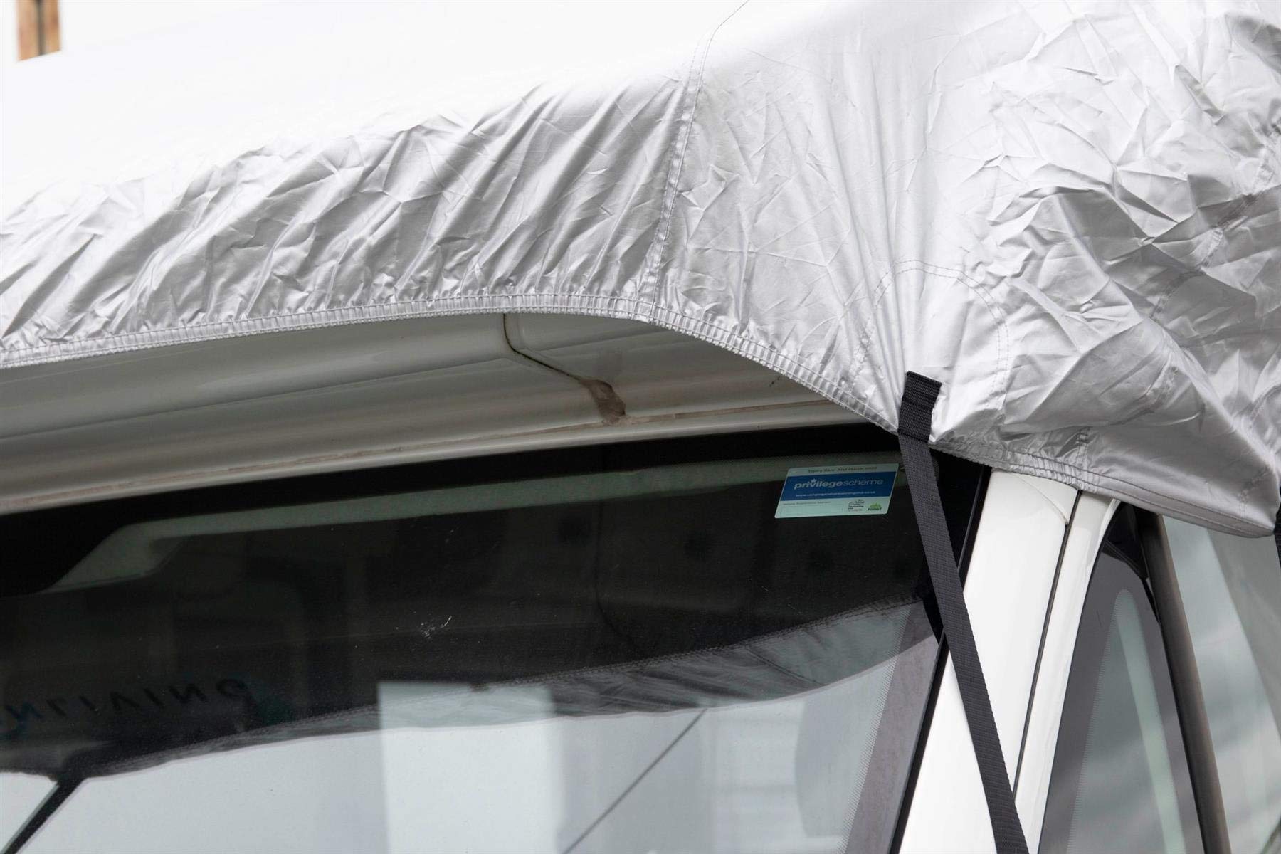 ["A quick and easy to install cover to protect the RV against: Frost, Snow, Smog, Dust, Rain, Wind, UV rays, Leaves and Birds","Durable, water-resistant polyester material with high UV protection","22 Adjustable straps with nylon-coated steel hooks for secure fit","Non-abrasive padded protection prevents scratches or damage to the bodywork","Elastic cord on front for a tailored fit","Non-abrasive padded protection prevents scratches or damage to the bodywork"]
