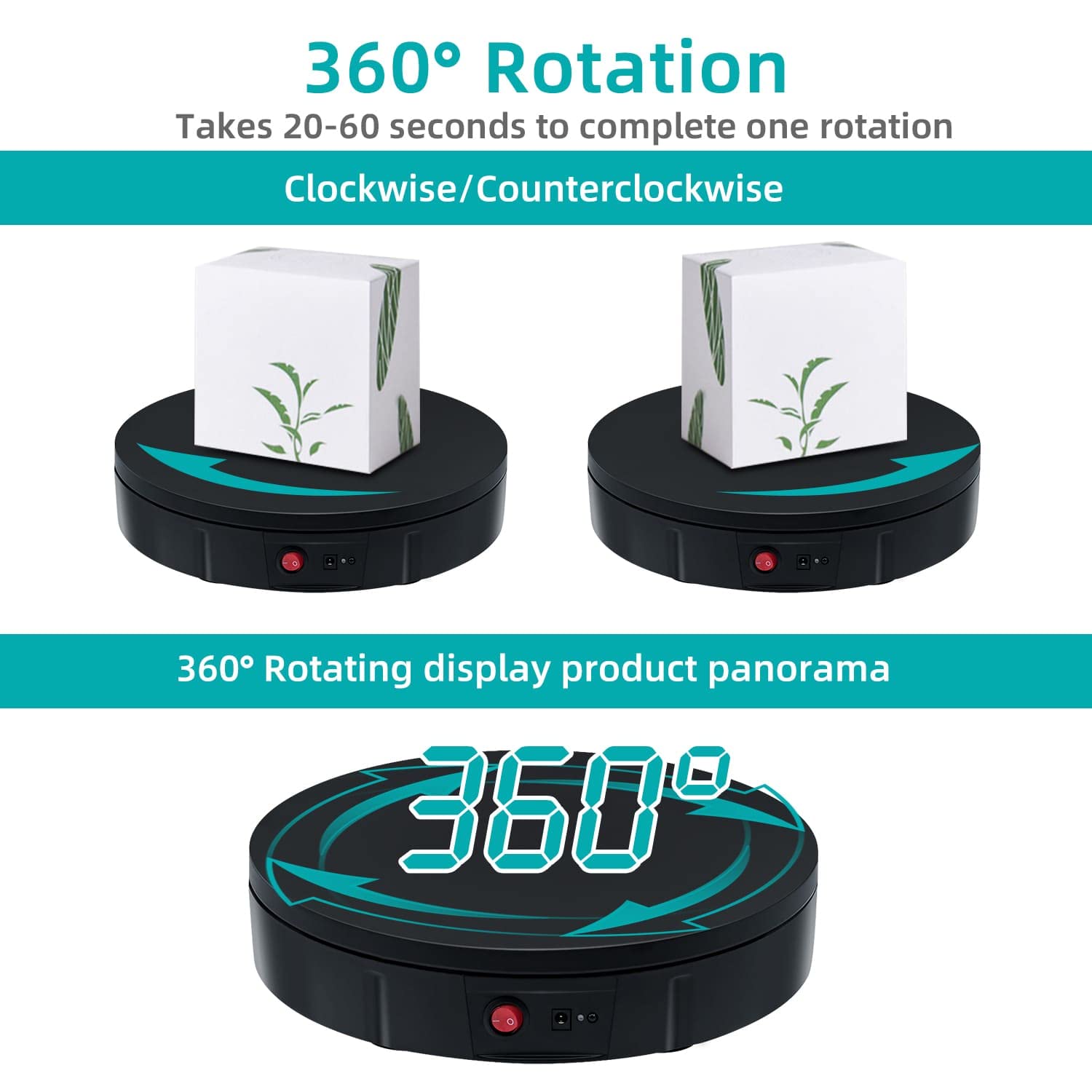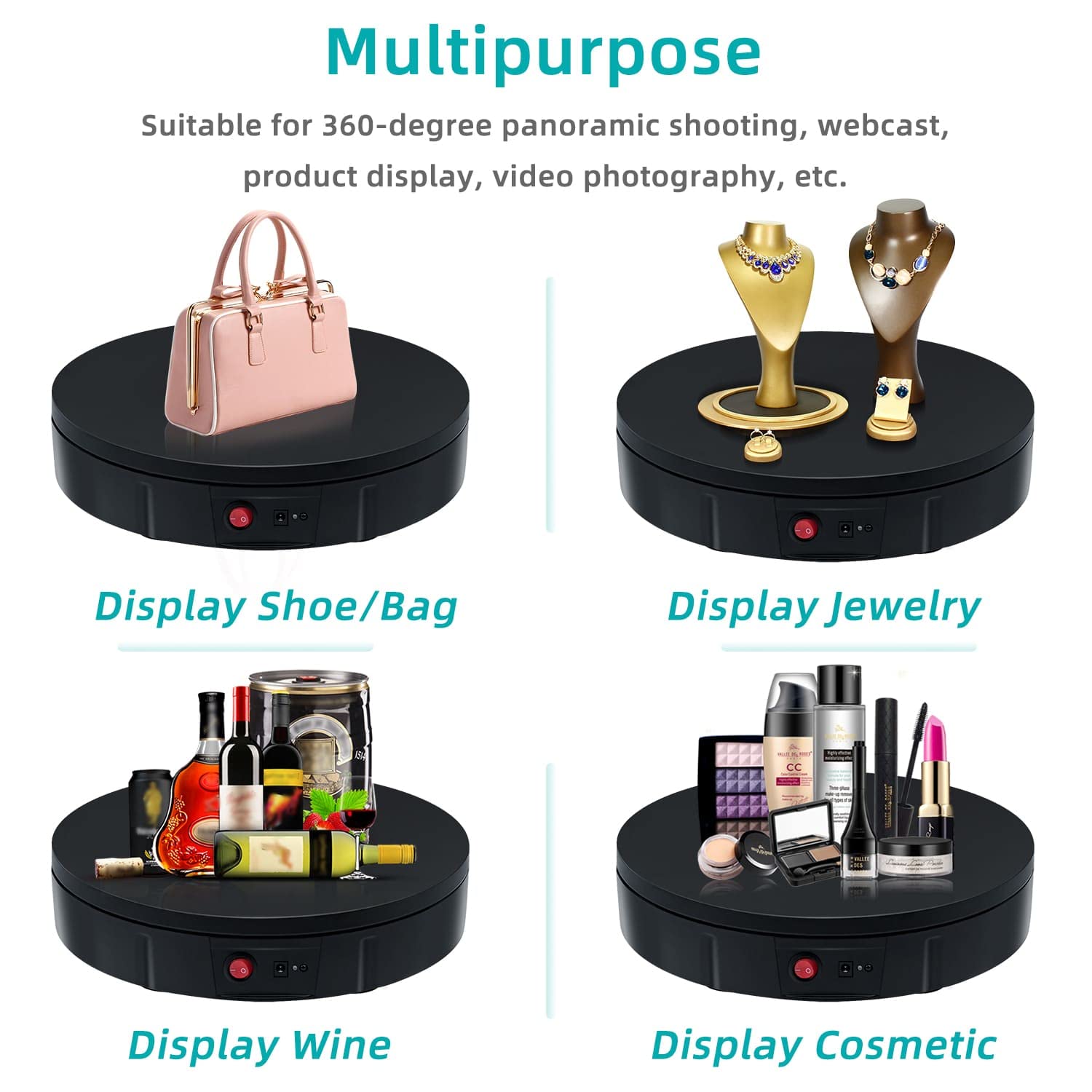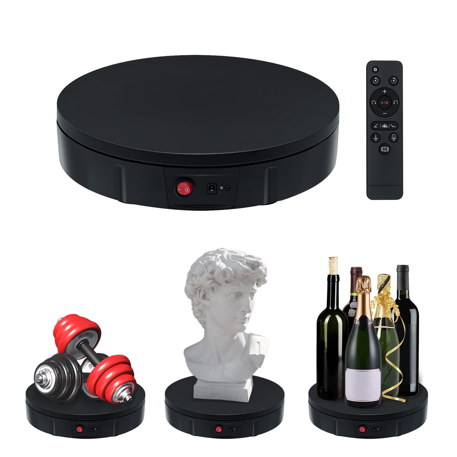 ["This rotating display turntable, measuring 11.8"/30cm, provides a 360-degree view of the rotating product. Perfect for showcasing products, shoes, handbags, beauty products, clothing, wine, food collections, suitable for stores, studios, showrooms, and other venues.","The 360-degree rotating stand has a diameter of 30 cm and a height of 6 cm. The load capacity is approximately 220 lbs (depending on the selected rotation speed).","The speed and direction or angle can be adjusted and customized. Direction buttons: switch between clockwise or counterclockwise; +/-: multi-speed adjustable, can be set to make a circle in 22-60 seconds; Angle button: angle setting, 45/90/180+360 degree cycle.","At the bottom, there is a non-slip base that stabilizes the position of the display stand. When the display stand rotates, the noise is minimal and the sound level is low.","The automatic display stand rotates continuously and evenly, delivering excellent results in video recording and product demonstrations, with manual and automatic control modes available. It can be turned on and off by pressing the power button or by clicking the start/pause button on the remote control."]