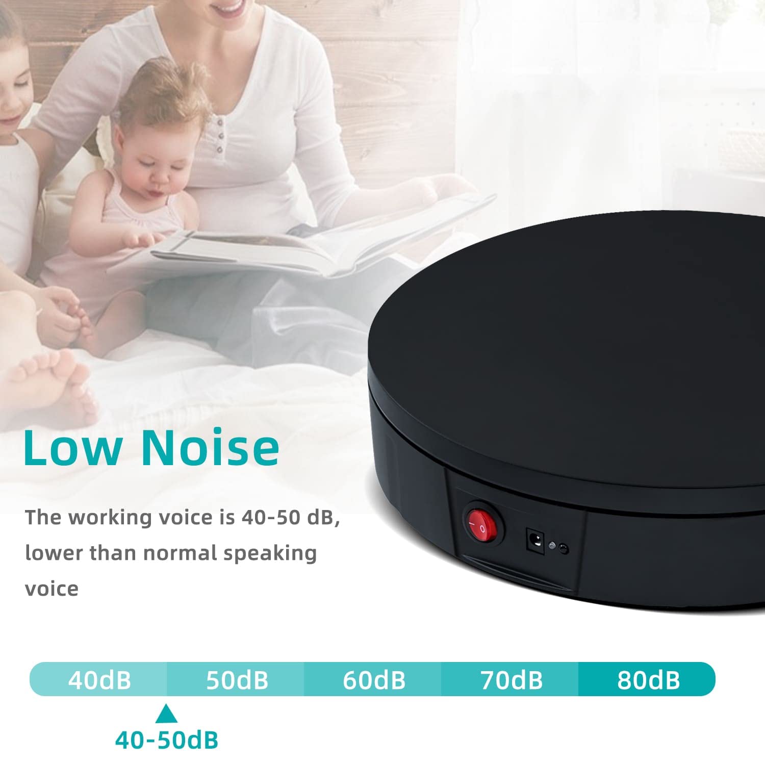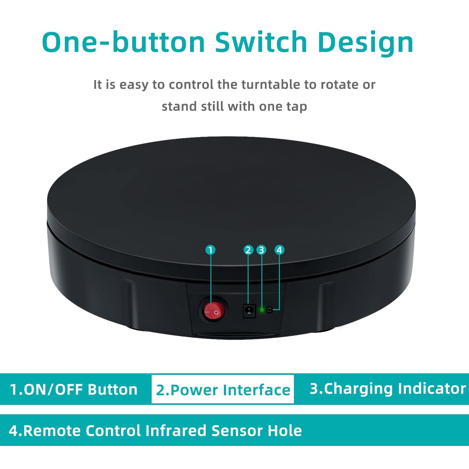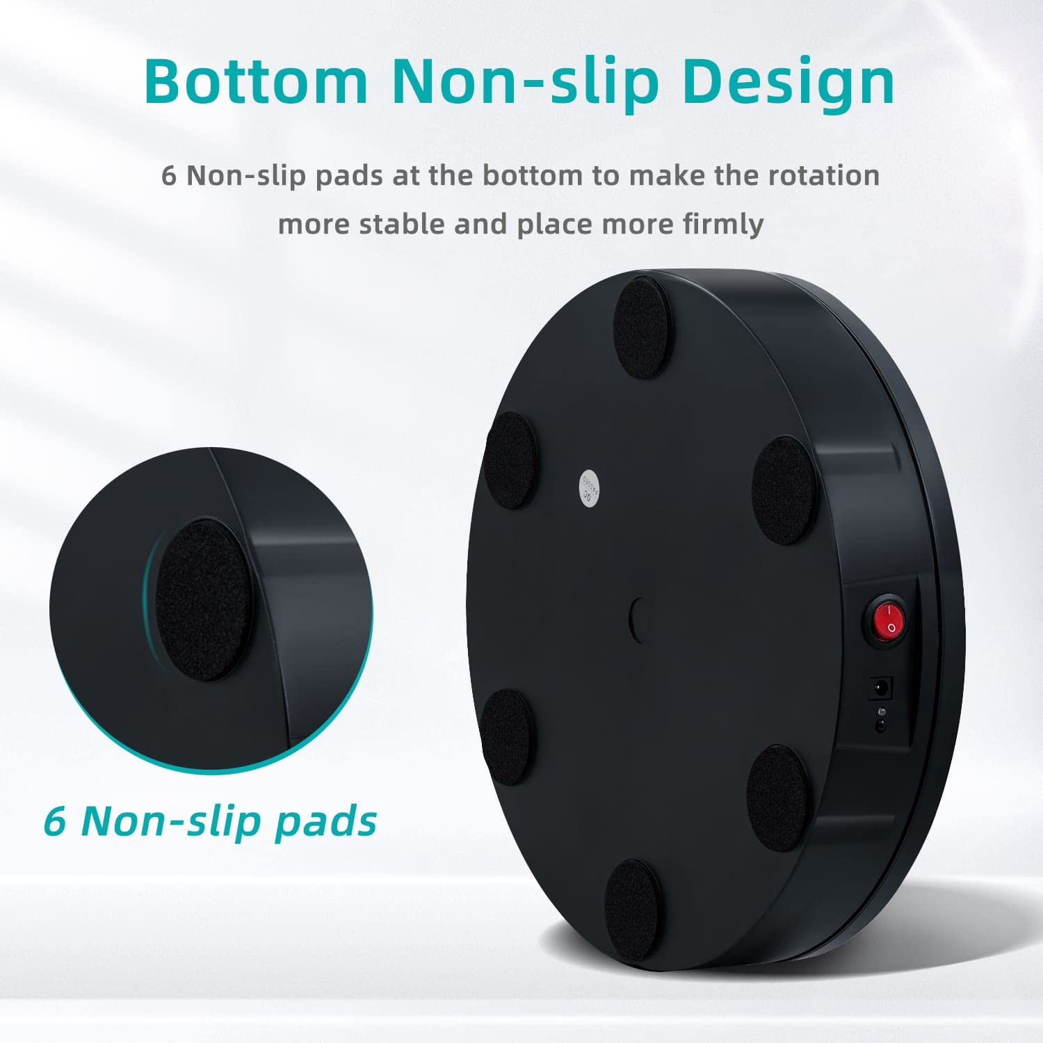 ["This rotating display turntable, measuring 11.8"/30cm, provides a 360-degree view of the rotating product. Perfect for showcasing products, shoes, handbags, beauty products, clothing, wine, food collections, suitable for stores, studios, showrooms, and other venues.","The 360-degree rotating stand has a diameter of 30 cm and a height of 6 cm. The load capacity is approximately 220 lbs (depending on the selected rotation speed).","The speed and direction or angle can be adjusted and customized. Direction buttons: switch between clockwise or counterclockwise; +/-: multi-speed adjustable, can be set to make a circle in 22-60 seconds; Angle button: angle setting, 45/90/180+360 degree cycle.","At the bottom, there is a non-slip base that stabilizes the position of the display stand. When the display stand rotates, the noise is minimal and the sound level is low.","The automatic display stand rotates continuously and evenly, delivering excellent results in video recording and product demonstrations, with manual and automatic control modes available. It can be turned on and off by pressing the power button or by clicking the start/pause button on the remote control."]
