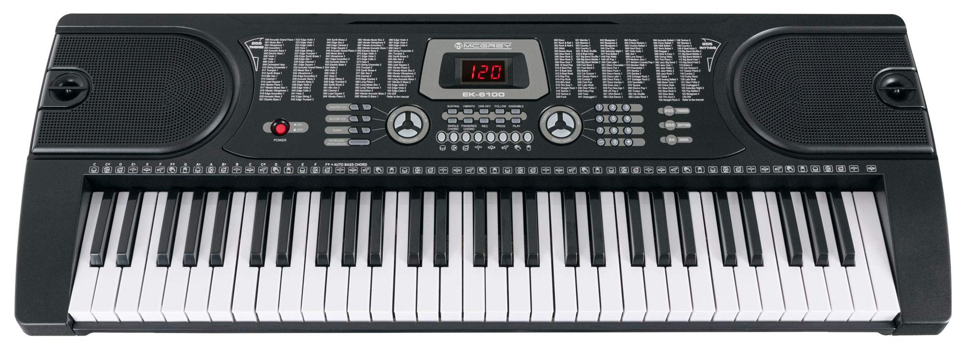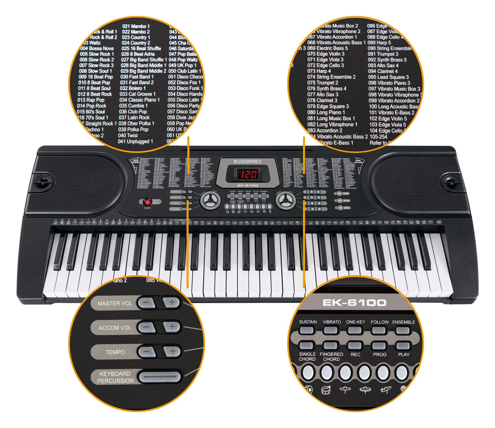 ["LARGE SOUND VARIETY WITH EFFECTS - A total of 255 different sounds can be selected. Each sound can be further refined with sustain or vibrato.","EXTENSIVE AUTO ACCOMPANIMENT - The auto accompaniment of the EK-6100 features 255 rhythms, which provide the complete backing band in Single-Chord Mode or Fingered-Chord Mode.","INTELLIGENT LEARNING FUNCTIONS - The EK-6100 has three different functions to learn playing on a keyboard instrument based on the 24 accompaniment songs.","MICROPHONE AND AUX CONNECTION - In addition to the home keyboard, a microphone is included. For playing along to other favorite songs, a smartphone, tablet, or MP3 player can be connected.","SUPER KIT - This set includes everything to start playing right away: an adjustable table, a keyboard bench, a microphone, and stereo headphones"]