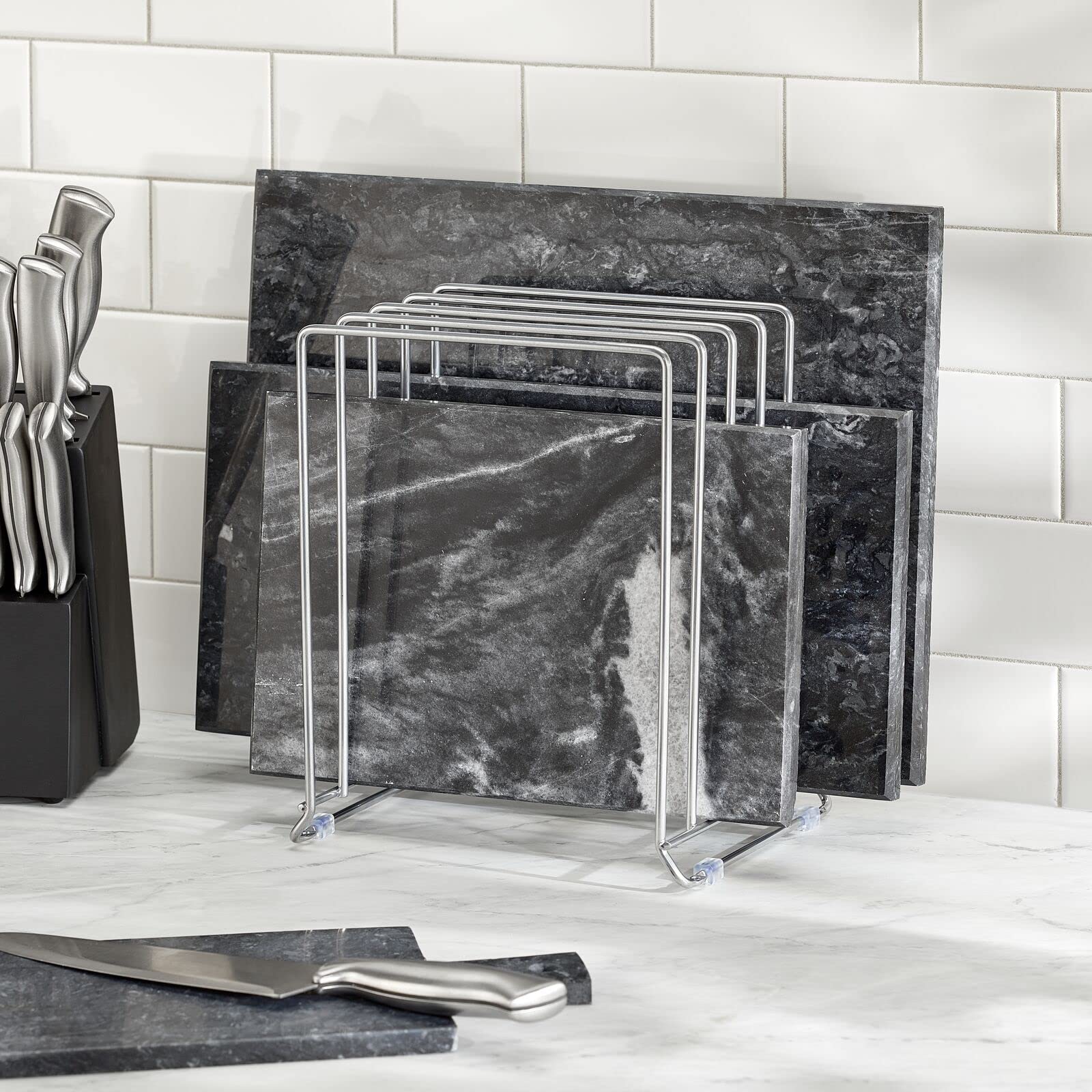 "CLEAR KITCHEN CABINETS: With this dish rack, baking sheets and lids can be stored in the cabinet. It can be placed vertically or horizontally."