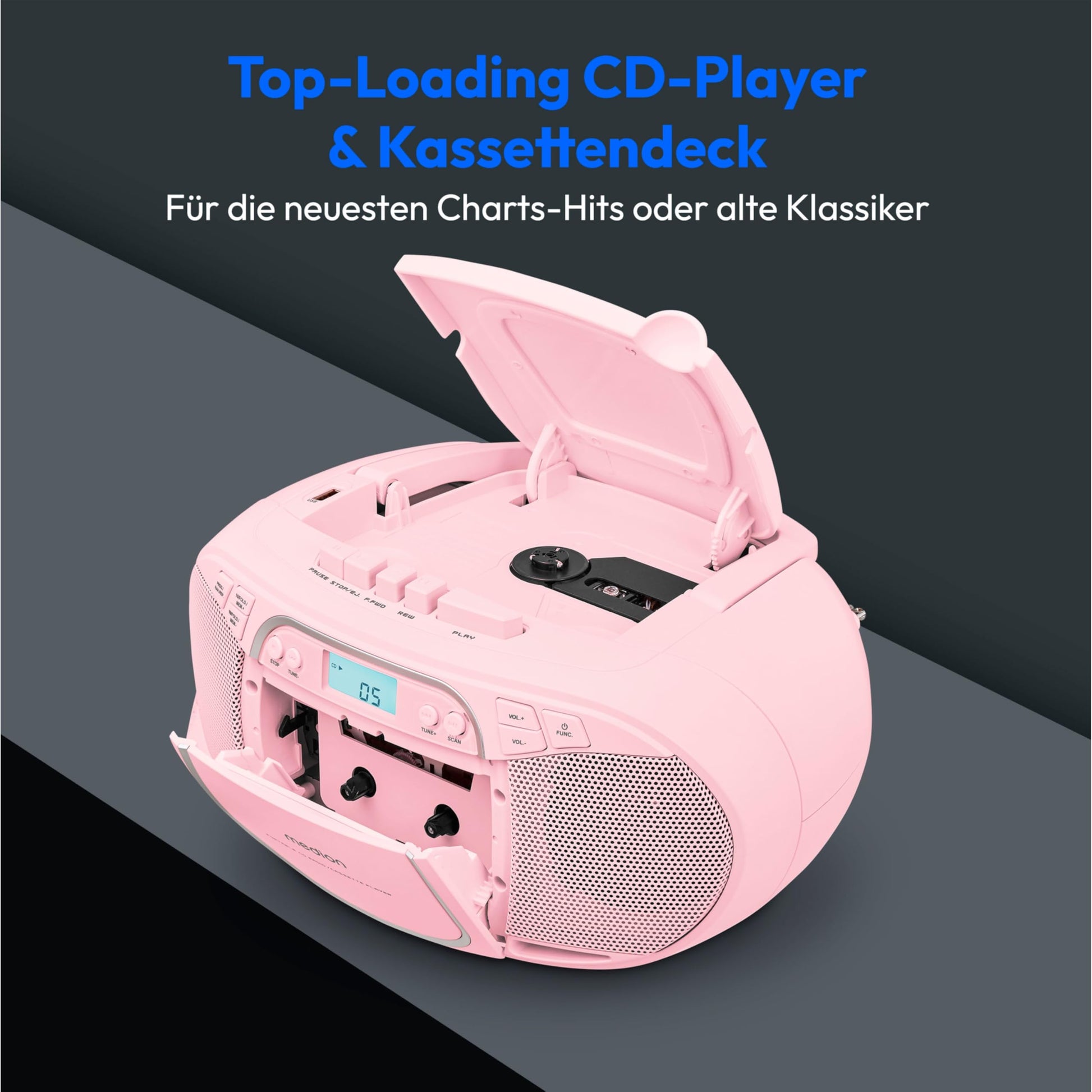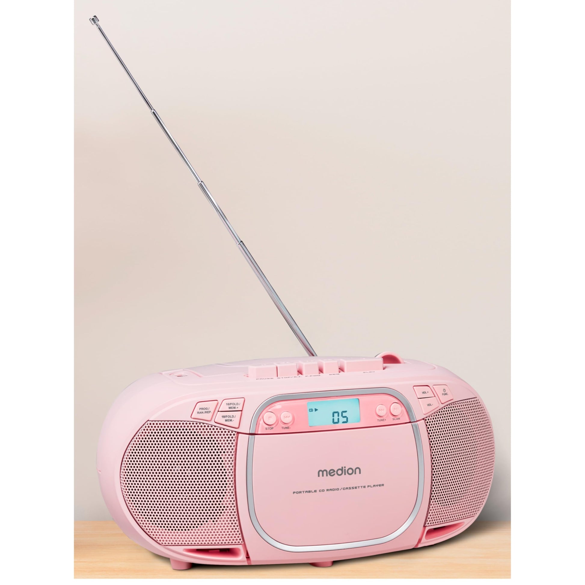 MEDION E66476 Stereo Sound System (Boombox, CD player, MP3, cassette, portable cassette player for kids, FM radio, AUX, headphones, mains & battery operation) Pink