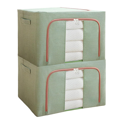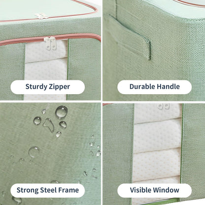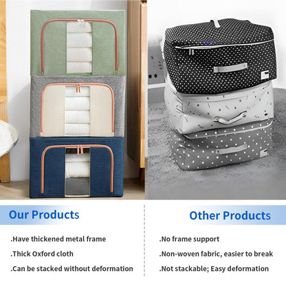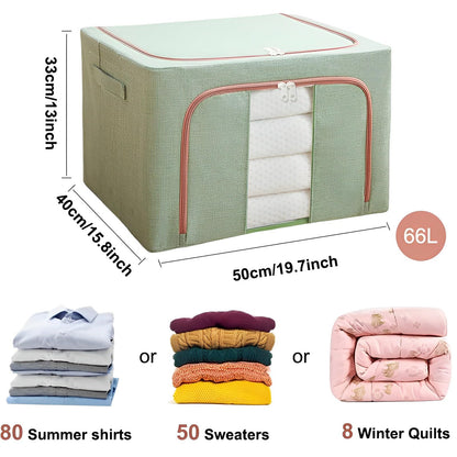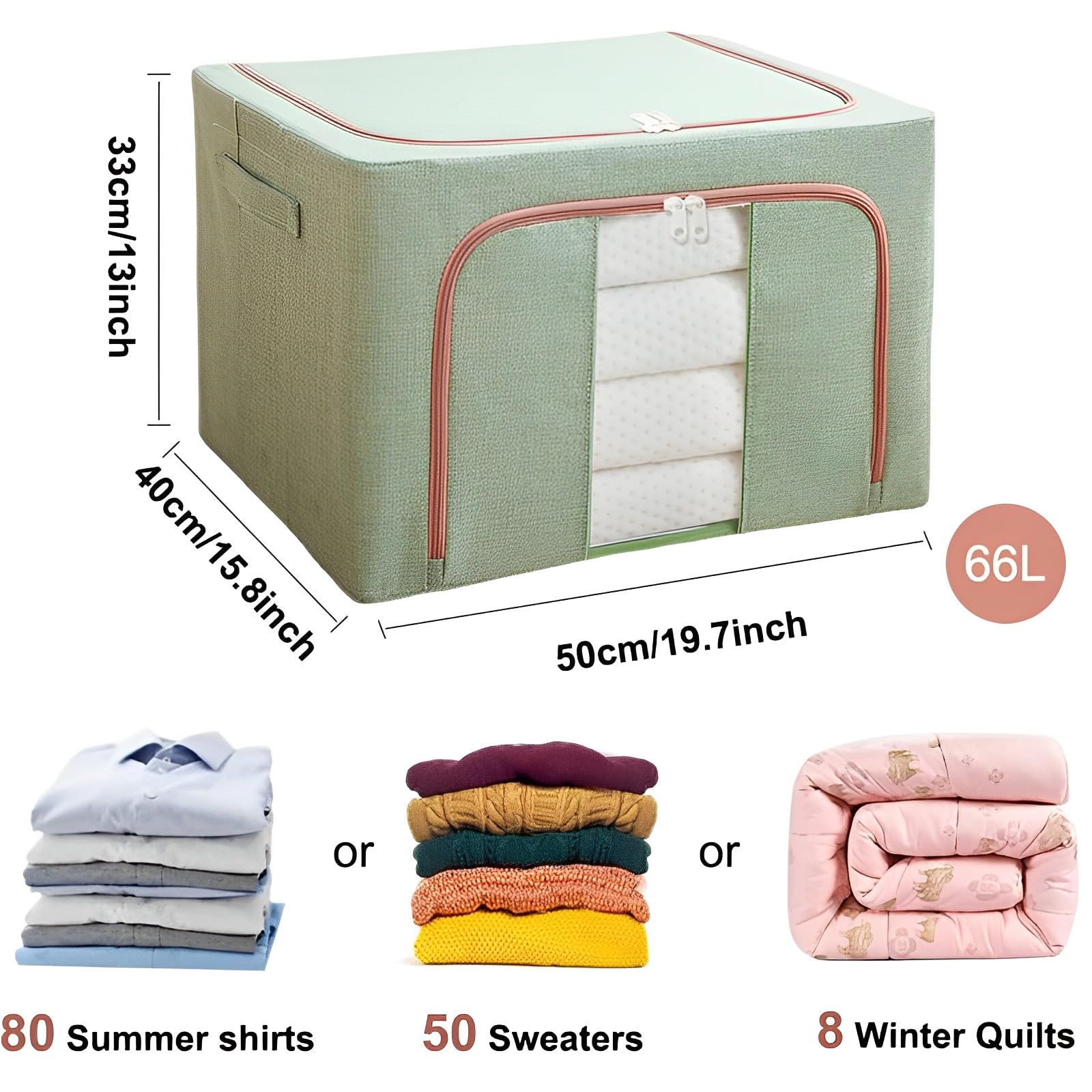 ["【Large Capacity】Do you have a large need for storage and organization in your home? Just put all the clutter in our storage containers, you will have a well-organized space. Each storage box measures 19.68x15.74x12.99 inches, with a capacity of 66L. It is spacious for organizing comforters, blankets, pillows, stuffed animals, and clothing.","【Premium Quality Material】These stackable storage boxes are made of waterproof Oxford cloth, which is more sturdy and durable than non-woven fabric material. It truly provides a secure and elegant solution for daily storage.","【Foldable & Stackable】The clothes box is built with a stainless steel frame, which is very stable. With the metal frame, the storage container can maintain its full shape even when you stack 1-2 boxes on top of it. You can fold it up for space-saving storage when not in use.","【Easy Access & Clear Window】There are two side handles on the storage container, making it convenient to move and carry. Two sturdy zippers are hard to break, so you can smoothly open and close every time. Clear window design helps you quickly identify the contents inside without opening it.","【Versatility】The Oxford cloth steel frame storage box can be placed in a closet, wardrobe, or on top of the closet. It is ideal for storing seasonal clothing, toys, blankets, bedding, etc. Our large clothes storage will optimize your storage space and save."]