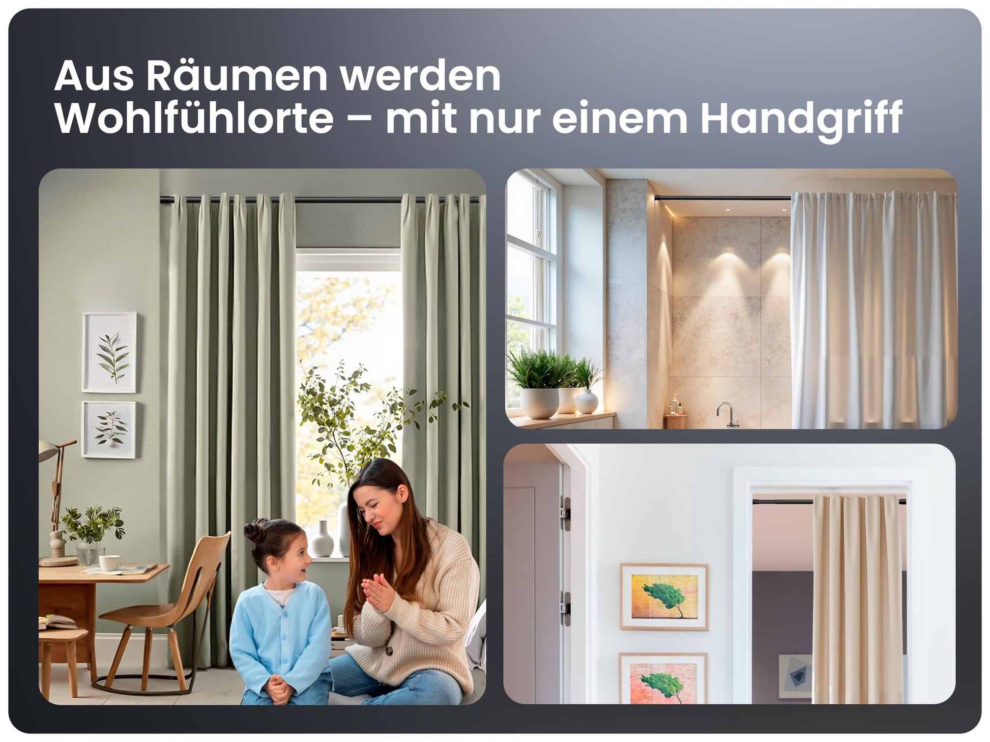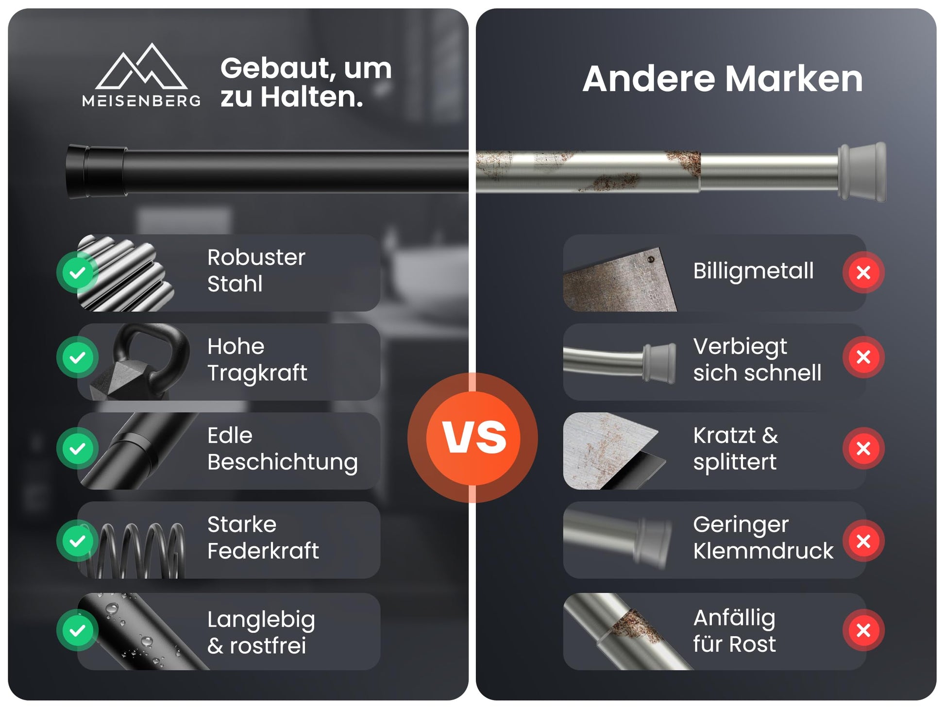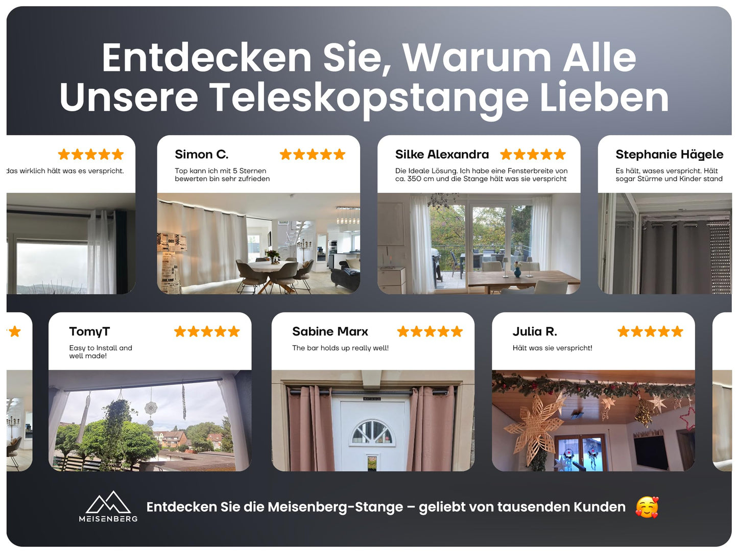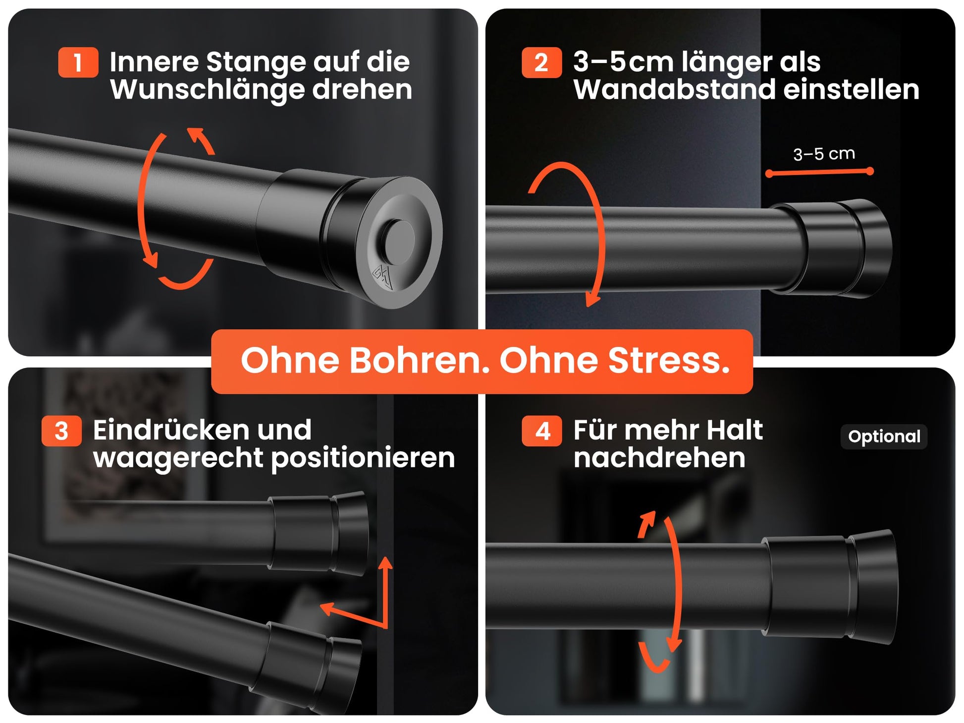 ["🔸 SOFORTIGE EINRICHTUNG & UNIVERSELLE PASSFORM: Transform any room in minutes with this Adjustable Tension Rod without drilling - no tools required. The telescopic curtain rod adjusts seamlessly to your desired length, ensuring a perfect fit anywhere, from the kitchen to the bathroom. Experience the simplicity of a no-drill curtain rod for quick, damage-free updates.","🔸 ZUVERLÄSSIGKEIT IN JEDER ZEIT: Constructed from sturdy steel and featuring a powerful spring, this rod can carry substantial weight without slipping. Trust in the lasting strength of our tension rod for all your heavy curtains, from kitchen drapes to living room decorations. Ideal for clamping, it provides secure grip without drilling.","🔸 AUSGEZEICHNETES DESIGN: Not only practical, our no-drill curtain rod is also aesthetically pleasing. Coated with high-quality, rust-resistant material, it offers elegance and durability, enhancing the interior of your home with flawless style.","🔸 STABILITÄT TRIFFT INNOVATION: Stay secure with Anti-Slip Mats 2.0 and superior construction that ensures your curtain stays in place on any surface. Our telescopic rod incorporates state-of-the-art materials for maximum functionality and durability.","🤝 ULTIMATIVE SICHERHEIT: Enjoy the confidence of a lifetime warranty and a 3-month return guarantee. Our aim is to ensure your complete satisfaction."]