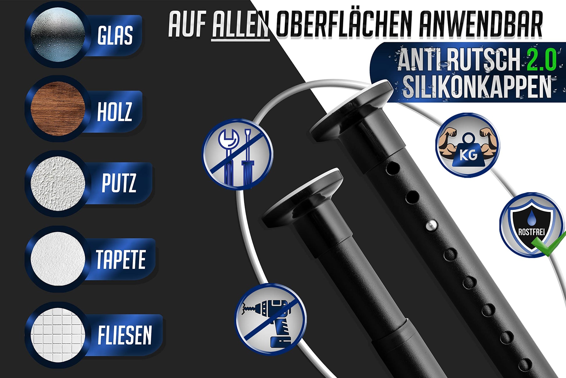 ["🔸 SOFORITIGE EINRICHTUNG & UNIVERSELLE PASSFORM: Transform any room in minutes with this Adjustable Tension Rod without drilling - no tools required. The telescopic curtain rod seamlessly adjusts to the desired length, ensuring a perfect fit anywhere from the kitchen to the bathroom. Experience the simplicity of the no-drill curtain rod for quick, damage-free updates.","🔸 ZUVERLÄSSIGKEIT IN JEDER ZEITMETRIK: Constructed from sturdy steel and equipped with a powerful spring, this rod supports significant weight without slipping. Trust in the lasting strength of our tension rod for all your heavy curtains, from kitchen drapes to living room decorations. Ideal for clamping and providing secure hold without drilling.","🔸 AUSGEZEICHNETER STIL UND FUNKTION: Our no-drill curtain rod is not only practical but also visually appealing. Coated with high-quality, rust-resistant material, it offers both elegance and durability, enhancing the interior of your home with flawless style.","🔸 STABILITÄT TRIFFT INNOVATION: Stay secure with Anti-Slip Mats 2.0 and superior construction, ensuring that your curtain stays in place on any surface. Our telescopic rod incorporates state-of-the-art materials for maximum functionality and durability.","🤝 ULTIMATIVE SICHERHEIT: Enjoy the confidence of a lifetime warranty and a 3-month return guarantee. Our aim is to ensure your complete satisfaction."]