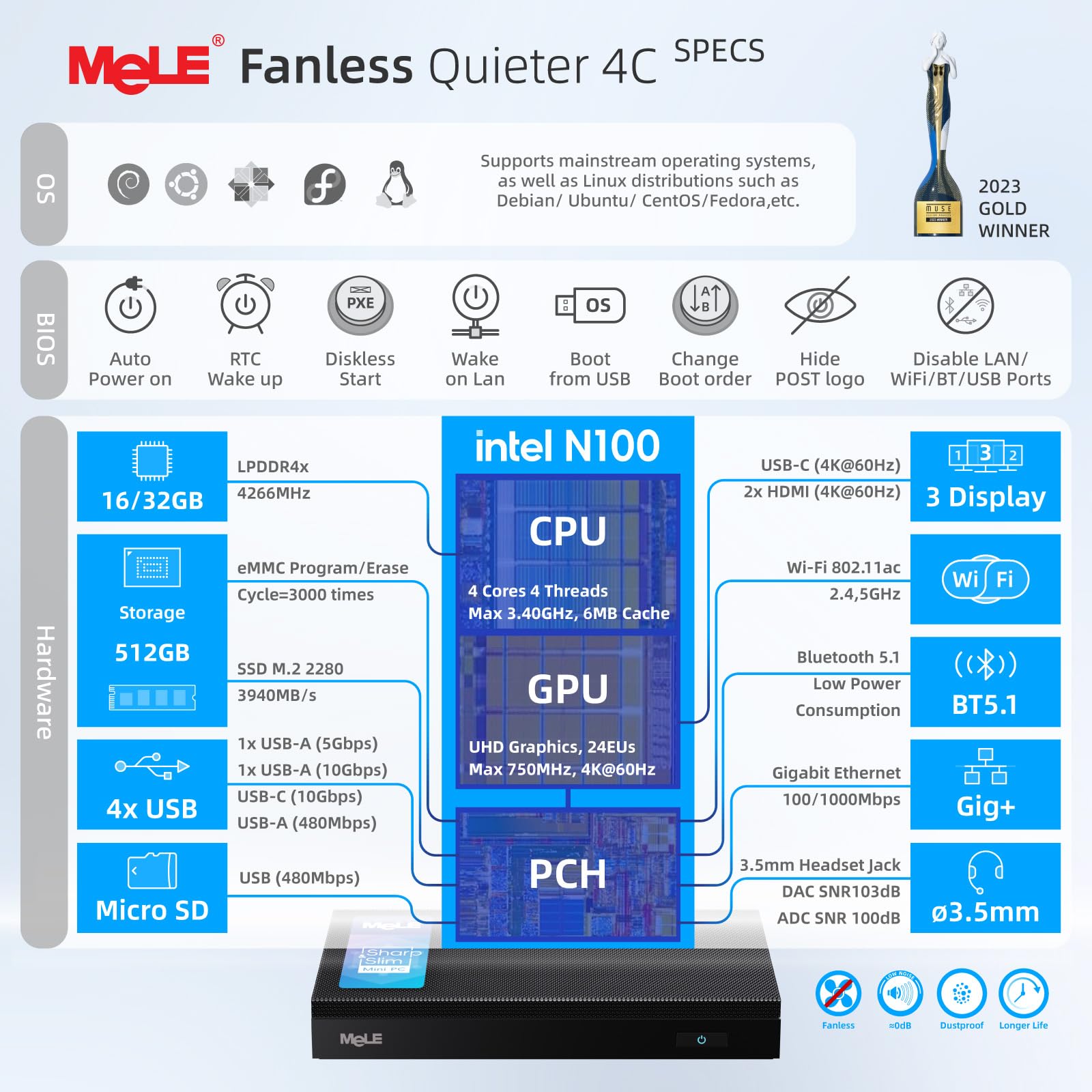 MeLE Quieter4C is a fanless mini PC powered by 12th Alder Lake N100 (up to 3.4GHz, 4C/4T) with 16GB LPDDR4x and 512GB storage. It runs Win11 Pro, supports 4K triple-display, USB-C, WiFi 5, BT5.1, and Ethernet, all in a compact desktop design.
