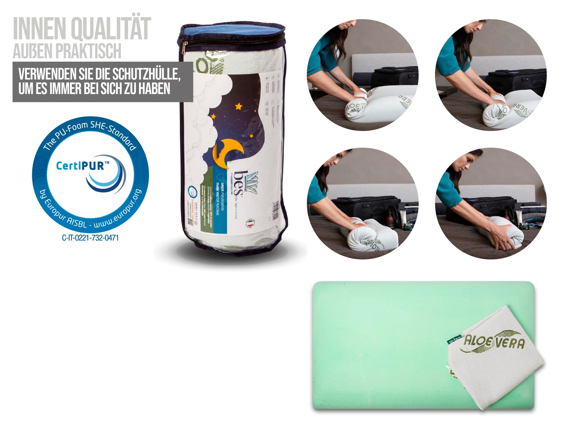["FOR WHOM IS IT SUITABLE: ➤ For side sleepers with the flexibility to change positions during the night. ➤ Ideal for those looking for a pillow that effectively supports the head. ➤ For people with nocturnal breathing problems who want to reduce the risk of snoring. ➤ Perfect for those who prefer a pillow with medium firmness and a \"Slow Memory\" effect (the neck pillow slowly returns to its original shape and perfectly adapts to the head). ➤ Suitable for individuals of average stature (5'3\"-5'11\", weight 132-198 lbs) or more robust build (over 5'11\", weight over 198 lbs).","FEATURES AND BENEFITS: ➤ Height: 4.7 inches. ➤ Dimensions: 27.5 x 16.5 inches. ➤ Shape: Classic rectangular shape. ➤ Material: Made of high-quality Memory Foam (Density 42 kg/m³), durable and comfortable. Water-foamed and free of harmful substances. ➤ Comfort: The Memory Foam Pillow envelops the senses with the delicate scent of Aloe Vera, providing maximum comfort and free of harmful components. ➤ Care: The memory foam is not machine washable; stains can be easily removed with a damp cloth. Do not expose to direct sunlight.","BREATHABLE AND WASHABLE COVER: ➤ Made of soft polyester for a comfortable feel on the skin. ➤ Care: The convenient zipper allows for easy removal and machine washing of the covers (max. 30°).","ITALIAN QUALITY AND CERTIFIED SAFETY: ➤ Handcrafted Italian product with OEKO-TEX and CertiPUR certifications for your health and well-being.","VERSATILE AND PRACTICAL: ➤ Ideal as a travel pillow, easy to roll up and store in the provided space-saving case.","PERSONALIZE YOUR SLEEP EXPERIENCE: ➤ Discover our full range of sleep pillows and find the perfect neck pillow for you!"]