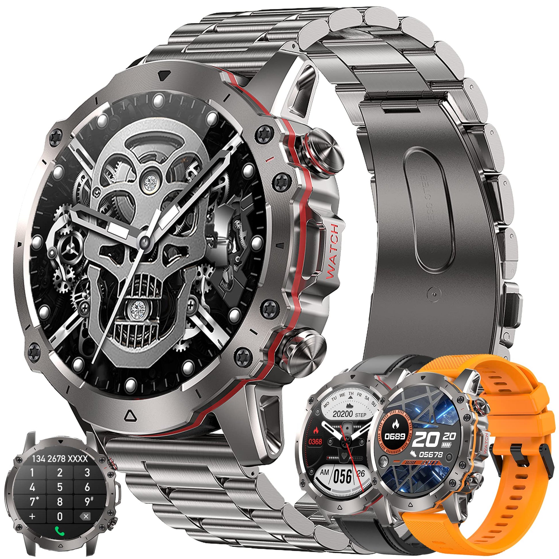["Use your wrist like a phone. The built-in speaker and microphone save you from whipping out your phone, allowing you to take calls while cycling or climbing. You can also listen to music directly through the men's smartwatches, get lost in the music, and enjoy a colorful and intelligent life. The smartwatch comes with 1 steel band, 1 leather band, and 1 silicone band suitable for various occasions.", "Daily Activity Tracker. Equipped with a high-precision sensor, the fitness watch for men can accurately track your heart rate 24/7, automatically track and record your sleep, detect blood oxygen, help you understand your physical condition, and make appropriate adjustments. In addition, the pedometer watch for men has a reminder function for the female cycle to maintain women's health.", "1.43'' large touchscreen & Personalized Watch Face. A smartwatch for men with a 1.43'' screen, adjustable brightness, a resolution of up to 360*360, and smooth touch controls. In the \"DaFit\" app, our Bluetooth calling smartwatch has more than 110 different dial styles to choose from, you can customize your favorite images. So you get high-resolution image quality and a wonderful visual experience.", "Multiple sports modes & 5ATM Waterproof. The fitness tracker is equipped with multiple sports modes for running, basketball, and other activities to meet your daily training requirements. It also measures your steps and calories burned in real-time, and you can view the GPS route on your phone. The fitness tracker watch can be worn daily for hand washing, rain, sweating, etc.", "Multifunctional Pedometer Watch for Men. You can also remotely control your smartphone's camera by touching or shaking the screen for camera control. It also has various useful functions such as weather forecast, brightness adjustment, flashlight, breathing training, watch finder, etc. The men's smartwatch is compatible with devices running iOS 9.0+ and Android 4.4+. The built-in battery lasts 7 days with normal use and 30 days standby."]