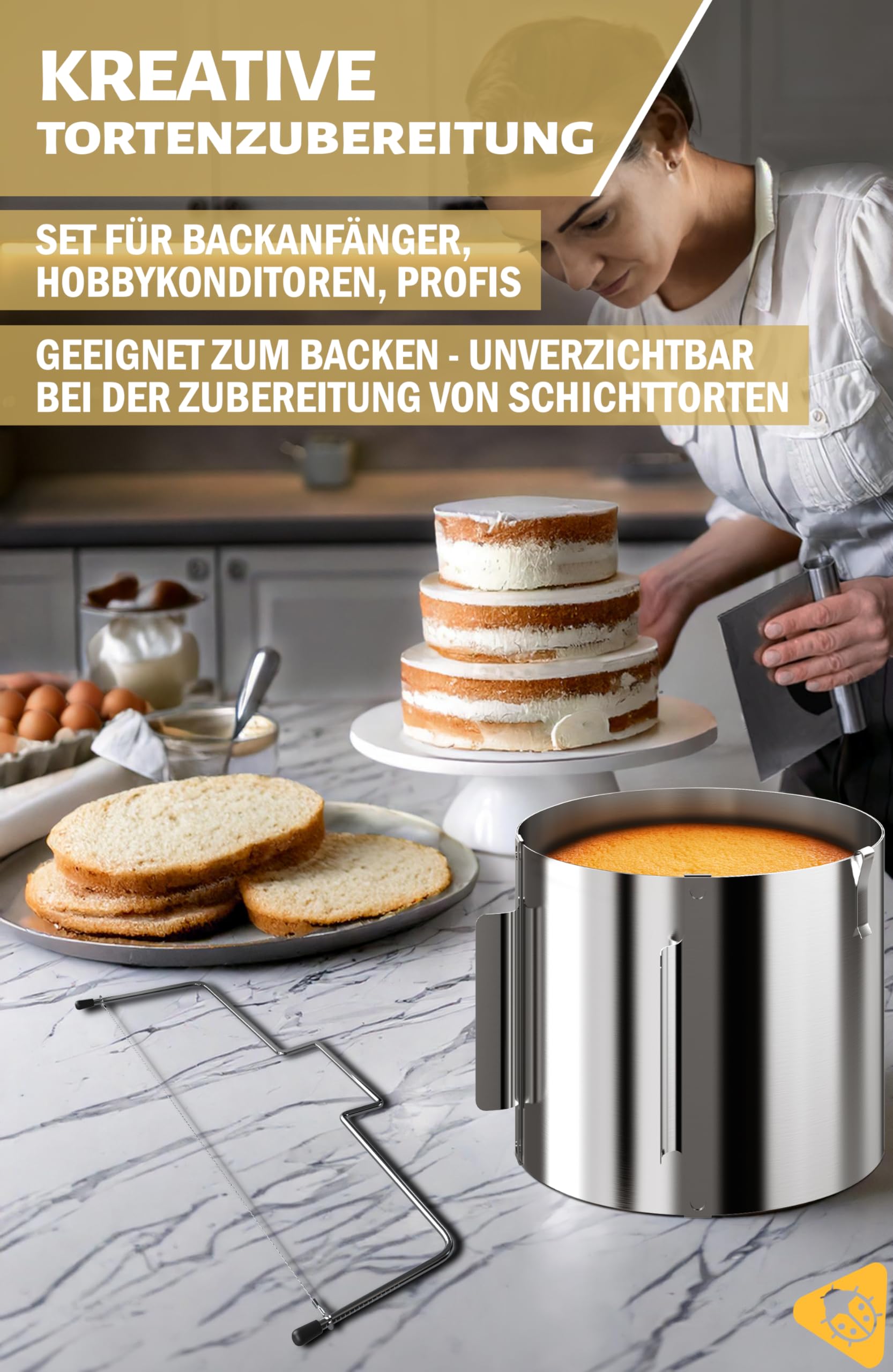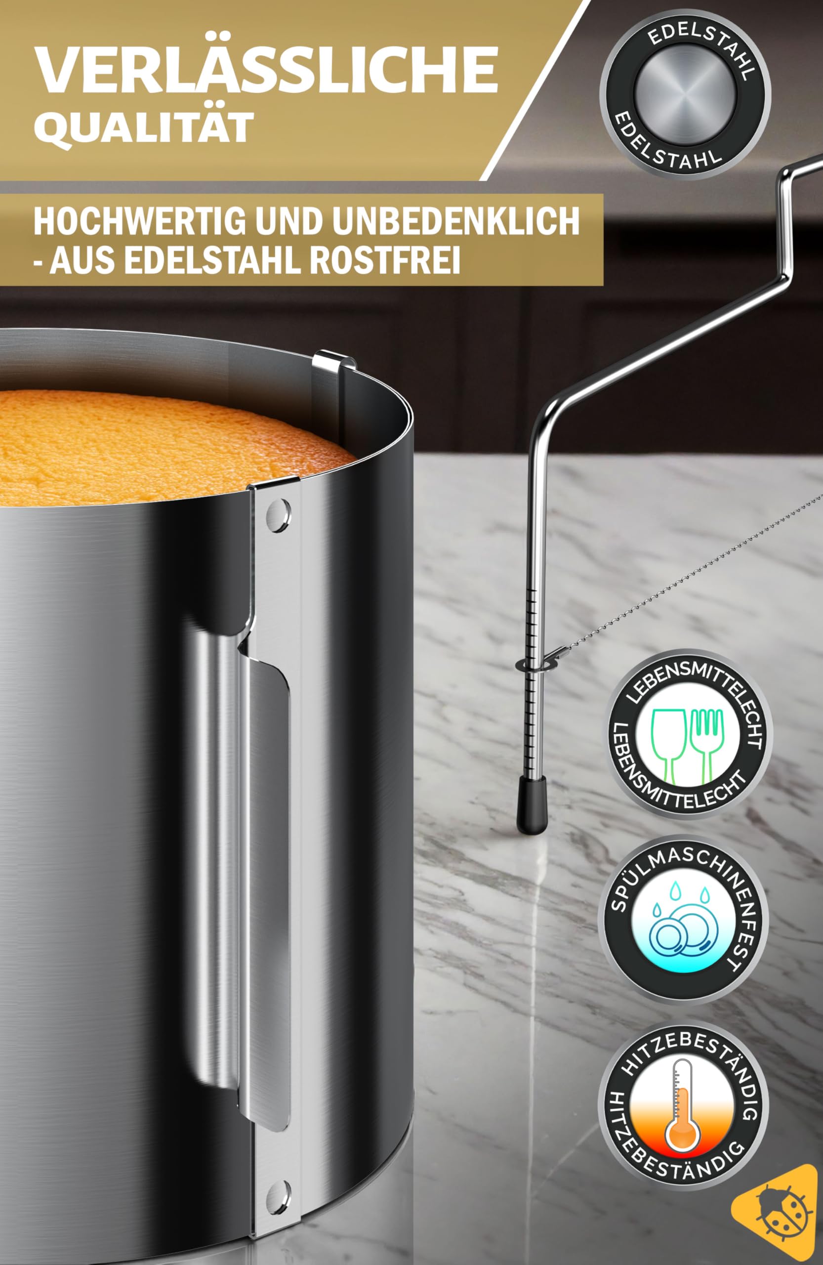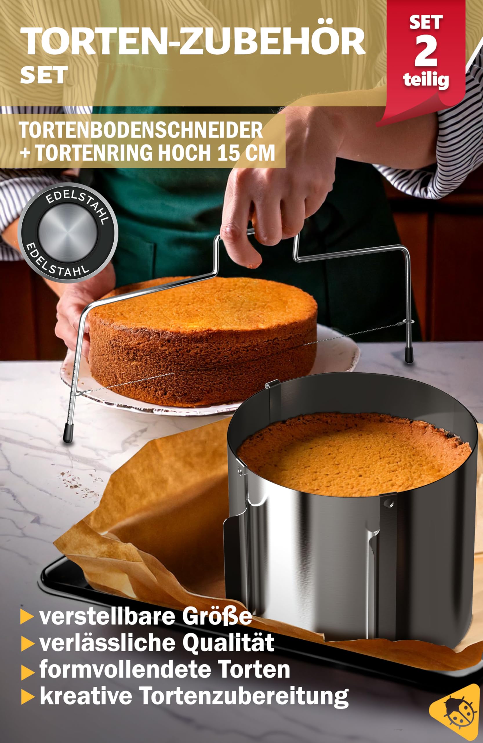["2-PIECE CAKE ACCESSORY SET: Adjustable cake bottom cutter + cake ring high 15 cm. The stainless steel cake set facilitates and perfects the preparation of cream, custard, and layered cakes.","ADJUSTABLE SIZE: Cutting wire of the cake saw adjustable in height, for cutting the cake bottom in even thin or thick layers. Adjustable cake ring Ø 16 - 30 cm, for small or large cakes.","RELIABLE QUALITY: Durable stainless steel baking utensils for cakes; rust-free, food-safe, dishwasher safe, baking ring heat-resistant and suitable for baking.","PERFECT CAKES: With this functional cake set, perfect cakes with uniform layers succeed. The cake ring stabilizes the cake during preparation.","CREATIVE CAKE PREPARATION: The 2-piece set is ideal for baking beginners, hobby pastry chefs, and professionals; suitable for baking cakes and cake bottoms, essential for the preparation of layered cakes."]