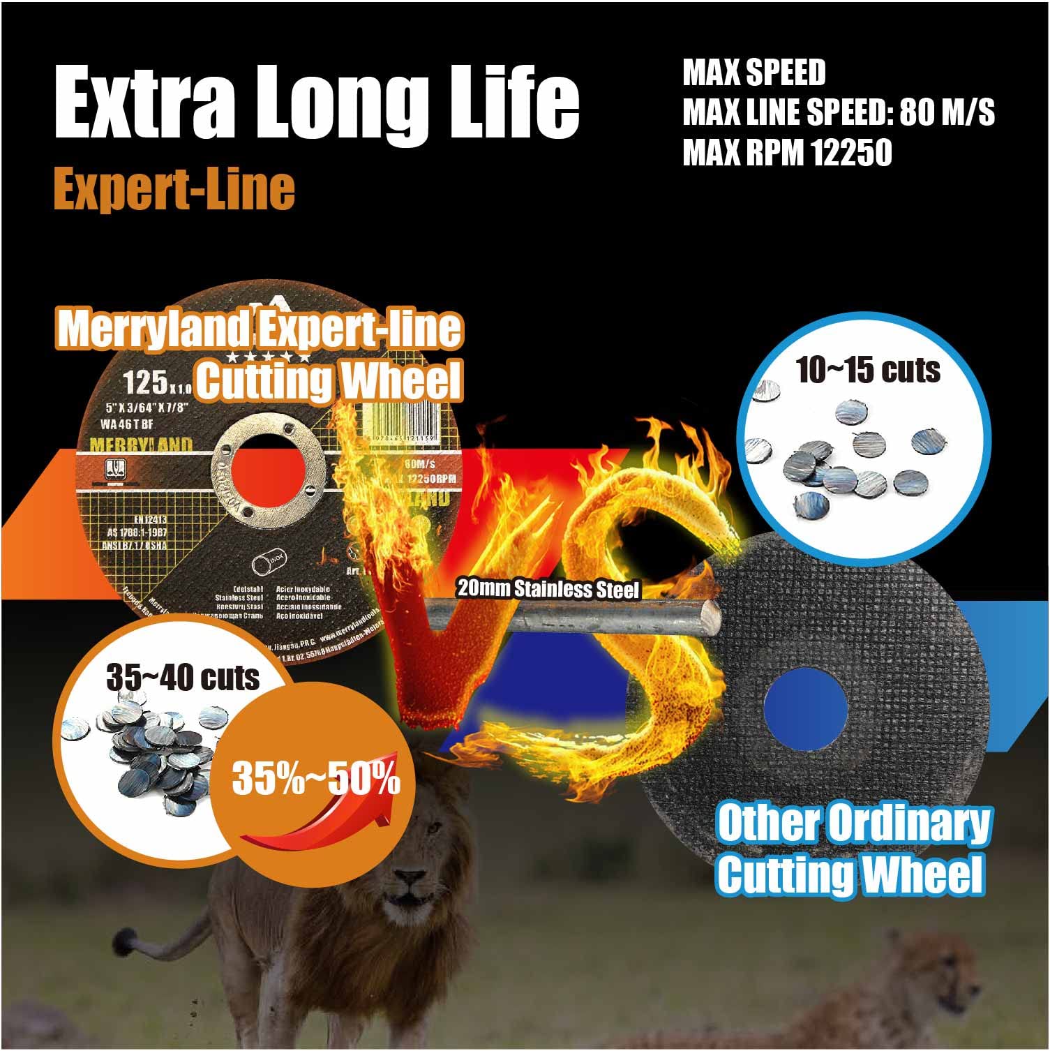 ["【EXTRA LONG LIFE & SMOOTH CUTTING】Merryland cutting disc 76 metal stainless steel for angle grinder. 5 Stars Expert-line. Made of High Quality White Corundum. 35~50% Better than Conventional Cutting Discs. Top Quality & Extra Long Life!",