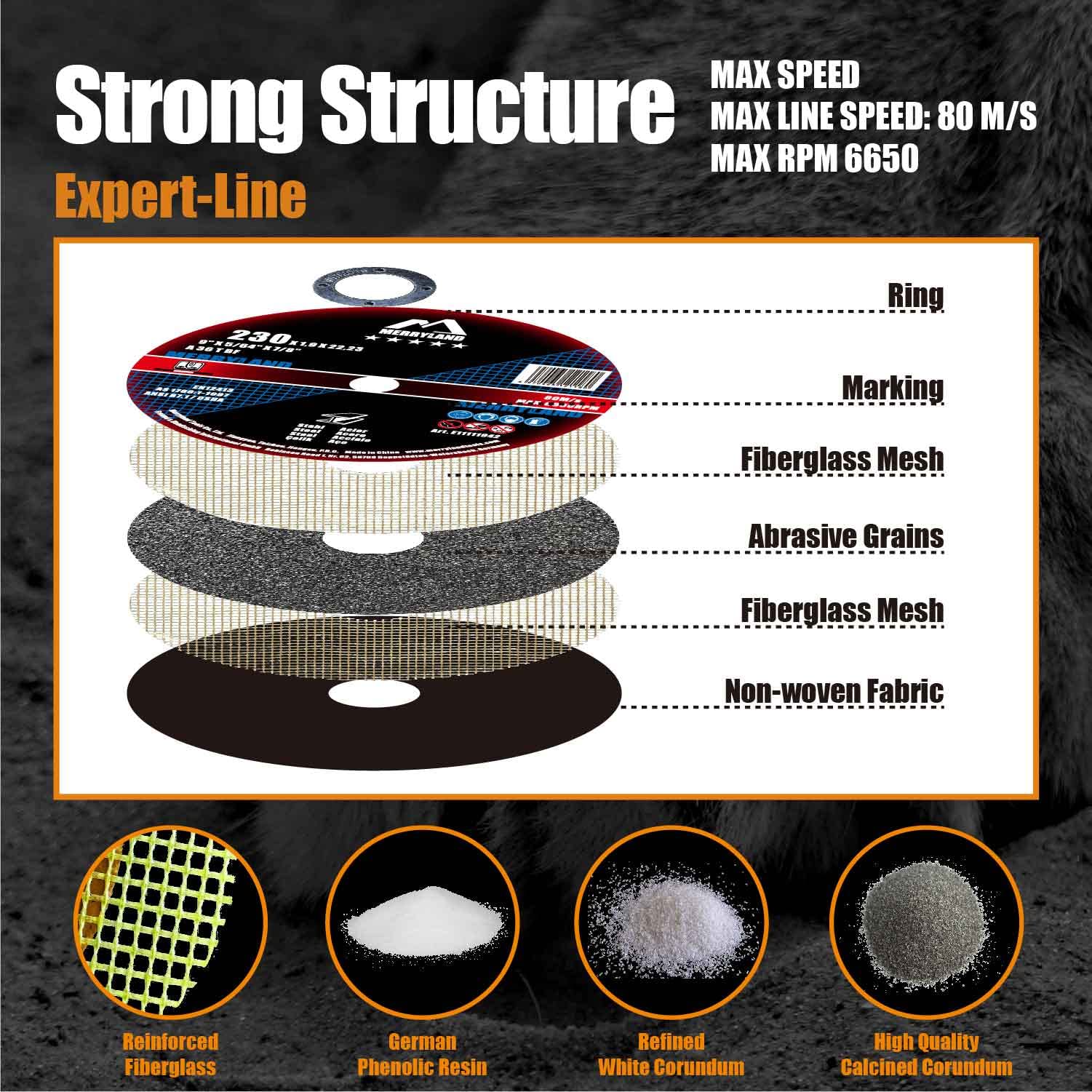 ["【EXTRA LONG LIFE & SMOOTH CUTTING】Merryland cutting disc 230 metal steel stainless steel for angle grinders. 5 Stars Expert-line. Made of High-Quality Calcined Corundum. 35~50% Better than Conventional cutting discs. Top Quality & Extra Long Life!","【REINFORCED STRUCTURE & SAFETY GUARANTEED】230 X 1.9 X 22.23 mm Thin cutting disc. 1.9 mm Thickness Professional Flex Disc, 2 Layers of Reinforced Fiberglass Mesh, Max RPM 6650, According to EN 12413, MPA Certified. Safety Guaranteed!","【WIDE APPLICATION & SPECIAL PURPOSES】Metal, Steel, Stainless Steel / INOX, Iron, Sheet Metal, Plastic, Steel Pipe. Suitable for cutting a variety of materials. E11111942 Especially suitable for cutting steel!","【EASY OPERATION & STABLE PERFORMANCE】Angle grinders and cutting grinders with a diameter of 230 mm and a bore of 22.23 mm are suitable for this disc. Faster and more accurate flex disc!","【MASTER DESIGN & BEAUTIFUL PACKAGING】5 Pieces / Shrink, 25 Pieces / Black Box, A Safety Manual in the Box. An Ideal Gift for Friends and Family who Love Metalworking!"]