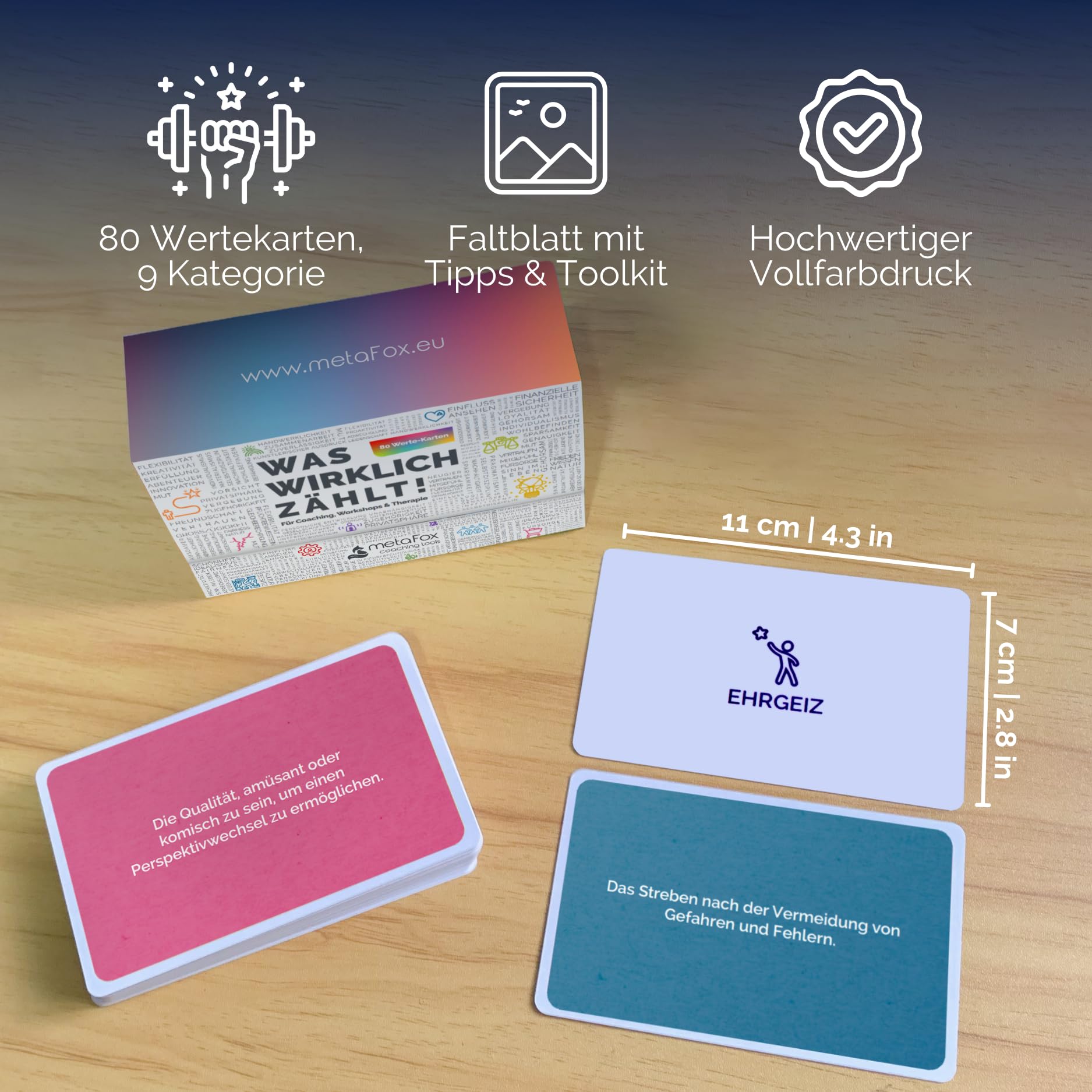metaFox "What truly matters!" - 80 value cards for coaching, workshops, and therapy - For life coaching, act therapy cards, personal values cards, and therapy tools.
