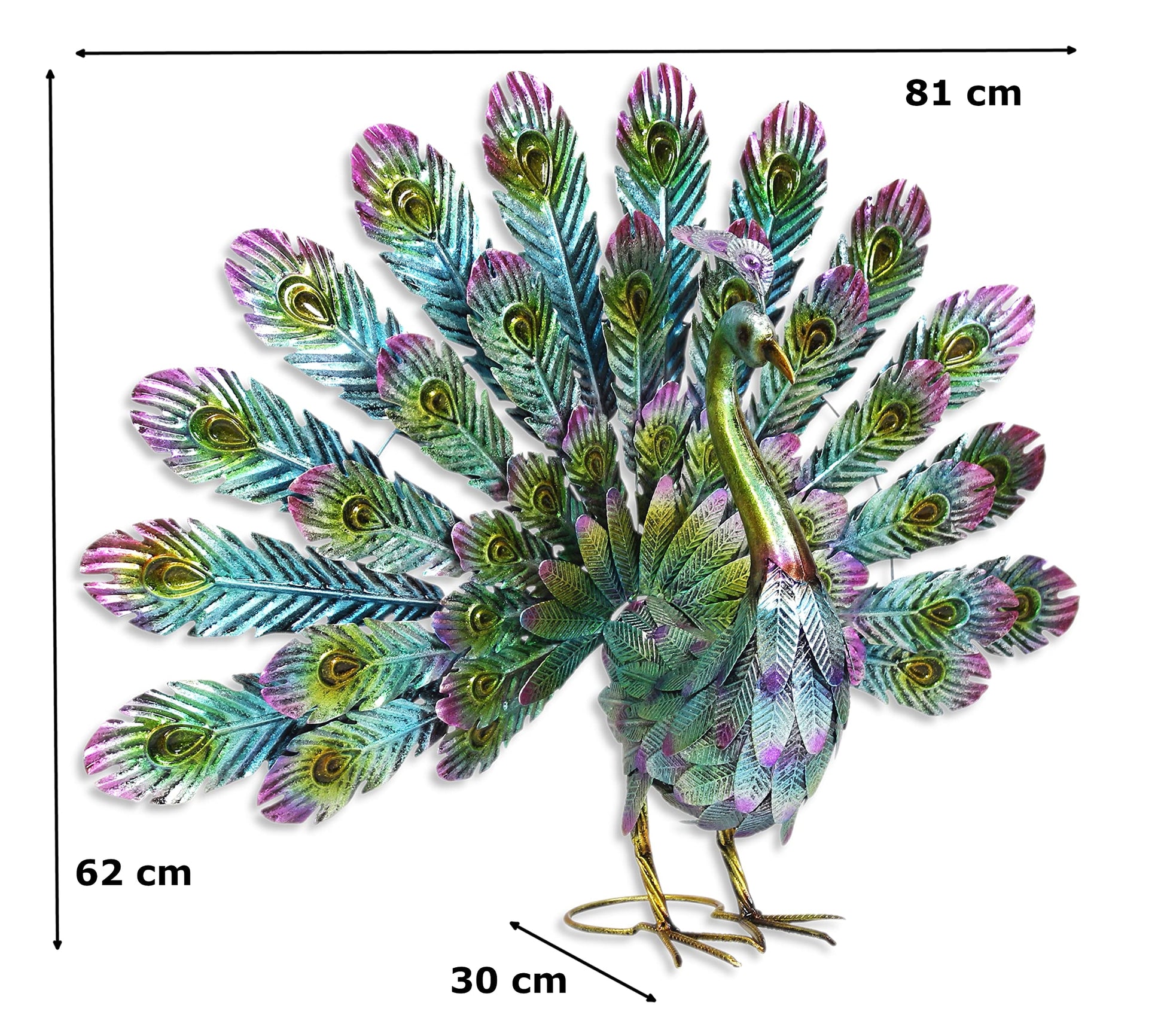 ""Eye-catching and decorative: an absolute eye-catcher as a decorative object, for indoor and outdoor use - whether in the front yard, on the terrace, on the balcony or in the house or apartment, this little animal attracts all eyes,""Modern and large: this colorful decorative figure is hard to beat in terms of color brilliance - with its outstretched plumage, this proud bird really stands out, the wheel is about 32 inches wide,""Sturdy and robust: made of metal and hand-painted, high-quality processed - the assembly is child's play,""Strong colors, shimmer and glitter, especially in the sunshine,""Dimensions: approx. 32 inches wide x 12 inches long x 24 inches high - Weight: 5.1 lbs"