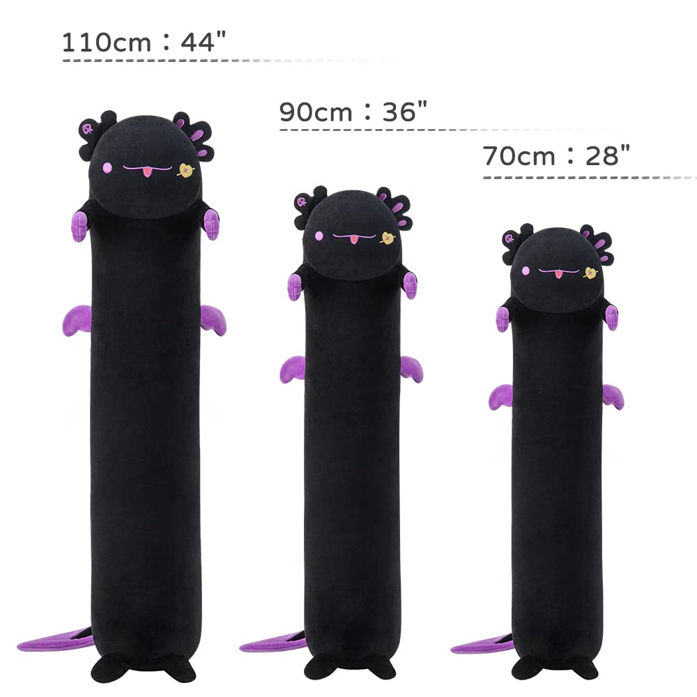 ["Super Soft Black Axolotl: Our kawaii sleeping plush cushion toy is elaborately made from super soft spandex fabric and filled with down cotton. When you hold it in your arms, you will feel comfortable and elastic, with a smooth feel and a delicate texture","Size of the plush doll: 27.5 inches, 35.4 inches, 43.3 inches. They are larger than you imagine, plumper than you expect, and fully unfold you","Multi-purpose body pillow for Axolotl: We offer you not only a hugging pillow in multiple sizes, but also the best lumbar pillow when sitting on a sofa, and also the most comfortable sleep pillow for a sweet sleep on the bed","Cute Axolotl plush toys: With its beautiful and lifelike appearance, this axolotl plush can accompany you or your friends through lonely times. All bad emotions and work stress will disappear when you embrace plush toys","Wonderful gift: This stuffed animal pillow is a sweet gift for birthdays, Halloween, Christmas, Valentine's Day, Thanksgiving, and other commemorations. You can choose these cute Axolotl plush toys to express your care for your girlfriend, family, or boyfriend"]