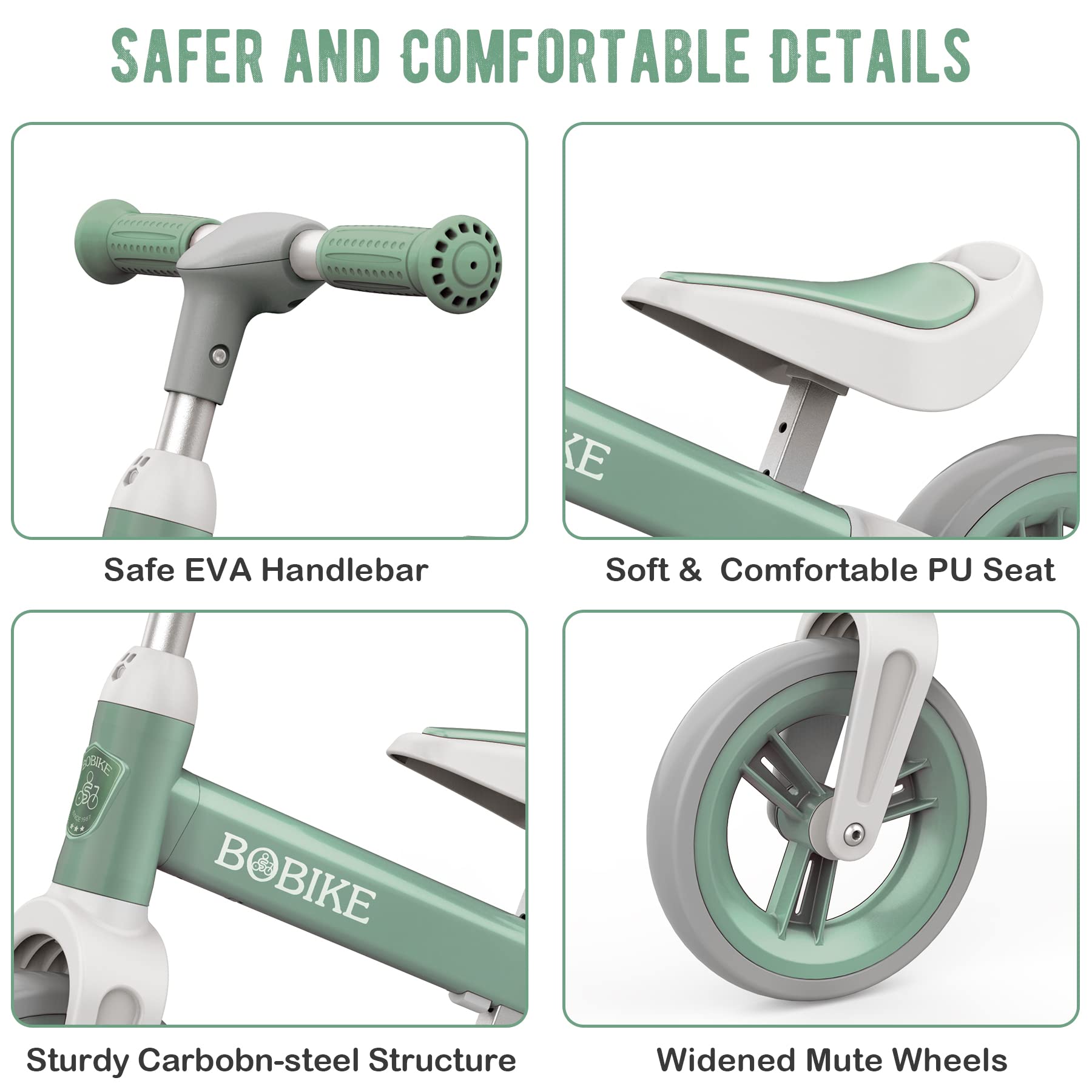 "Child-friendly design: The two-wheeled balance bike is complete, similar to a bicycle, with a body made of strong and durable carbon steel. The adjustable seat and non-slip wheels provide extra safety when guiding your child on the bike."