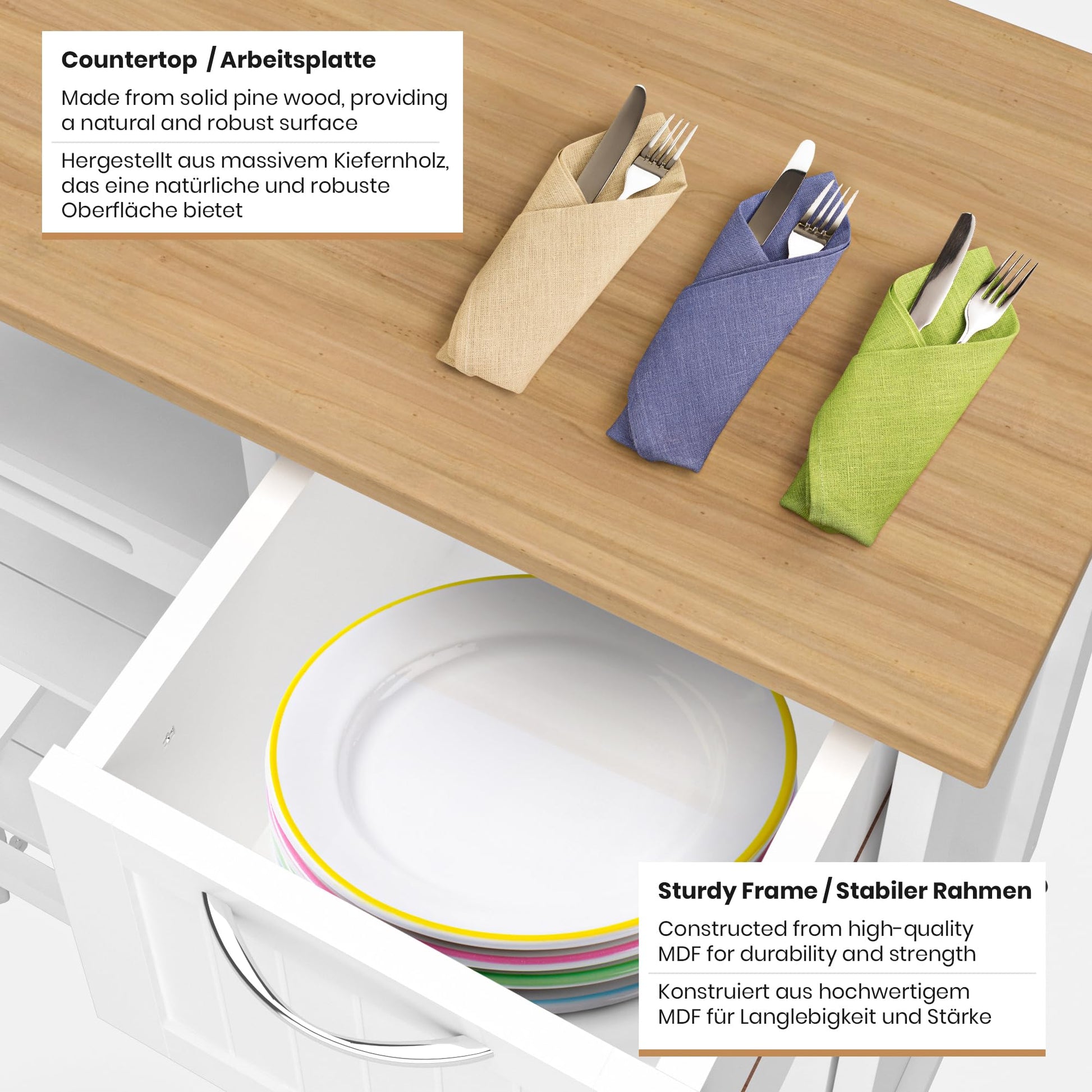 "⭐⭐⭐⭐⭐ COUNTRY STYLE: The natural-colored worktop and white frame of the pine wood trolley are a beautiful addition to your kitchen elements and complement traditional kitchen decor"