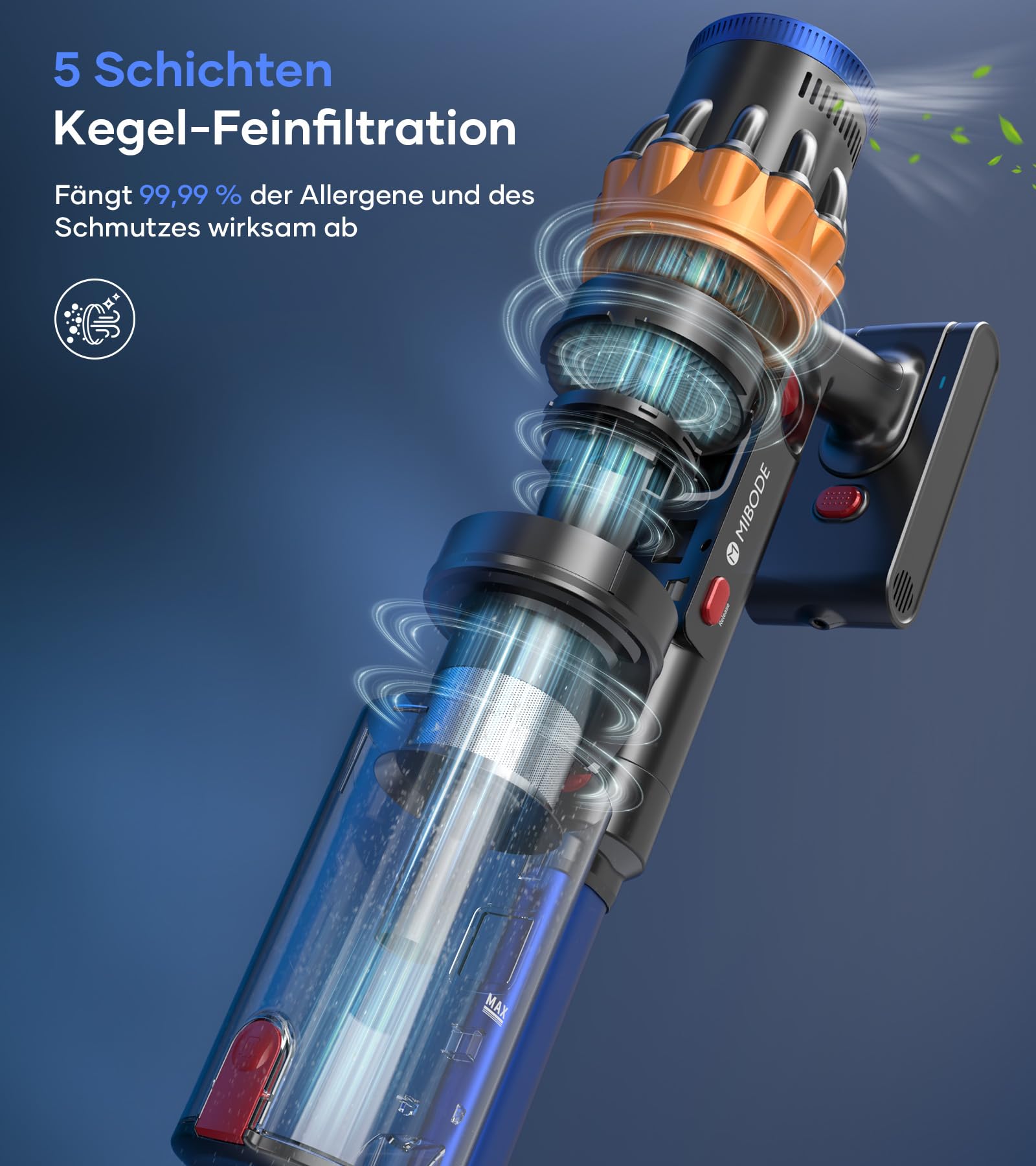 ["Intelligent Cleaning Performance Regulation】The MIBODE cordless vacuum cleaner automatically adjusts suction power intelligently according to the amount of dust and dirt for optimal cleaning results and extended runtime","【45000Pa Suction Power for Efficient Cleaning】The cordless vacuum cleaner features a 550W motor that delivers powerful suction of 45000Pa. Say goodbye to tiny particles, pet hair, and dirt on carpets, hard floors, and tiles. Experience a level of cleanliness like never before","【70 Minutes Long Runtime】Equipped with a large, removable 8x2500mAh battery, the vacuum cleaner extends our cordless vacuum cleaner's cleaning time by 35%. Cleaning the entire living area in one charging cycle is no longer a dream. Additionally, we provide a wall-mounted charging station that only takes 4-5 hours to fully charge","【Effortless Hair Care with Anti-Tangle Brush】The cordless vacuum cleaner is equipped with an improved V-shaped anti-tangle roller brush that effectively reduces hair entanglement. The brush head offers remarkable flexibility, moving sideways from 0° to 180° and up and down from 0° to 90°, along with bright LED lights for better corner cleaning","【All-in-One LED Smart Touchscreen】Our vacuum cleaner features a user-friendly LED Smart HD Display touchscreen. Everything is within your reach. You can easily adjust suction power, monitor the real-time status of the battery and vacuum cleaner, track your cleaning progress accurately, and enjoy the convenience and fun of intelligent cleaning","【99.99% Efficient Filtration + 1.6L Large Dustbin】The cordless vacuum cleaner is equipped with a dual cyclone structure that ensures effective filtration. The 5-layer filtration system removes 99.99% of tiny dust, bacteria, and dust mites under 0.3μm. The 1.6-liter dustbin provides sufficient capacity for cleaning the entire house. Ideal for allergy sufferers and pet owners","【Dedicated After-sales Customer Service】If you have any questions, please feel free to contact us. We guarantee to solve your vacuum cleaner problem within 24 hours. Then just leave us a message if you need accessories and don't know where to buy them. We are always here to help. A problem with this"]