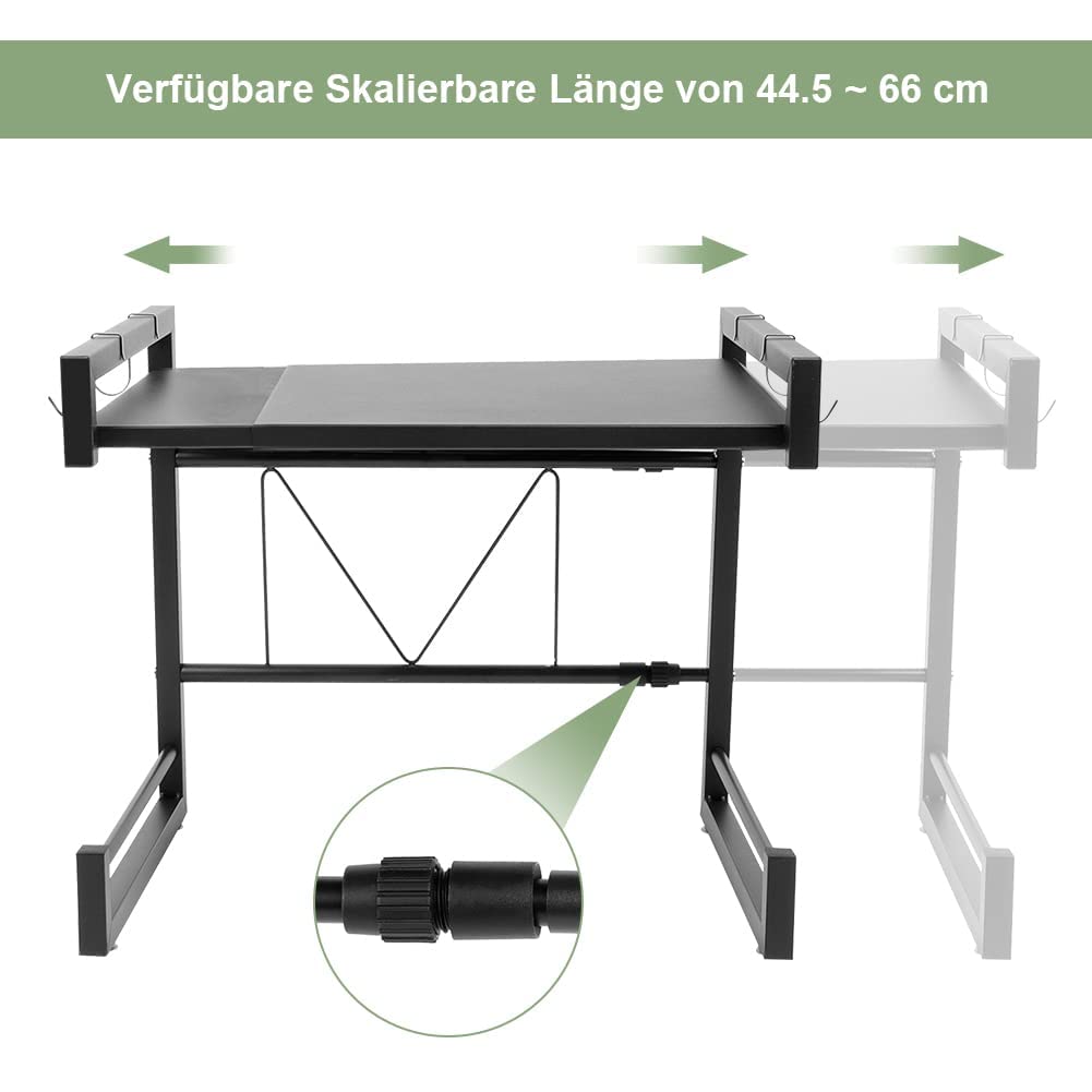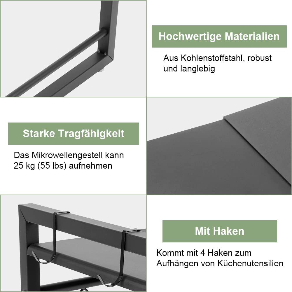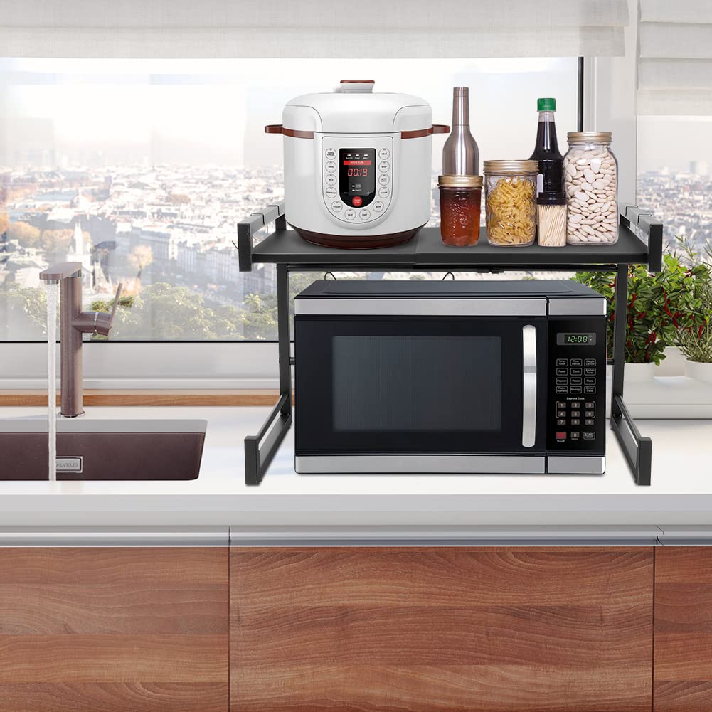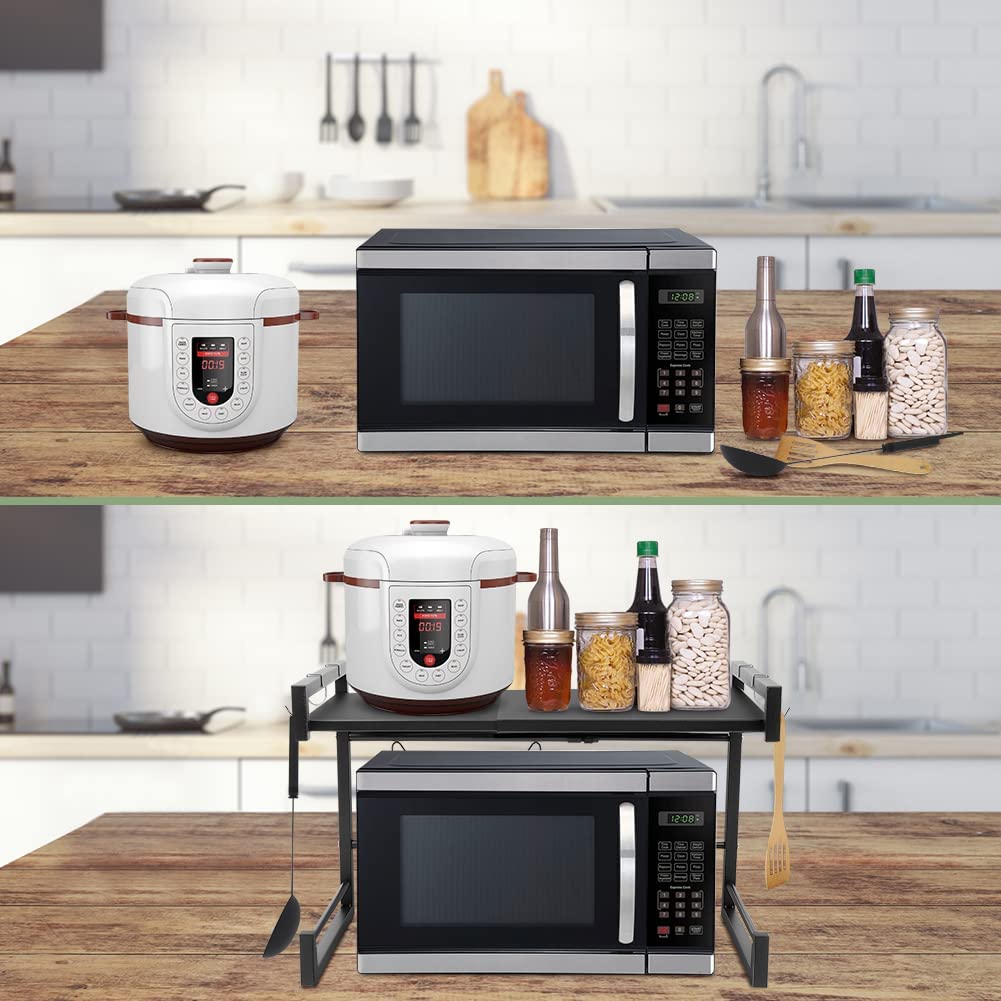["High-quality carbon steel material: The metal microwave oven rack is made of carbon steel and can support a weight of 55 lbs. The rack is strong enough to hold a microwave oven and other kitchen utensils such as dishes, spices, jams, condiments, bottles, plates, pots, and pans.","Adjustable kitchen shelf: The length of the microwave shelf can be adjusted (17-26 inches) and the shelf allows for easy storage of the microwave or other kitchen utensils, making the kitchen tidier.","Wide range of applications: The microwave shelf is suitable for kitchen, cabinet, garage, shower room, and other storage spaces. The 4 removable hooks provide additional storage space for pot holders, cooking utensils, or paper towels.","Stable support: Two support rods are welded on both sides of the front frame. After finishing cooking utensils, the rack can be more stable, without slipping or tipping over.","Easy to clean: Customizable retractable kitchen countertops can be built and adjusted to the correct length of your countertop. The stand can be placed on any flat surface and is easy to clean."]