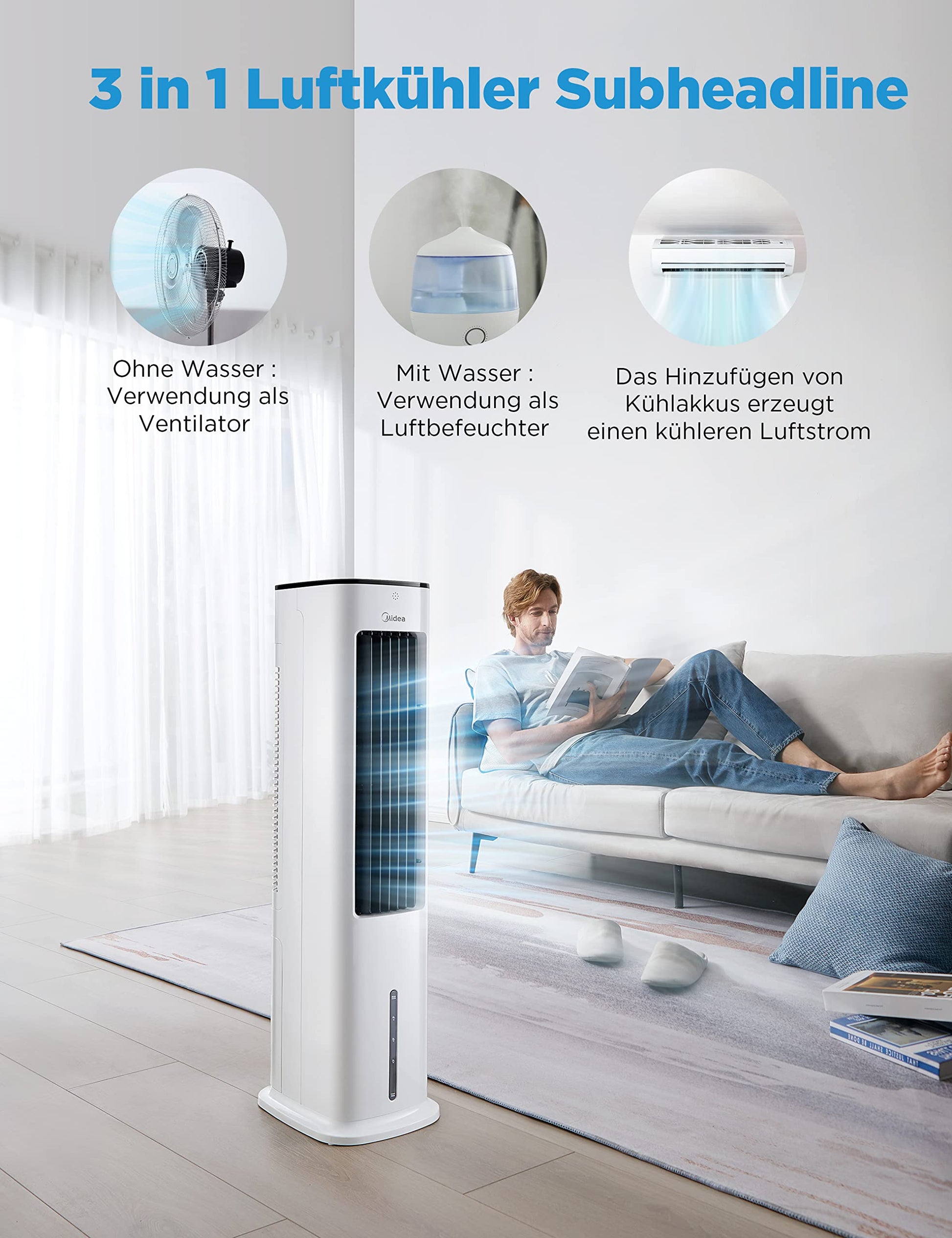 ["Portable air conditioner without exhaust hose - fan, humidifier, and air purifier in one unit! Thanks to the 5L water tank, dry air is humidified during cooling. The Midea air conditioner impresses with extremely low energy consumption and very high capacity. The integrated air purification function prevents animal hair, dirt, and lint in the air, making it suitable for allergy sufferers","Air cooler 3 speeds & 7-hour timer - a gentle natural wind mode, a very quiet night mode, and a stronger, normal wind mode. With a 7-hour timer, you can sleep peacefully at night. The oscillation can be set vertically or horizontally to circulate the air in different directions","Portable Mobile Air Conditioner - Space-saving & portable design Due to the unique tower design, this quiet air cooler from Midea is very light and small, fitting in any room. Thanks to the hidden handle, the unit can be easily and conveniently carried","Safe & Easy to clean - Unlike conventional air conditioners, this one has removable filters that are easy to clean. Remove the rear cover and take out the water tank. The intelligent warning function alerts you to water scarcity, so you can always keep an eye on the water level. If the water tank is empty or the cover is removed, the fan pump will automatically shut off for safety reasons","Warranty Don't worry about the quality. In addition to the statutory warranty, we offer a 3-year warranty on this Midea air cooler"]