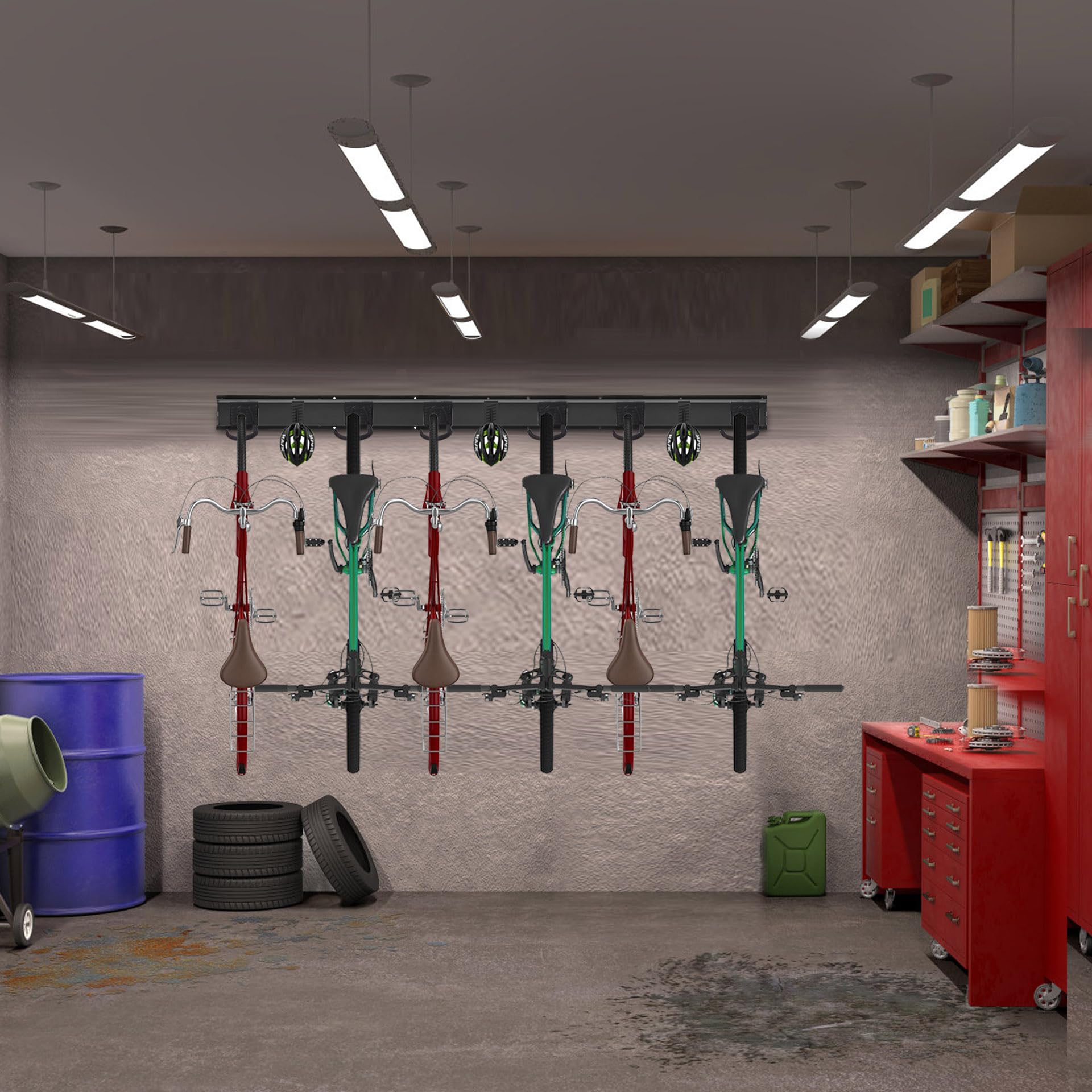 ["INDIVIDUAL SOLUTIONS FOR BIKE STORAGE - Our bike wall mount made of sturdy steel material is designed for wall mounting and can hold up to 6 bikes and 3 helmets. With this holder, you can easily hang your bikes and keep your home or garage organized and tidy.","SPACE-SAVING - Our bike wall mount allows you to securely attach your bikes to the wall, saving valuable space in your garage. The mount is compatible with most adult and children's bike types, such as road bikes, city bikes, touring bikes, and more.","ADJUSTABLE & EASY TO POSITION - The hook of the bike wall mount is adjustable and flexibly positionable. It can lock into the rail and be moved along the rail as needed. Quick wall mounting allows for easy sliding and moving of the hooks on the rails when your storage needs change.","DURABLE MATERIAL - Our bike wall mount is made of powder-coated steel with a durable epoxy finish. It resists rust, chipping, and cracking. The hooks are equipped with a scratch-resistant rubber coating to protect your valuable bikes from damage.","QUICK INSTALLATION - You only need an electric drill and a level to ensure that the mount is perfectly aligned when installing."]