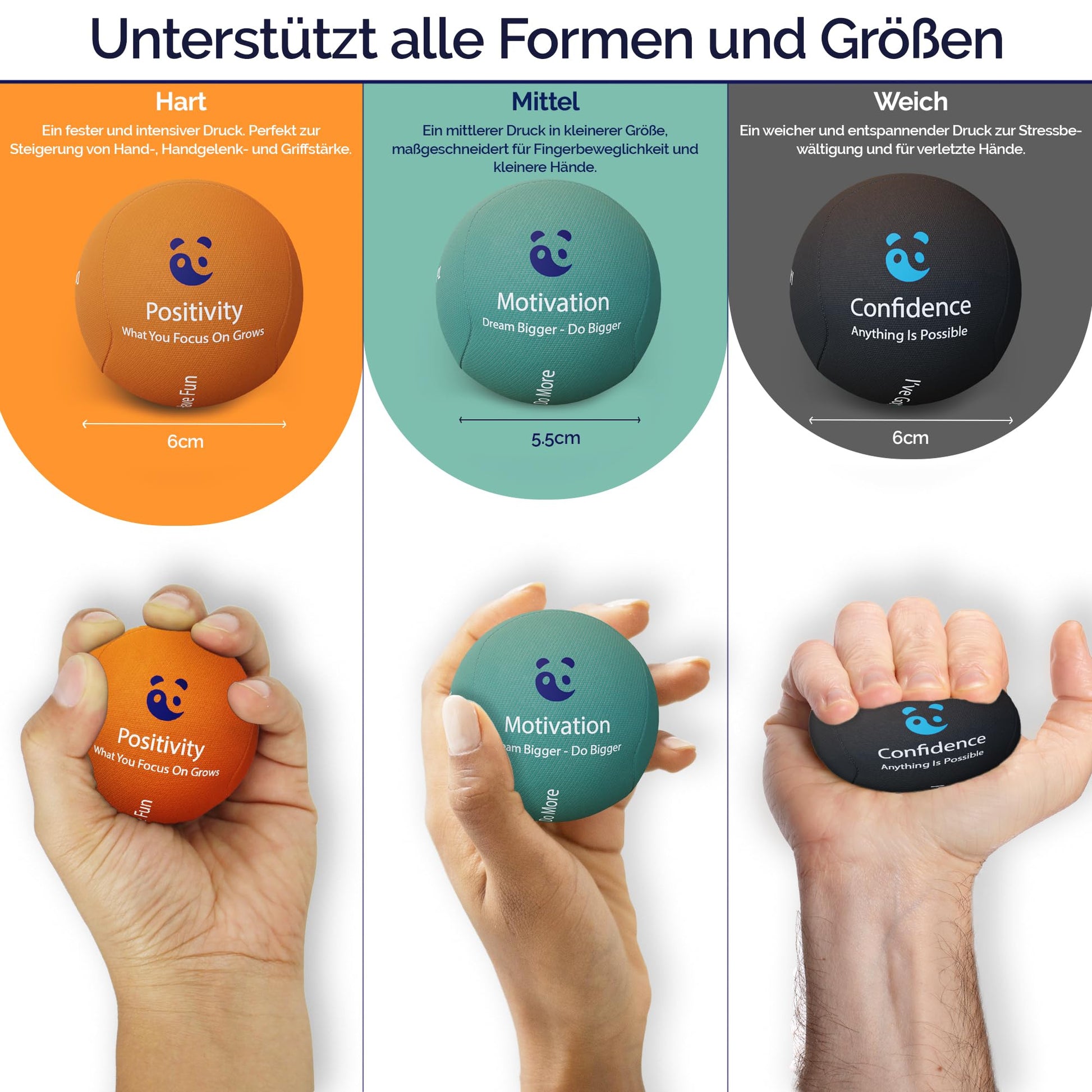 For every situation - Each expert-designed anti-stress ball is dedicated to a specific theme, promotes positive self-talk, helps reduce stress and anxiety, and thus enhances mental well-being.