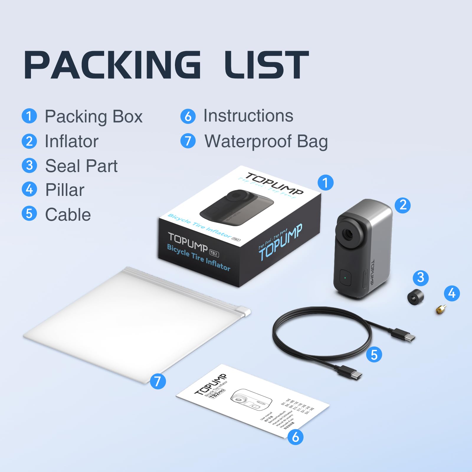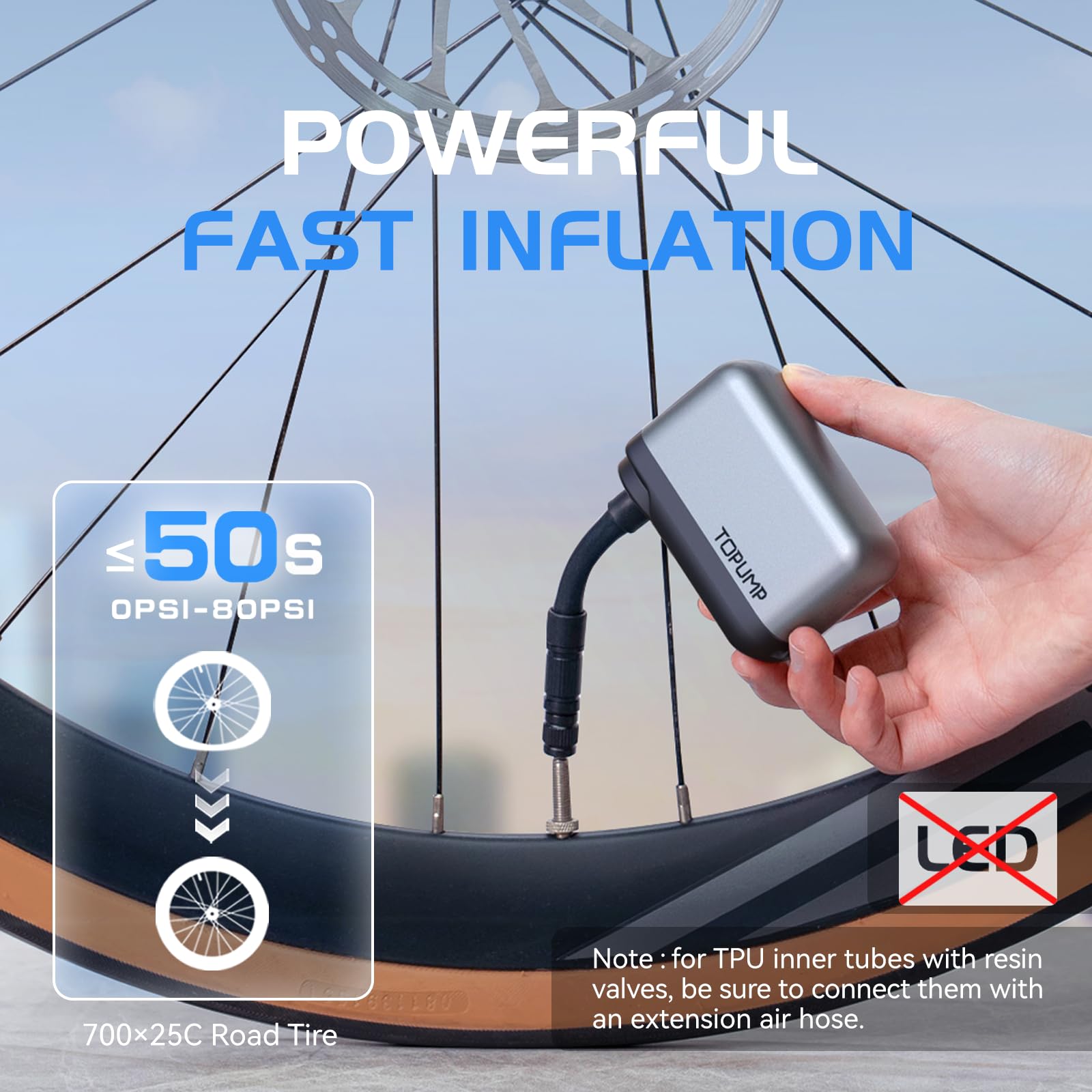 ["COMPACT SIZE AND USER FRIENDLINESS. With a weight of only 0.28 lbs and dimensions of 2.1 x 1.3 x 3 inches, the TOPUMP Mini Electric Bike Pump is compact and easy to carry. The simple one-button operation ensures user friendliness. *Note: Keep digital displays out of strong sunlight.","EFFICIENT AND FAST INFLATION. The mini battery-operated bike pump delivers a fast airflow of 15 L/minute and reaches 80 PSI (700*25C road tire) in just 50 seconds. No long waiting times to get back on the road quickly and enjoy your ride. *Note: Keep away from children, use an approved safety device, wear safety gear when operating.","FAST CHARGING & POWERFUL. The electric road bike pump is powered by USB Type-C and fully charged in just 30 minutes. Once charged, this electric bike pump can inflate at least three 700*25C tires from 0 to 120 PSI. *Note: Keep Auto-Stop-Function out of reach of unattended children.","DUAL NOZZLE DESIGN. Our mini bike pumps are compatible with Schrader and Presta valves for different types of bike tires, without the need for additional adapters or head swaps.","NOTE. 1. If the desired air pressure is over 100 PSI, please use the hose to prevent air leakage from the nozzle. 2. When using TPU hoses with resin valves, make sure to connect them with an extension hose to prevent the valves from melting due to overheating.","RELIABLE CUSTOMER SERVICE. The mini electric bike pump has undergone rigorous testing and has CE, FCC, and UKCA certifications. You can enjoy 24/7 support and a two-year warranty."]