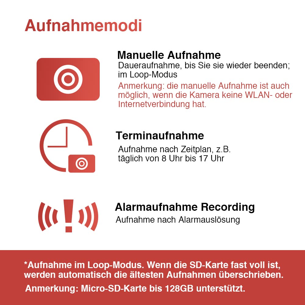 [Continuous loop recording and additional options] Camera supports continuous loop recording (micro SD card required, not included). Camera can continue recording even without Wi-Fi or internet. Can be used as a digital camera in the car, on a bike, or during outdoor activities. Other recording modes: alarm recording, scheduled recording (daily fixed times).