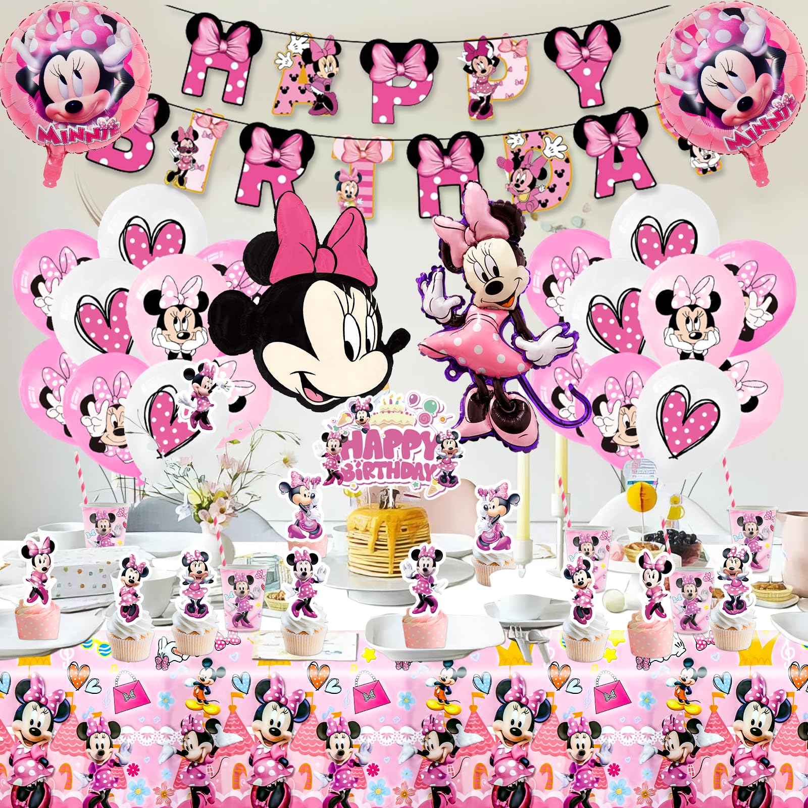 Minnie Mouse paper plates for kids birthday party décor - 100 pieces of pink Minnie birthday party supplies, Mickey birthday decorations for girls, partyware set includes napkins, tablecloth, balloons, banner, and cake decorations.