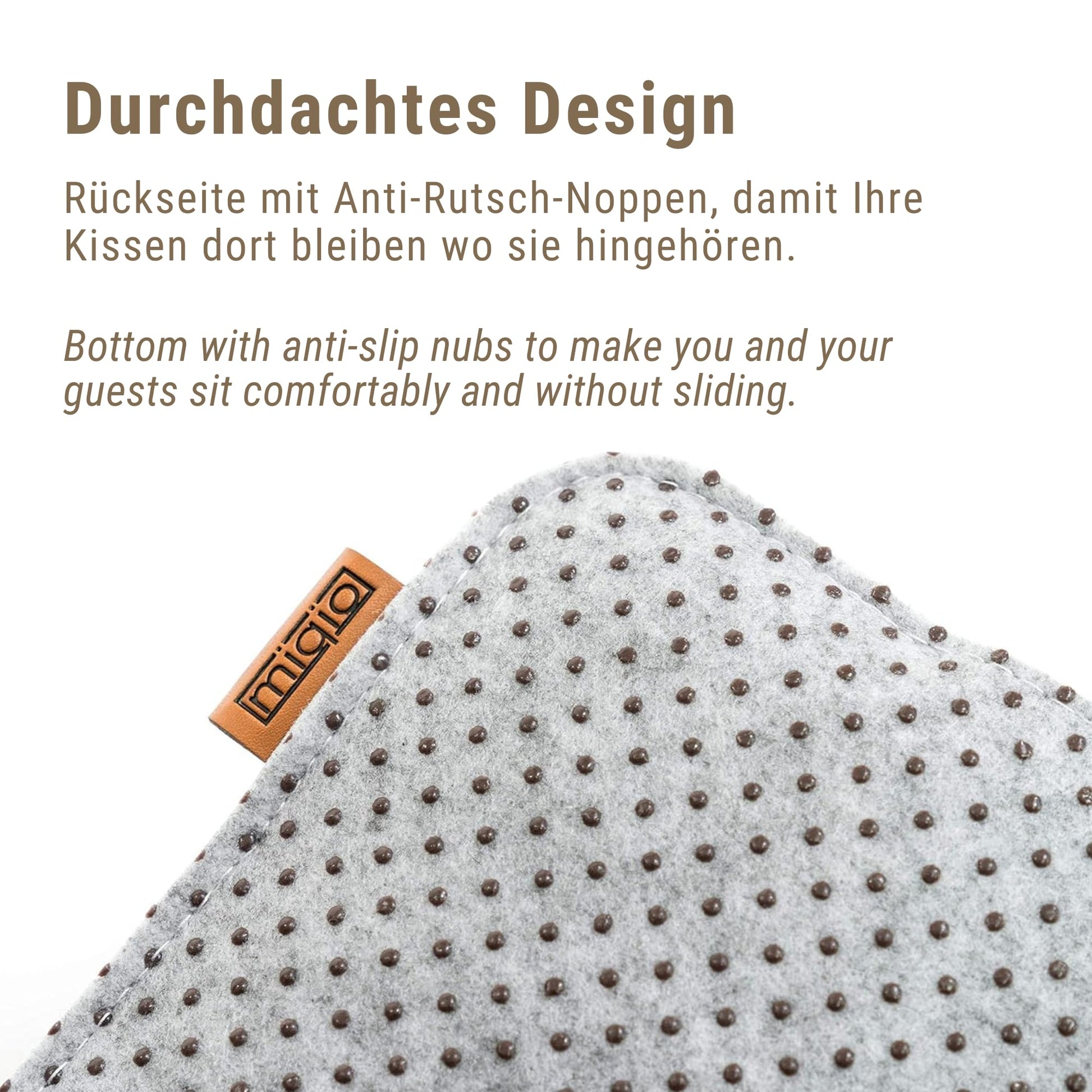 "DECORATIVE ELEMENTS MADE OF GENUINE LEATHER: With the minimalist design of the felt seat cushions from MIQIO with clear lines and the discreet leather label, you prove taste and your love for branded products. Available in dark grey and light grey, a real eye-catcher!"