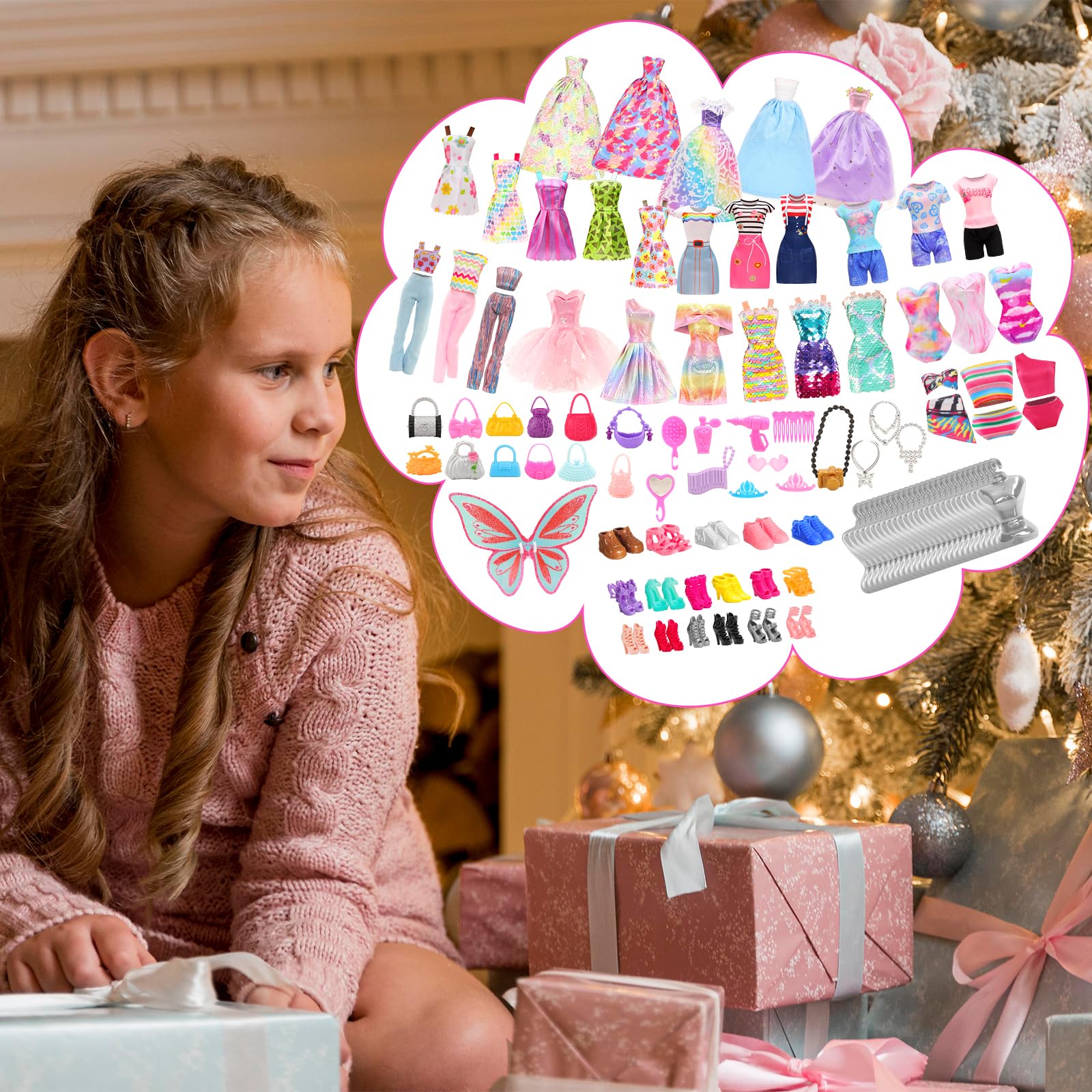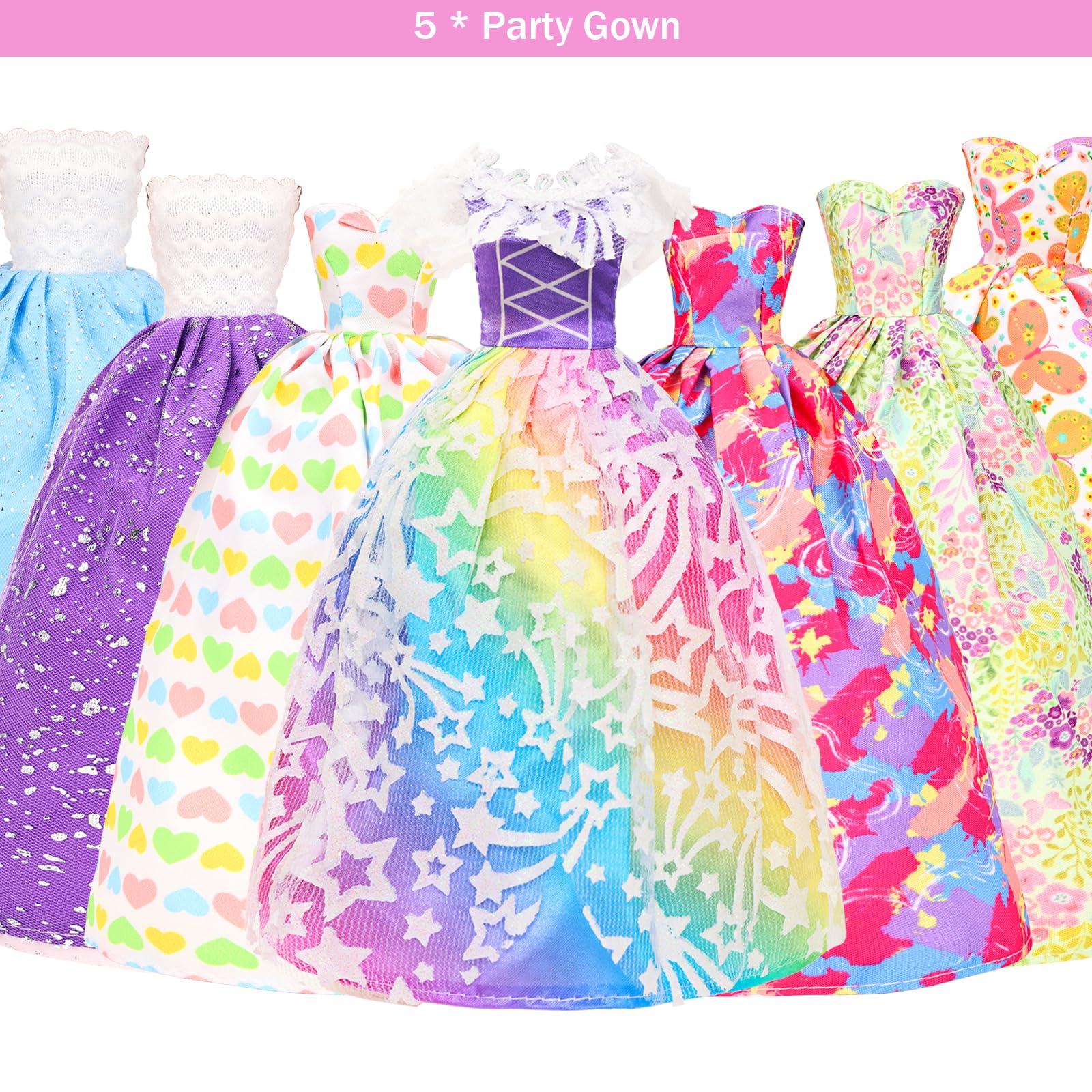 ["Good quality: Modern dresses made of high-quality material. Better craftsmanship than other similar products on the market.", "Package includes: 5 evening dresses + 10 fashion dresses + 2 tops + 2 pants + 2 swimsuits + 30 shoes (15 pairs) + 1 fairy wing + 40 hangers + 5 handbags + 13 crown necklace accessories for 11.5\" / 30 cm girl dolls (DOLLS NOT INCLUDED).", "Random shipping: Beautiful fashionable dress, skirt, top, pants, shoes for dolls. All our dresses are specially designed to provide you with a beautiful and dreamy experience. Random shipping. Surprise upon receipt.", "Promote creativity: A variety of different costumes included. Girls can dress dolls according to their wishes to improve their thinking and practical skills.", "Gift for girls: Our products can make the princess in a girl's dream come true. Perfect gifts for girls as Xmas, Christmas, Children's Day, birthday, and holiday gifts."]