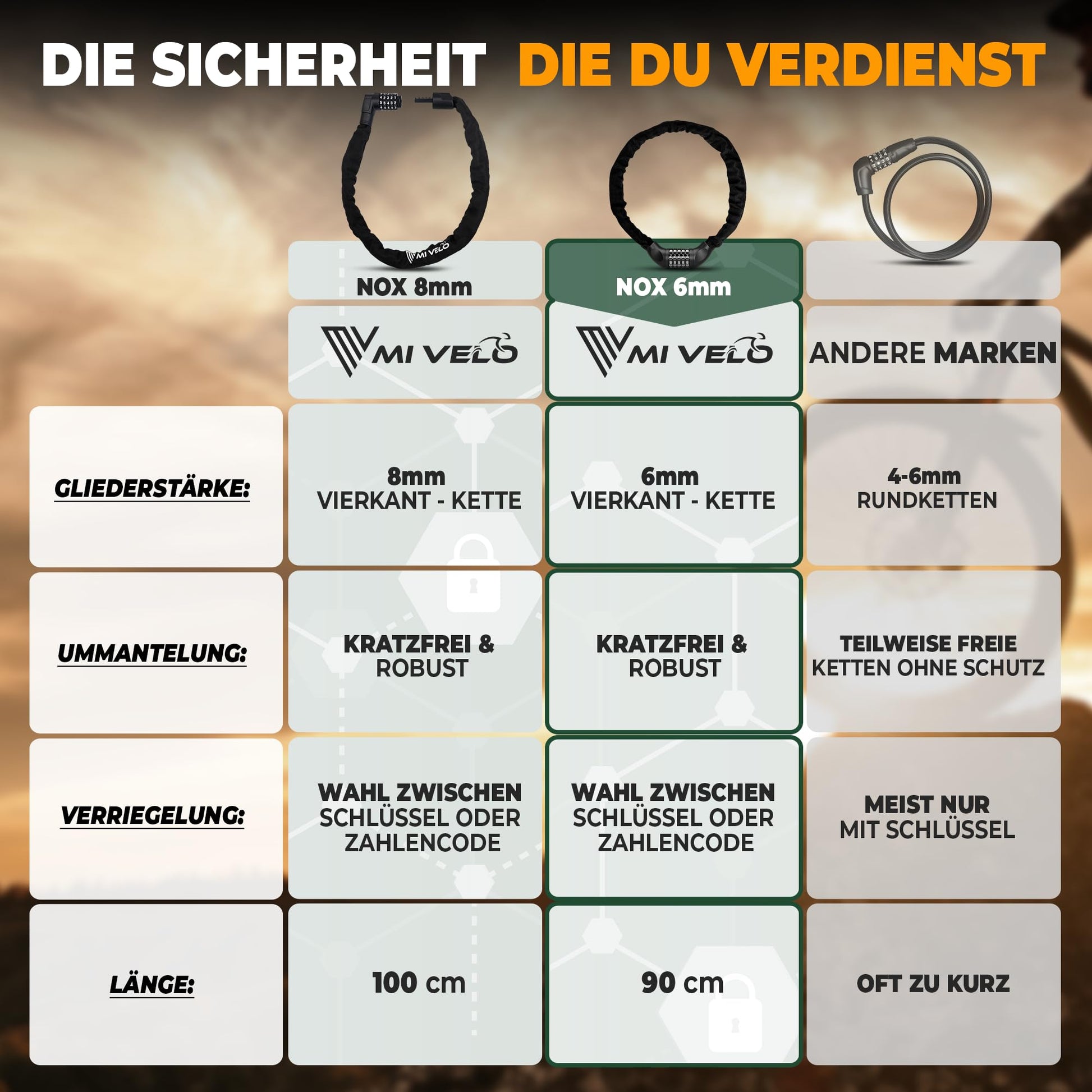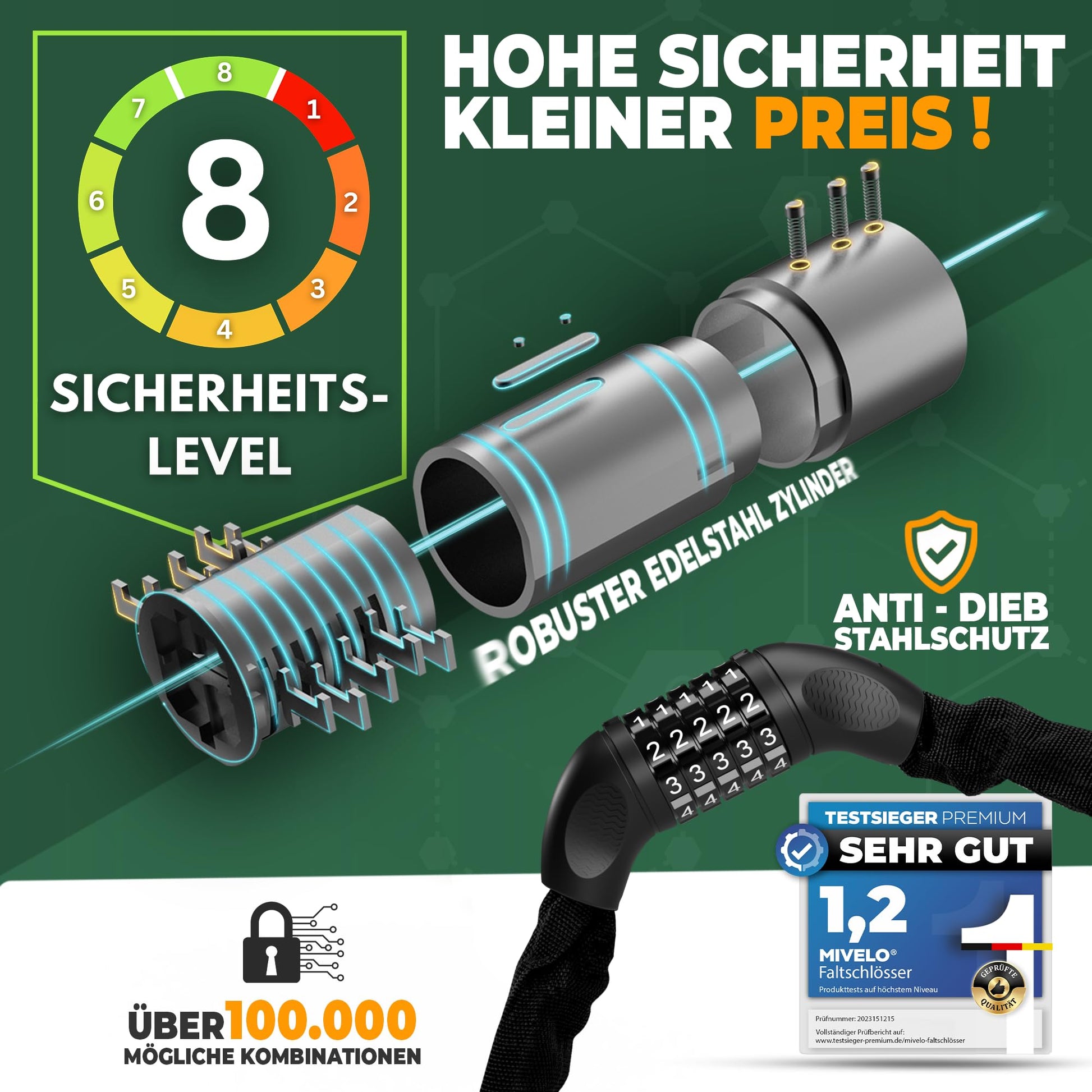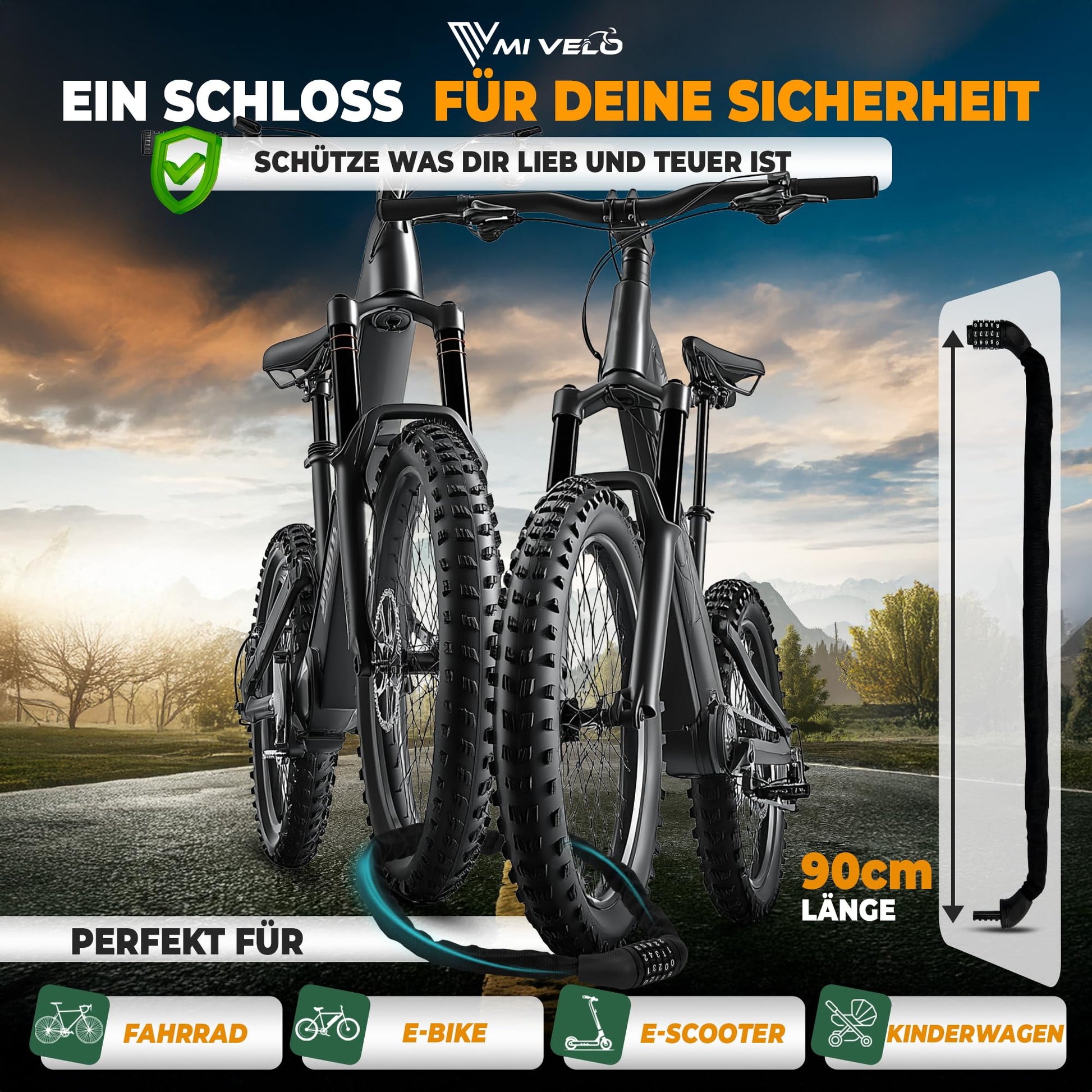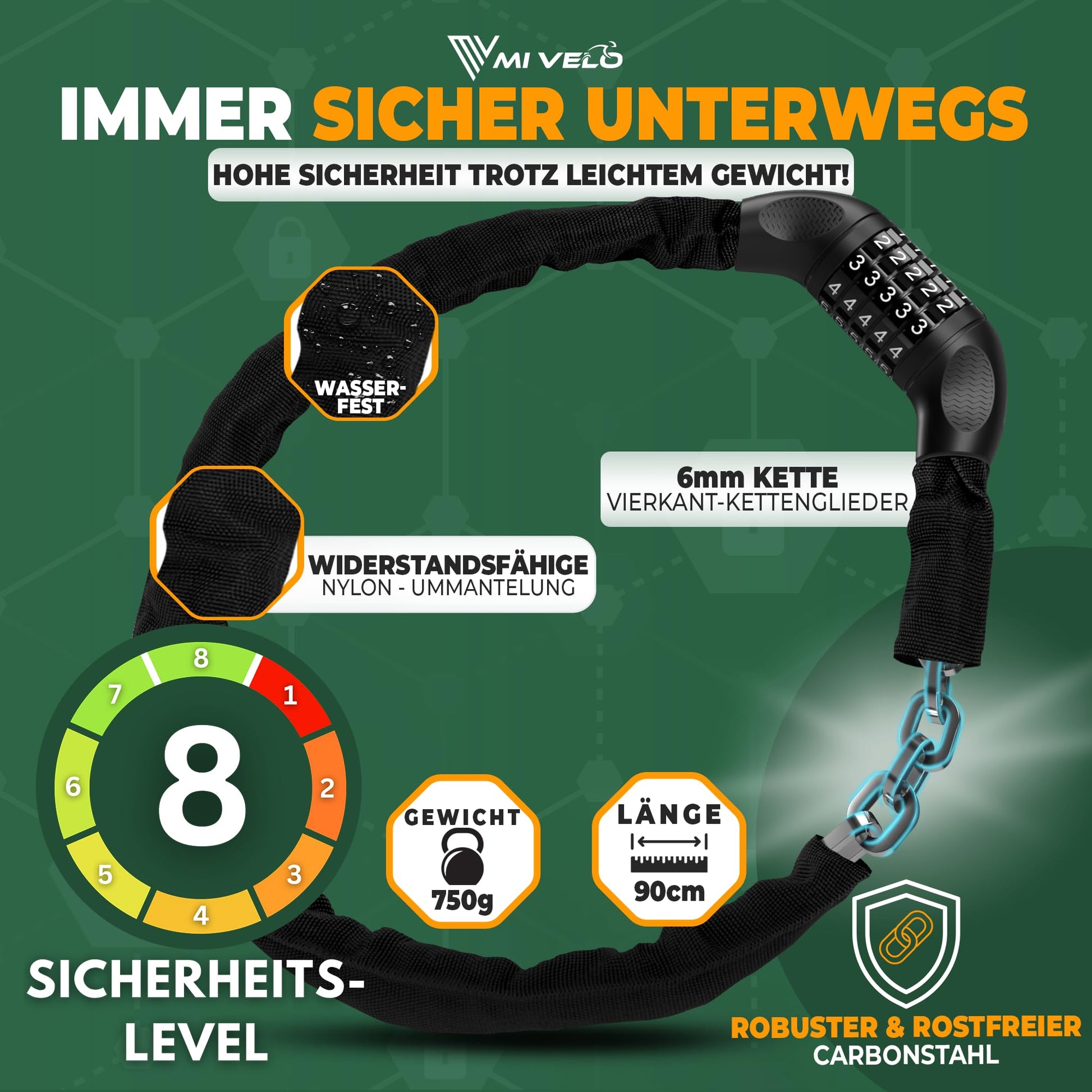 ["HIGH SECURITY - The bicycle chain lock is robustly built and consists of hardened and corrosion-free square steel links. The nylon coating of the lock feels comfortable in the hands and protects your bike or scooter from scratches.","EASY TO USE - Thanks to our Safe-Secure locking cylinder, the lock can be quickly & easily locked and protects against tampering. Due to its light weight, the bike lock is also perfect for children. Our Safe-Secure locking cylinder offers you in the combination lock chain 100.00 possible combinations.","UNIVERSALLY APPLICABLE - Whether for bicycles, e-scooters, e-bikes & co, our chain lock is the perfect protection for you! With a length of 90cm, the lock is comfortable to handle and can be easily attached to trees, bike racks, or lampposts, etc.","ALWAYS SAFE ON THE GO - With our bicycle lock security lock with security level 8, you don't have to worry about your bike, e-bike, or scooter even in high-security risk cities. Our Safe-Secure locking cylinder provides optimal protection against tampering without jamming.","CUSTOMER-ORIENTED FAMILY BUSINESS - MiVelo is a young family business from Kraichgau, which focuses on high-quality bicycle products and reliable customer service to create the best possible customer experience. We guarantee 100% satisfaction, or your money back!"]