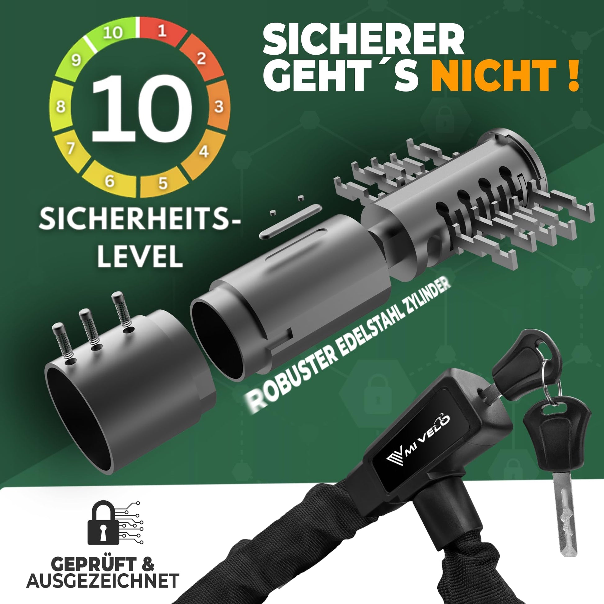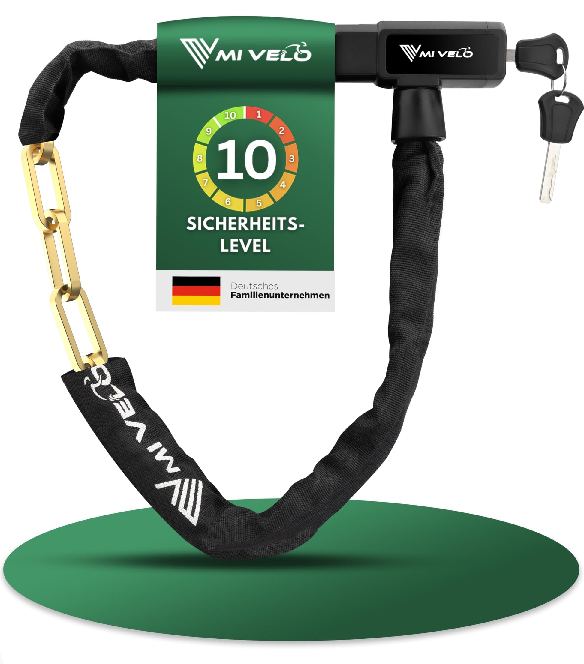 ["HIGH SECURITY - The bicycle chain lock is robustly built and consists of hardened and corrosion-free square steel links. The nylon coating of the lock feels comfortable in the hands and protects your bike, e-bike, or scooter from scratches.", "EASY TO USE - Thanks to our Safe-Secure locking cylinder, the lock can be quickly & easily locked and protects against tampering. The integrated dust protection additionally prevents the key from jamming. Due to its light weight, the lock is also perfect for children.", "ALWAYS SAFE ON THE GO - With our bicycle chain lock with security level 10/10, you don't have to worry about your bike, e-bike, or scooter even in high-risk large cities. Our Safe-Secure locking cylinder provides optimal protection against tampering without jamming.", "UNIVERSALLY APPLICABLE - Whether for bicycles, e-scooters, or e-bikes & Co, our chain lock is the perfect protection for you! With a length of 85cm, the lock is easy to handle and can be easily attached to trees, bike racks, or lampposts, etc.", "CUSTOMER-ORIENTED FAMILY BUSINESS - MiVelo is a young family business from Kraichgau, which focuses on high-quality bicycle products and reliable customer service to create the best possible customer experience. We guarantee 100% satisfaction, or money back!"]