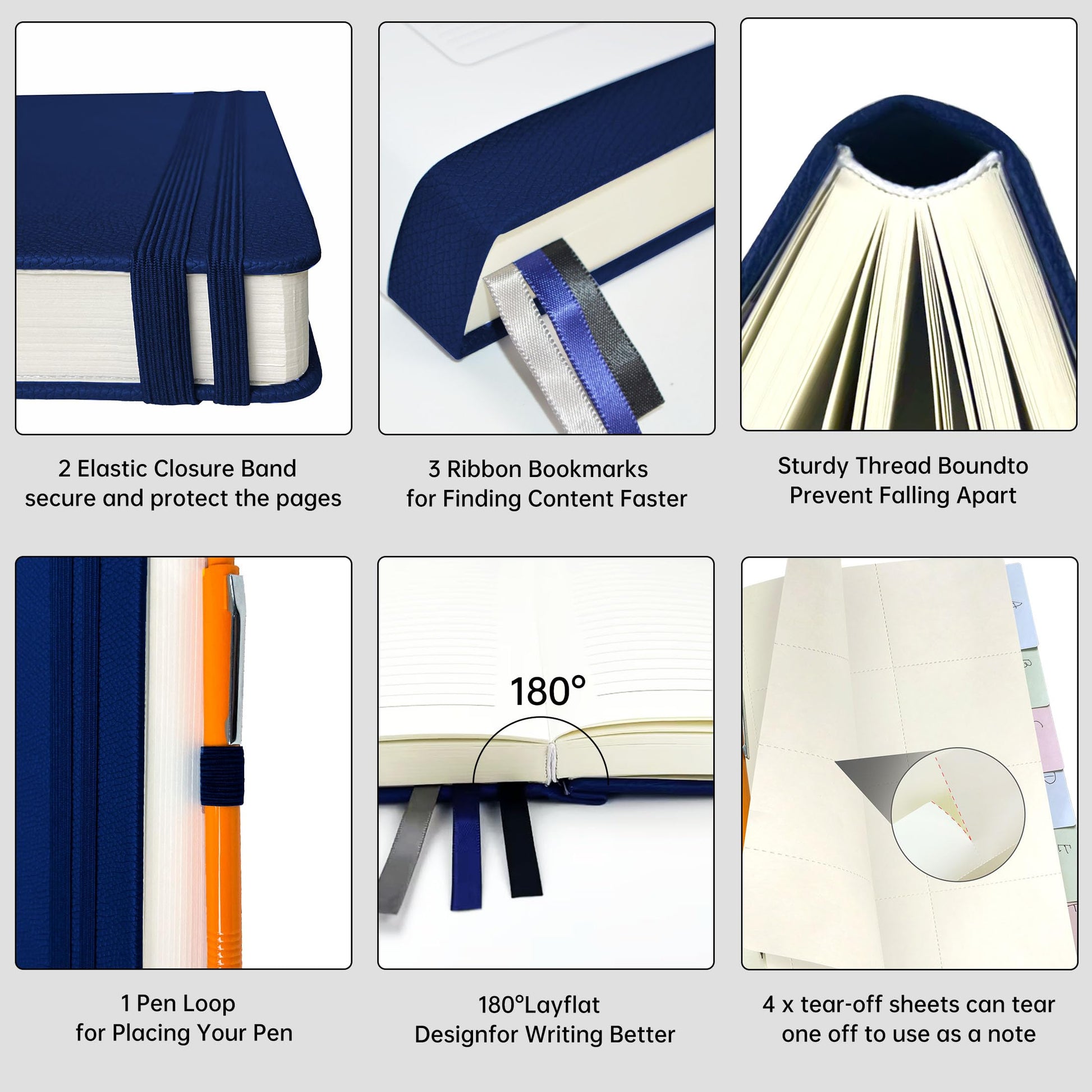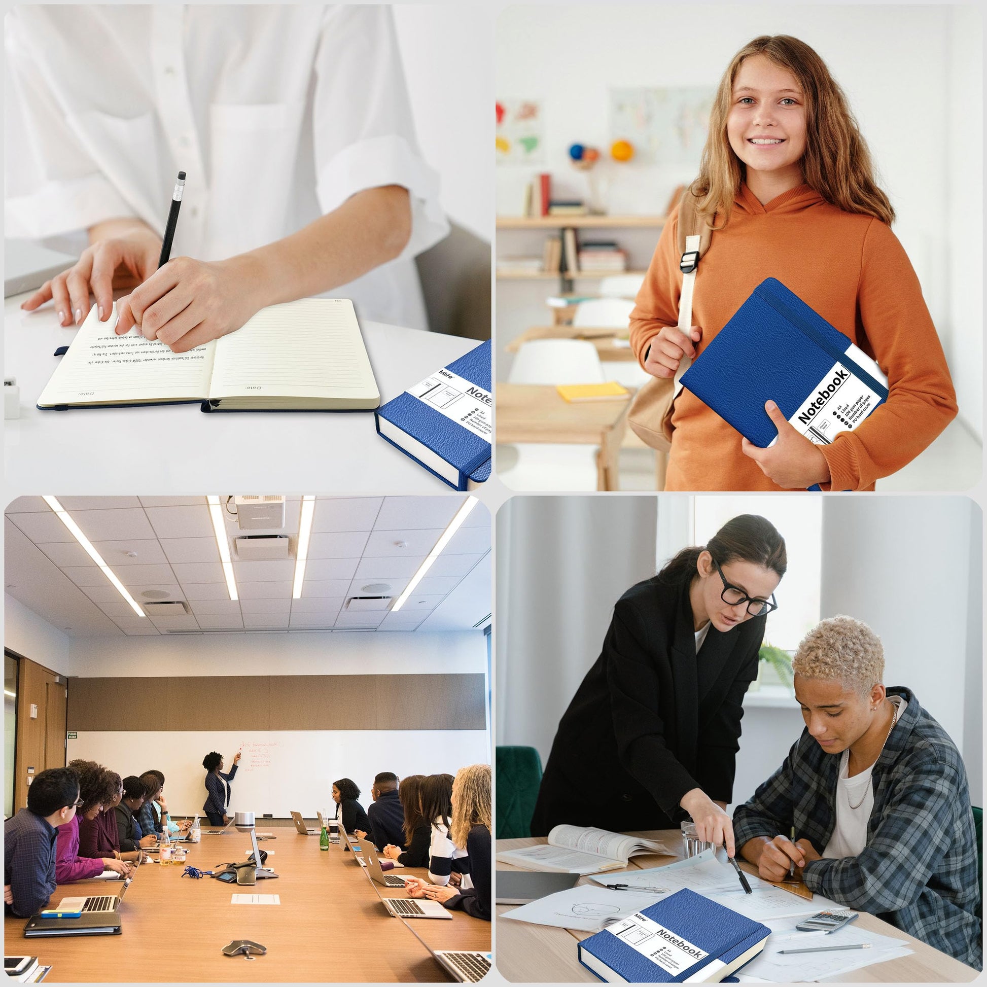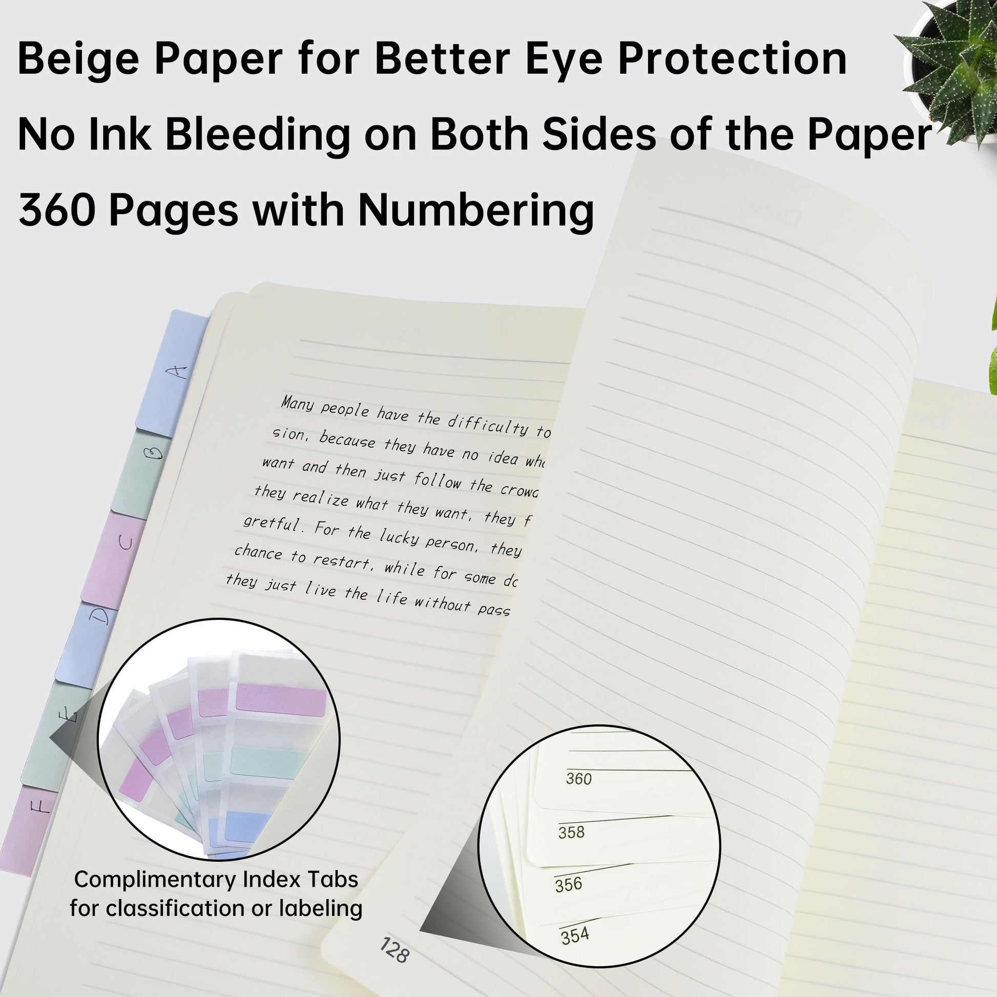 ["Mlife A4 Notebook: 360 pages with numbering and extra 4 tear-out pages, you can tear off the individual page and use it as a notepad. It size of 20.5 x 29 x 3cm, available in a wide range of carefully selected colors to meet your needs for various occasions.","Friendly Design: The A4 lined notebooks feature 2 elastic bands, 3 bookmarks, 2 expandable pockets on the back, 1 x pen loop, 5 x 3 free sticky notes, and a rounded design for more user-friendliness.","High-quality 100gsm paper: Hardcover college block notebook uses 100GSM thick paper, thicker than ordinary paper and prevents ink from bleeding through. The notebook page is lined with a width of 7mm to prevent it from suitable for most fountain pens. It can be easily laid flat 180° for easy writing and reading.","PU Hardcover: The cover of the notebook consists of thick cardboard with PU leather, making the notebook more durable and pleasant to touch. The sturdy cover protects the interior of the diary from wear for years and allows for comfortable writing and reading when laid flat.","Application Area: Ideal for office, school, and home. Perfect as a personal writing journal, travel journal, notebook for business people, college course notebook, daily diary, bullet journal, and much more. An ideal gift for students, children, friends, family, or business colleagues!"]