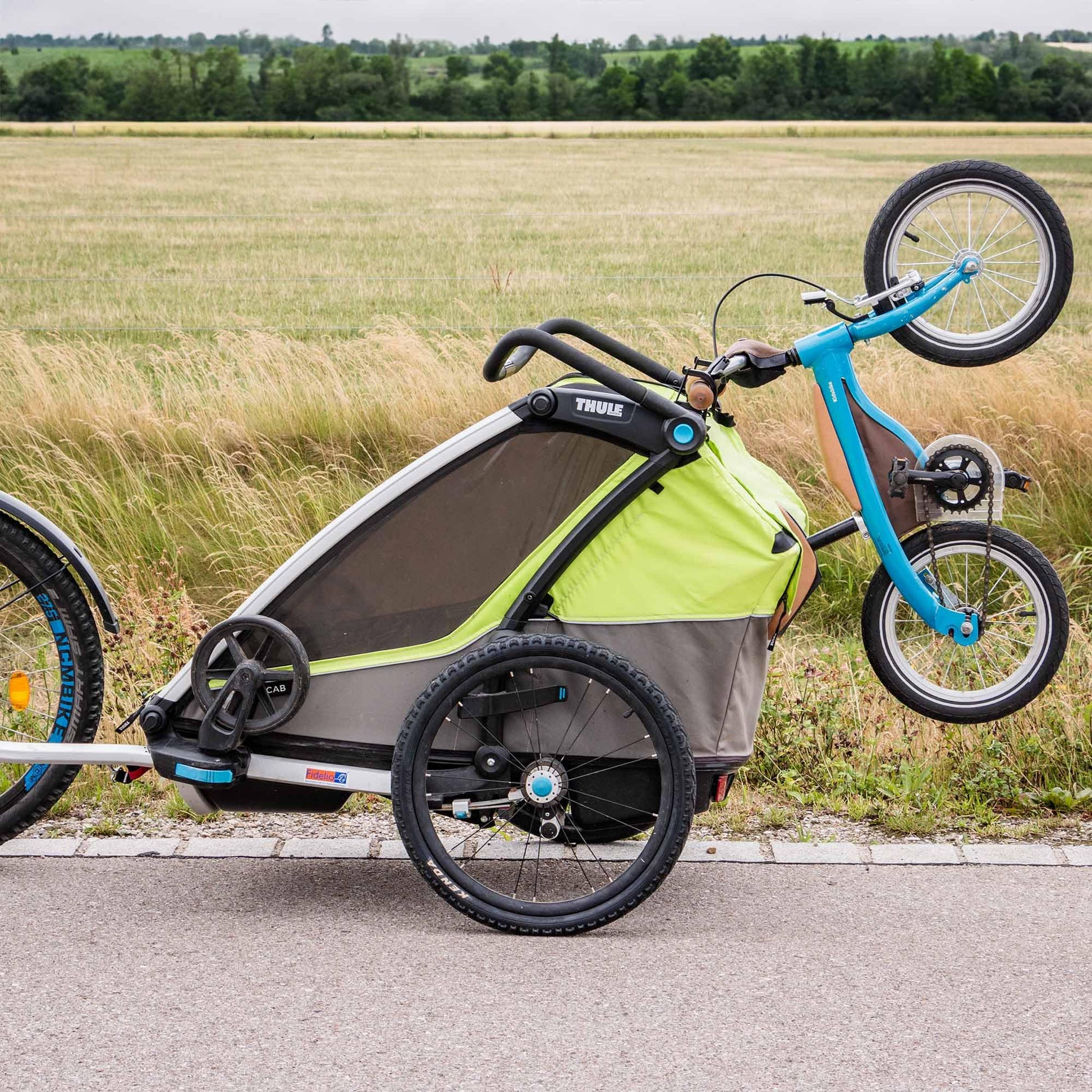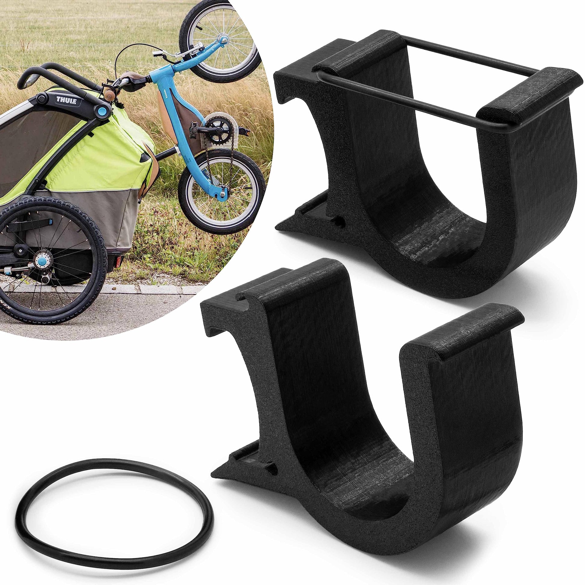["Bicycle carrier suitable for Thule Chariot trailers | Simply attach the two bike carriers to your bike trailer, hang the child's bike, balance bike, or scooter, and lock the safety bar","Compatible with all common Thule Chariot bike trailers | Made in Germany | Note: Thule Chariot trailer is not included","Please note: Up to 14 inch wheels fit all Thule Chariot trailers / 16 inch wheels usually only fit the Thule Chariot Cab","Technical details: Item dimensions (LxWxH): 100x70x30mm | Weight: 95g | Color: Black | Material: Plastic | Load capacity: max. 8kg","Scope of delivery: 1x 2 pieces Bike carrier wheel for Thule Chariot trailer Black"]