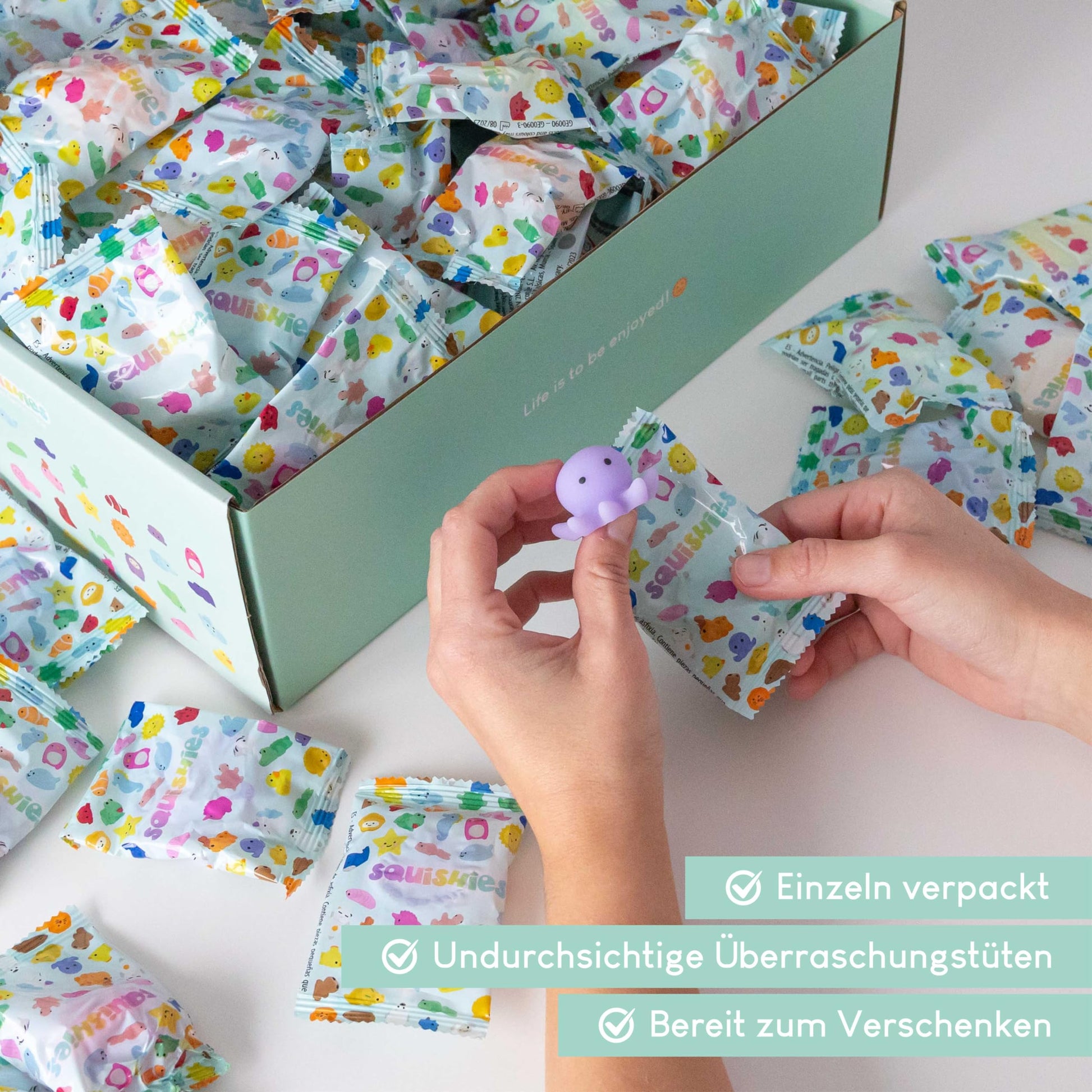 ["π¦ PACK OF 160 SQUISHIES π¦ Pack of 160 mochi squishy set in individual bags, perfect as party favors for kids' birthdays. It includes a wide variety of animals, as well as dinosaurs, unicorns, suns, and stars. There are 160 squishies in total, with 40 double designs in two colors each. Ideal as gifts for girls, boys, and kids","π¦ SMALL GIFTS FOR KIDS π¦ These cute mini squishy toys are perfect as giveaways for kids' birthdays, pinata fillers for parties, boys' and girls' birthday gifts. They also work great as advent calendar fillers for kids, communion gifts, wedding kids' entertainment, Easter eggs, first day of school gifts, or raffle prizes for kids, Valentine's Day, gifts for children, and girls, and much more","π³ READY-TO-GO PARTY BAGS π³ This fidget toys set comes in individual bags, ready to be given to kids. The bags are opaque, making them great surprises for a kids' party. It will be super exciting to find out which mini gifts kids have received! Squishy squeeze toys for birthday party favors for kids","π LARGE REUSABLE TOYS π This set of squishy toys is perfect as party favors for kids' birthdays, prizes for students, or waiting room treats. In addition, the squishy toys can be washed with water and soap, and talcum powder can be applied to make them look like new. Kids will play with them like it's the first day! Ideal for birthdays and Christmas","π¦ SOFT TOUCH AND PLEASANT SCENT π¦ This squishy kids' toy and girls' toy is soft, smooth, cute, and non-sticky, your kids won't stop squeezing and playing with them. They are elastic, stretchy, and resistant to rough play. They smell good and have a relaxing function as anti-stress toys. Very original mochi squishy toys kawaii like crab, octopus, sloth... as toys for girls and boys","π CERTIFIED HANDY SQUISHIES π Girls' and boys' birthday party favors with the appropriate certificates, making them safe for children aged 3 and up. They are made of non-toxic TPR rubber. With these mini squishy toys for kids as party favors, children will be entertained safely and calmly for hours. Ideal as birthday party favors for boys or farewell gifts for students","π¦ 1 YEAR WARRANTY π¦ In the mochi squishy mellow party favors for kids' birthdays, we offer a 1-year warranty on all our products at no additional cost. Do not hesitate to contact us for any kind of problem, and we will provide you with a solution. We have great confidence in the quality of our products, and we will be there to help you with anything you need, customer satisfaction guaranteed to come first!"]
