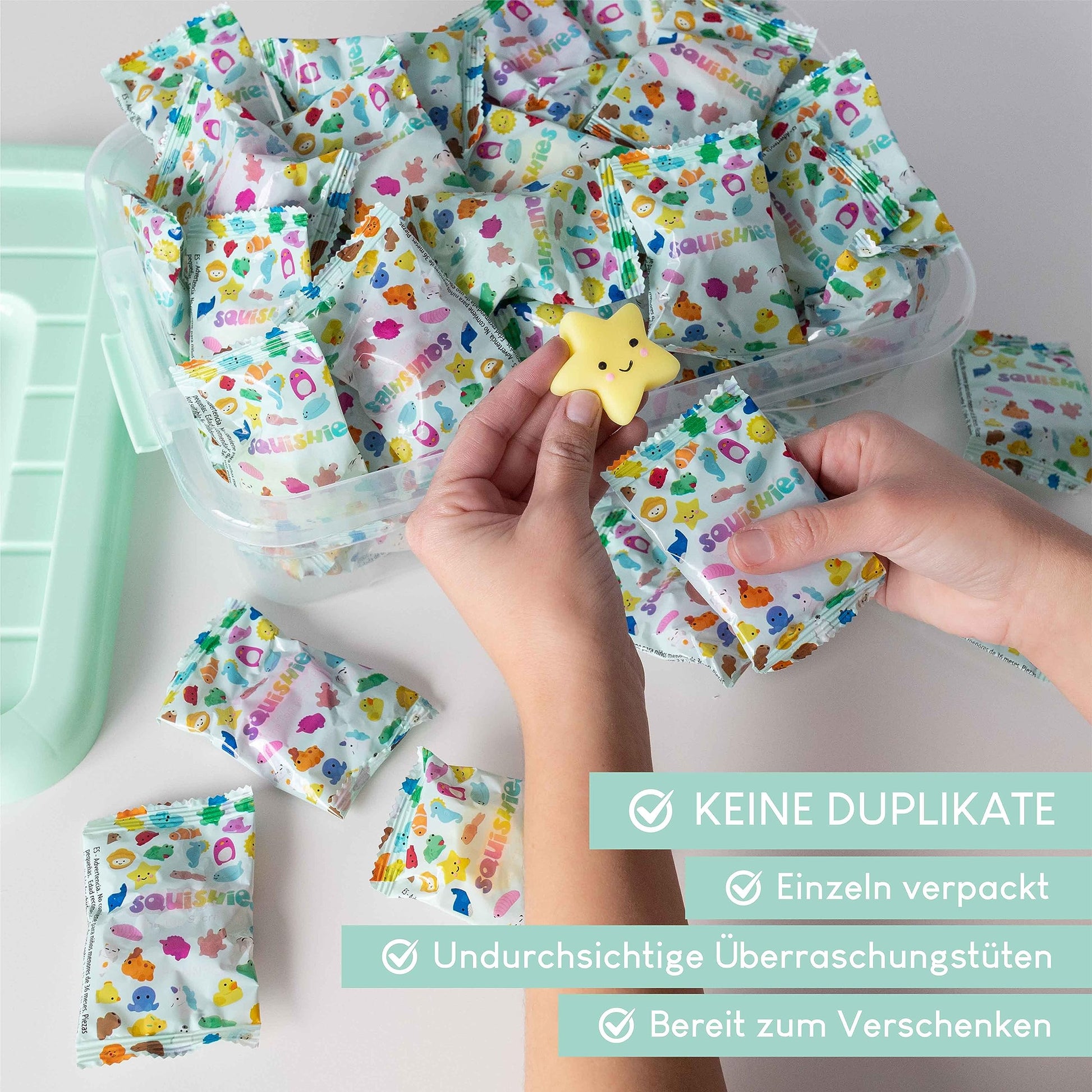 π¦ PACK OF 80 SQUISHY NO DUPLICATES π¦ These 80 different mochi squishy set in individual bags are perfect as party favors for kids birthday guests gifts birthdays. It includes a wide variety of animals, but also dinosaurs, unicorns, suns, and stars. There are no duplicates, but 40 squishies, each in two colors. They come in a sturdy plastic box, ideal as gifts for girls, and kids gifts.