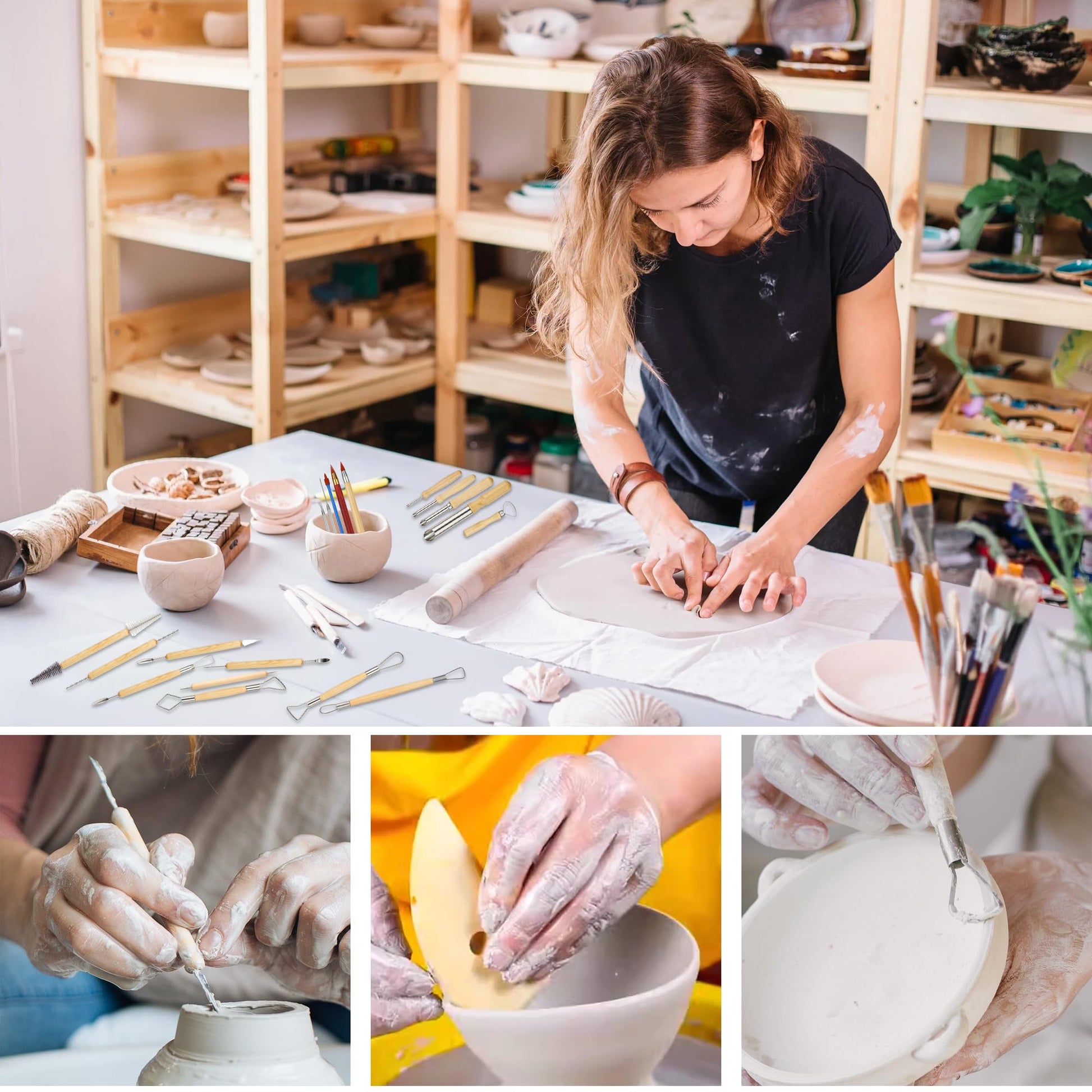 "🎨 【Versatile Application】: Our pottery tools are suitable not only for materials like polymer clay, air-dry clay, pottery, terracotta, ceramics, pottery wheel, and pottery goods but can also be used in various creative areas such as pottery at home, stamp carving, clay molding, painting, etc. Whether you are making pottery shapes or carving fine details, our sculpting tools can meet your needs.",