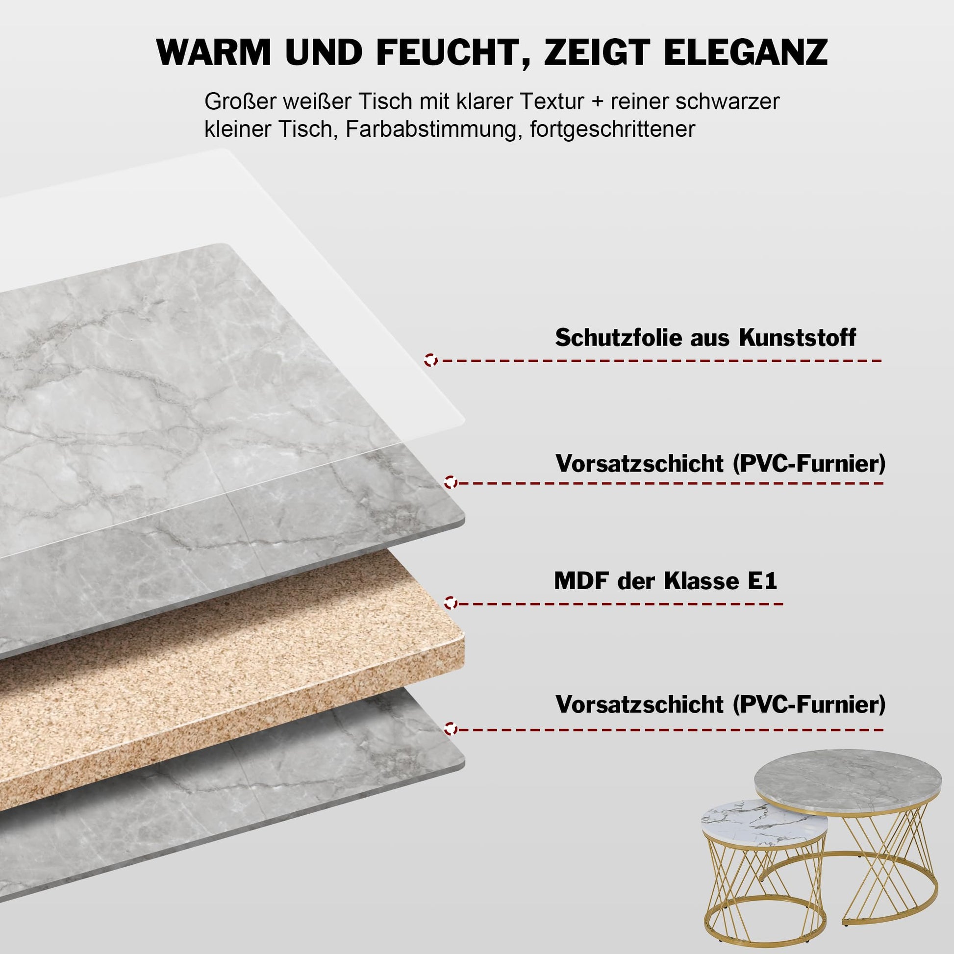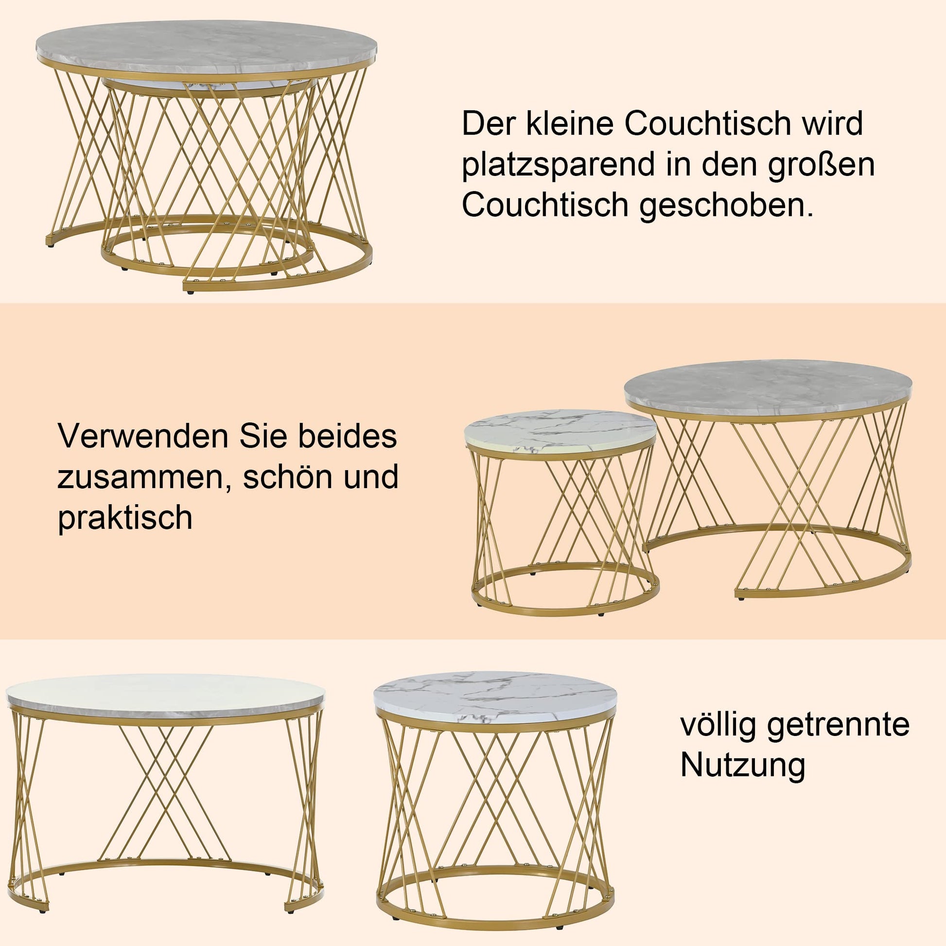 Modern Round Coffee Table Set of 2, Side Table Set, Coffee Table Set Marble Veneer Sofa Side Nest of Tables Round End Tables, Set of Tables for Living Room Bedroom, Gold Frame (White + Gray)