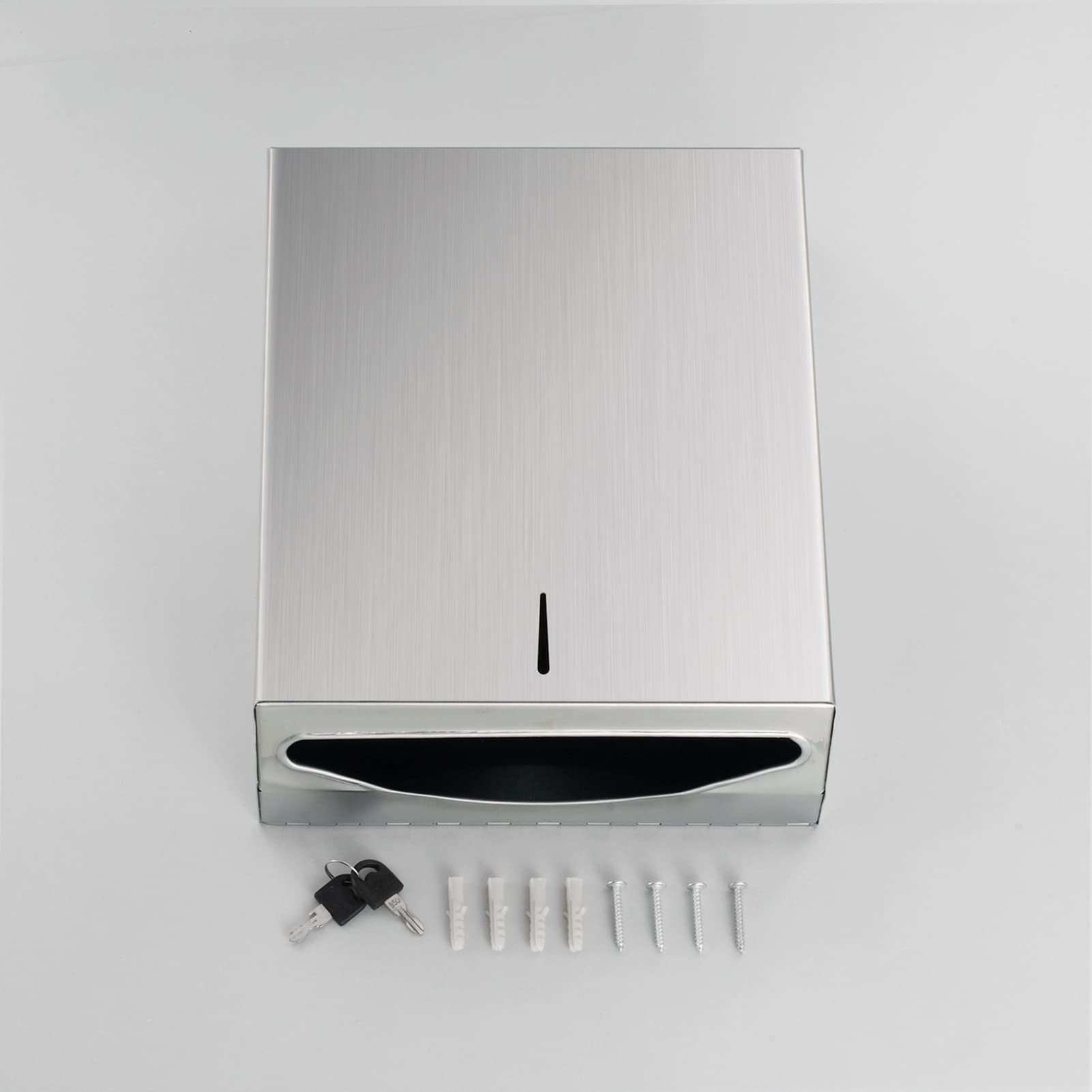 ["π Robust and Large Capacity: The paper towel dispenser is made of durable SUS304 food-grade stainless steel, rust and water resistant, large capacity for 500 folded paper towels, suitable for folded M/V/Z Fold paper towels that are less than 28 cm wide, ideally 25 cm (equivalent to the outlet length). Suitable for hotels, supermarkets, and most other occasions.","π Easy to Use Design: A visible window on the front allows for timely refill of paper towels. The lockable design prevents damage and dust from entering the interior of the paper towel dispenser. You don't need to touch it to keep it clean.","π Easy to Install: Only takes a few minutes to install, very convenient, and the paper towel dispenser wall mount is compact, space-saving for you, easy to clean.","π Curved Outlet Design: Stainless steel tissue holder curved outlet facilitates smooth pulling of paper towels and prevents them from getting stuck, reducing waste and preventing tearing. Smooth exterior of the paper towel dispenser prevents scratching of hands.","π OUR SUPPORT: Our products are guaranteed for 2 years. Whatever issue you may have, we are always here for you within 12 hours. Package includes: 1 X wall-mounted paper towel dispenser (paper not included), 1 X key, 1 X mounting kit."]