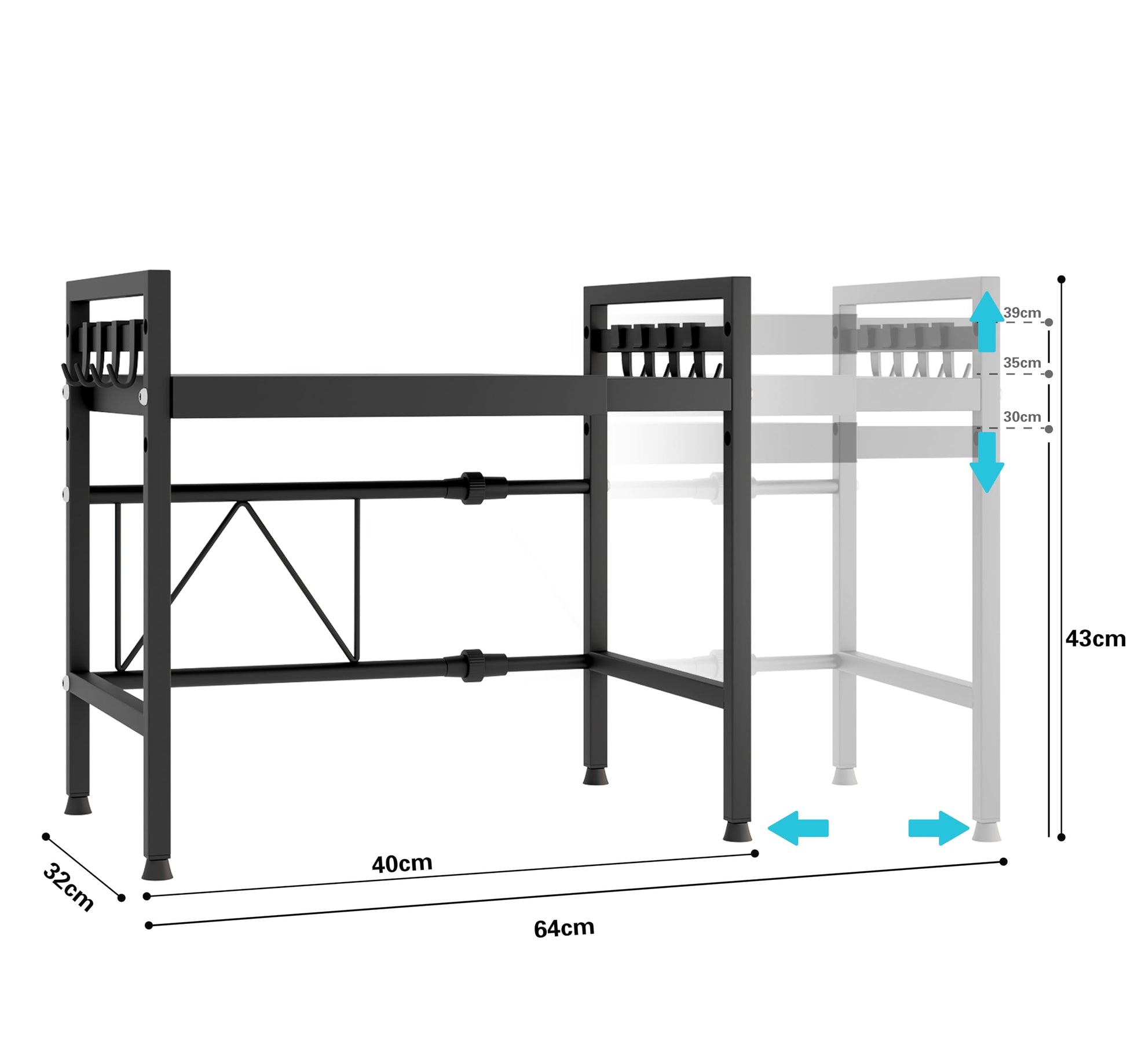 Mointal Adjustable Microwave Shelf, 2-Tier Expandable Kitchen Microwave Stand Rack, Carbon Steel Microwave Holder, Kitchen Storage Organizer with 8 Hooks, Black