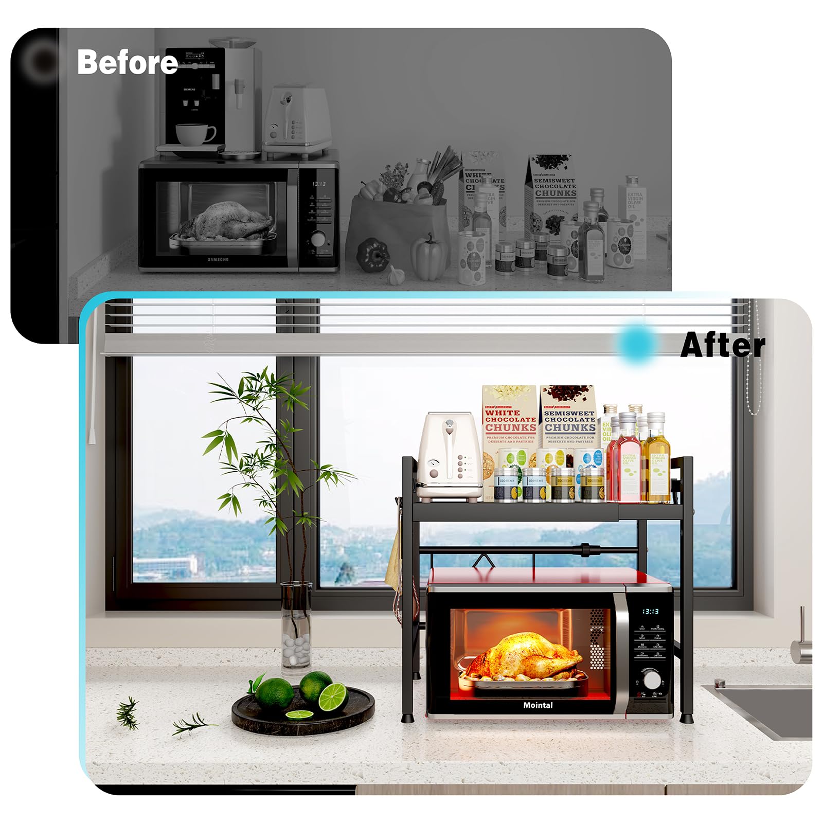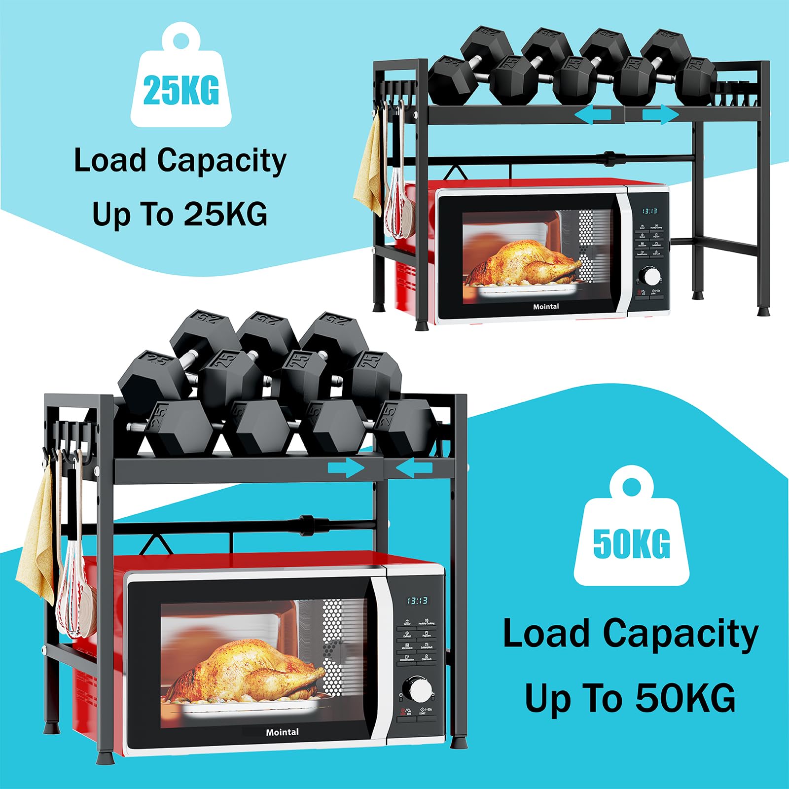 "➡️【Adjustable Size】The Mointal microwave shelf can be adjusted in length and height according to your needs, making it suitable for different sizes of microwaves and other kitchen appliances, "➡️【Stability and Durability】The kitchen shelf is made of sturdy carbon steel, providing stability and rust resistance. It can hold up to 50 kg evenly to ensure safe storage, "➡️【Thoughtful Design】Even on uneven countertops, the microwave stand remains balanced and strong with its 4 adjustable feet. It also comes with 8 hooks to hang small kitchen utensils and create additional storage space in the kitchen, "➡️【Versatile Use】The Mointal storage rack is not only suitable for the kitchen, but can also be used in other rooms or office spaces, providing practical and stylish storage solutions, "➡️【Easy Installation】All necessary tools are included. It is easy to assemble and does not require drilling. You only need to screw in a total of 8 screws"