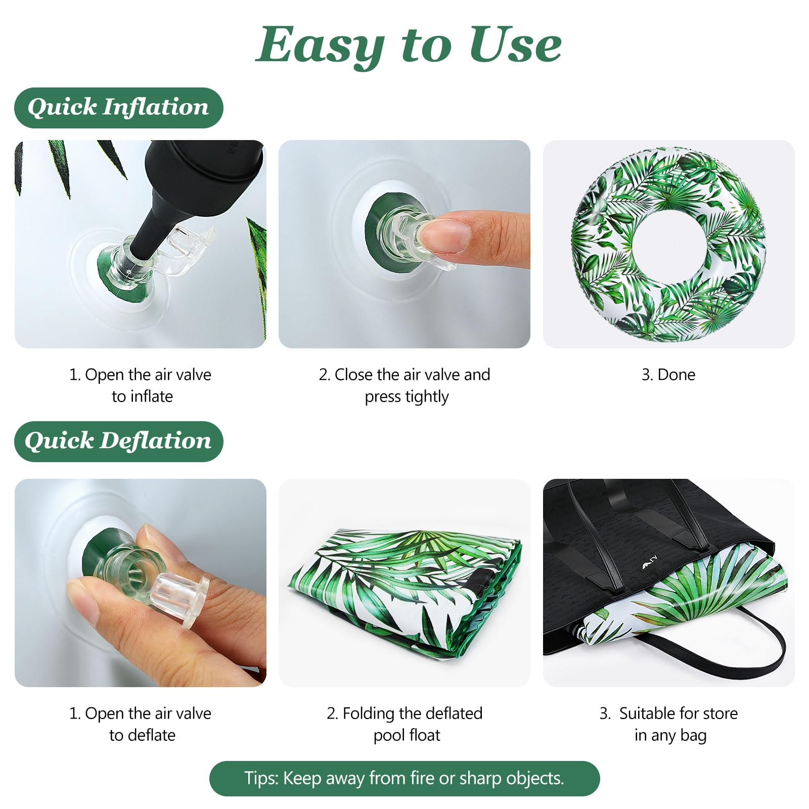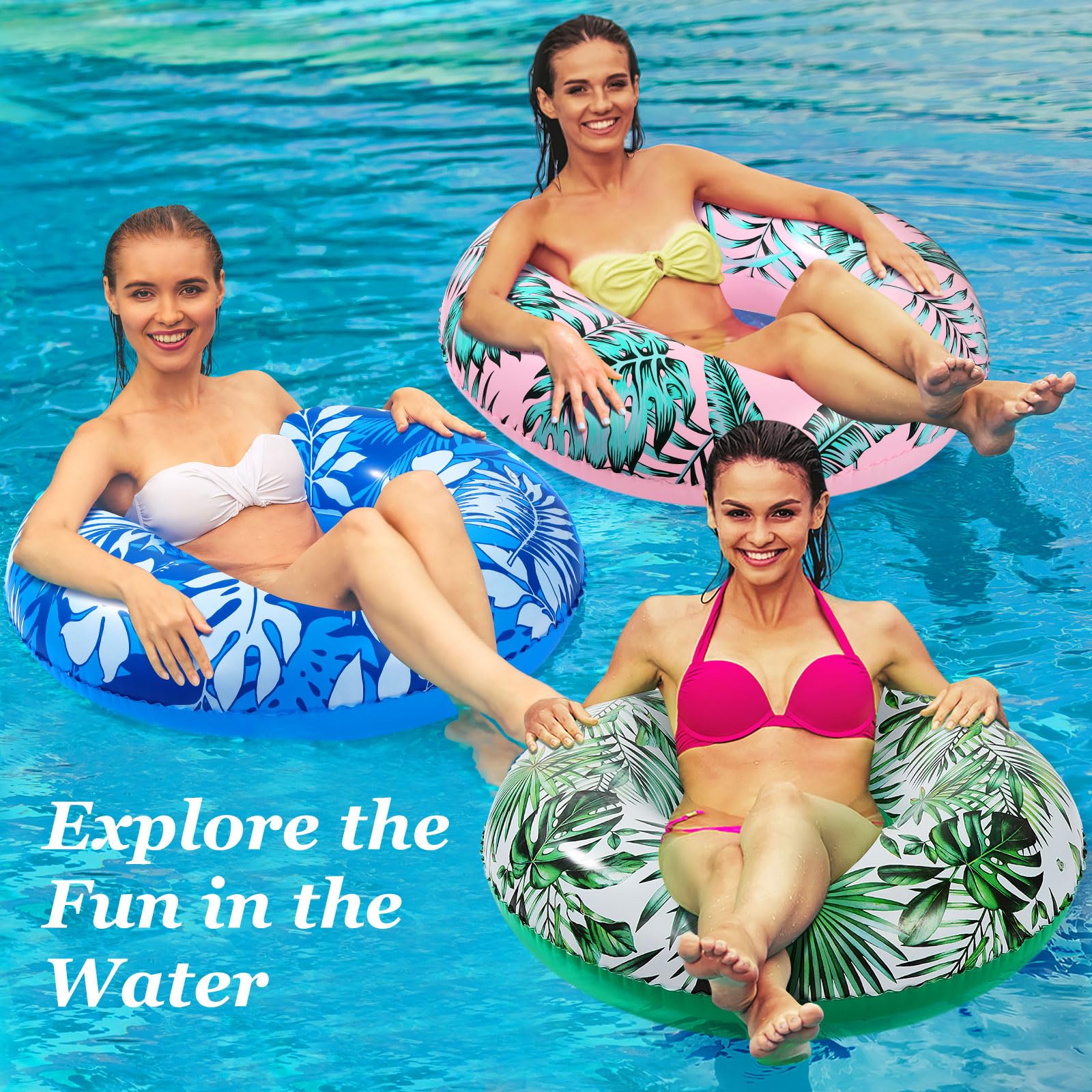 ["【Thick Material】The swim ring is made of high-quality, thick PVC that is durable and not easily broken. It stays inflated in the pool to ensure your safety while playing in the water.","【Interesting Design】Vibrant colors to brighten your summer days. The realistic leaf pattern gives the feeling of sunbathing in the forest. Comes with a water toy tube. Enjoy the summer!","【Perfect Size】Outer diameter is 107 cm/42 inches and inner diameter is 42 cm/16.5 inches. Weight capacity is 100 kg/220 lbs, suitable for adults. This large swim ring can provide stable support.","【Easy to Use】Equipped with an airtight valve that is easy to inflate, you'll quickly get a fun "plant" pool toy. Easy to deflate and easily fit into your suitcase, beach bag, etc.","【Wide Application】Bring this cute pool water toy to your family and friends and start the wonderful summer. Suitable for indoor and outdoor pools, beaches, lakes, etc."]