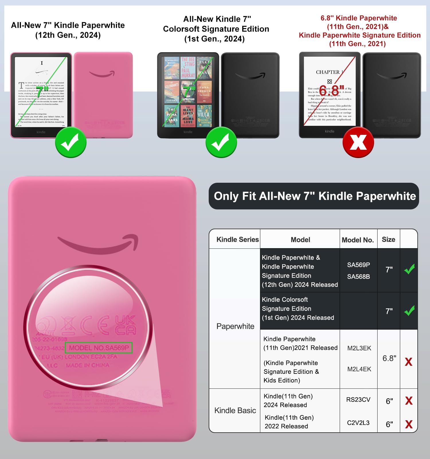 ["Compatibility: Compatible with 7" Kindle Paperwhite (12th Generation) - 2024 and Kindle Colorsoft Signature Edition (1st Generation).","Full Protection: The soft TPU cover can prevent scratches and other damages. With the four reinforced corners, the device is perfectly protected against drops.","Precise Cutouts: It allows easy access to all functions. With the protective cover, you can access all functions without the need to remove the cover. All buttons, ports, speakers, and camera openings are easily accessible.","Beautiful Craftsmanship: The cover looks elegantly understated and feels pleasant to the touch. The buttons are well protected without being accidentally pressed. Ports and cameras can still be fully utilized.","Clear Design: The transparent back showcases the tablet's design clearly. The case is also ultra-thin and lightweight, allowing you to comfortably hold the device without adding unnecessary bulk."]