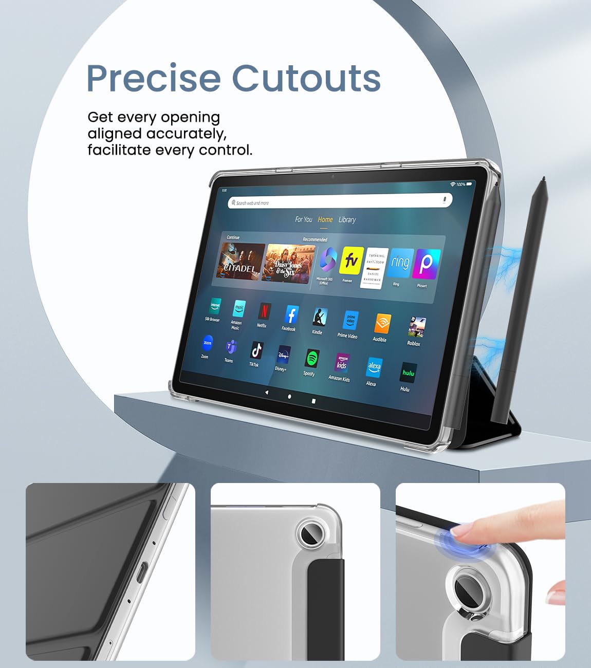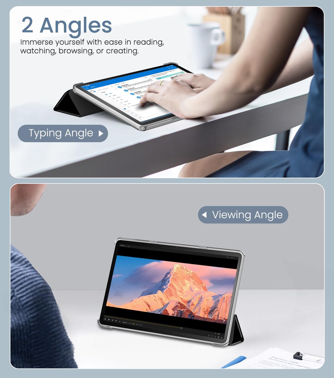 Two Angles: The adjustable stand offers a video viewing position of 60° and a typing position of 30° to meet your needs for the Amazon Fire 11 tablet. You have hands-free for other recreational activities.