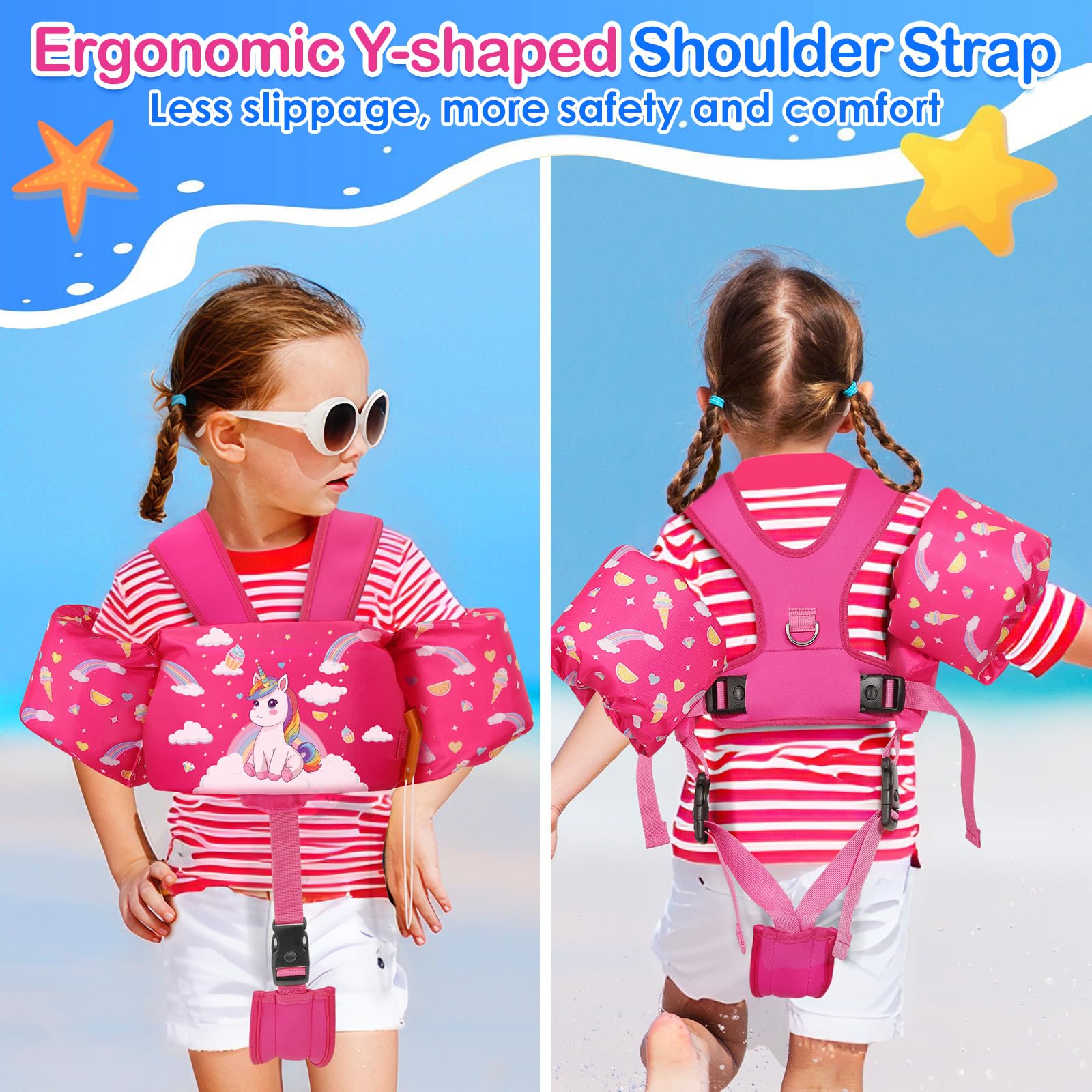MoKo children's arm floats, toddler swim vest, swimsuit with adjustable strap, swim jacket water wings pool float, sea swimming aid for water sports learning swimming accessories, pink unicorn.